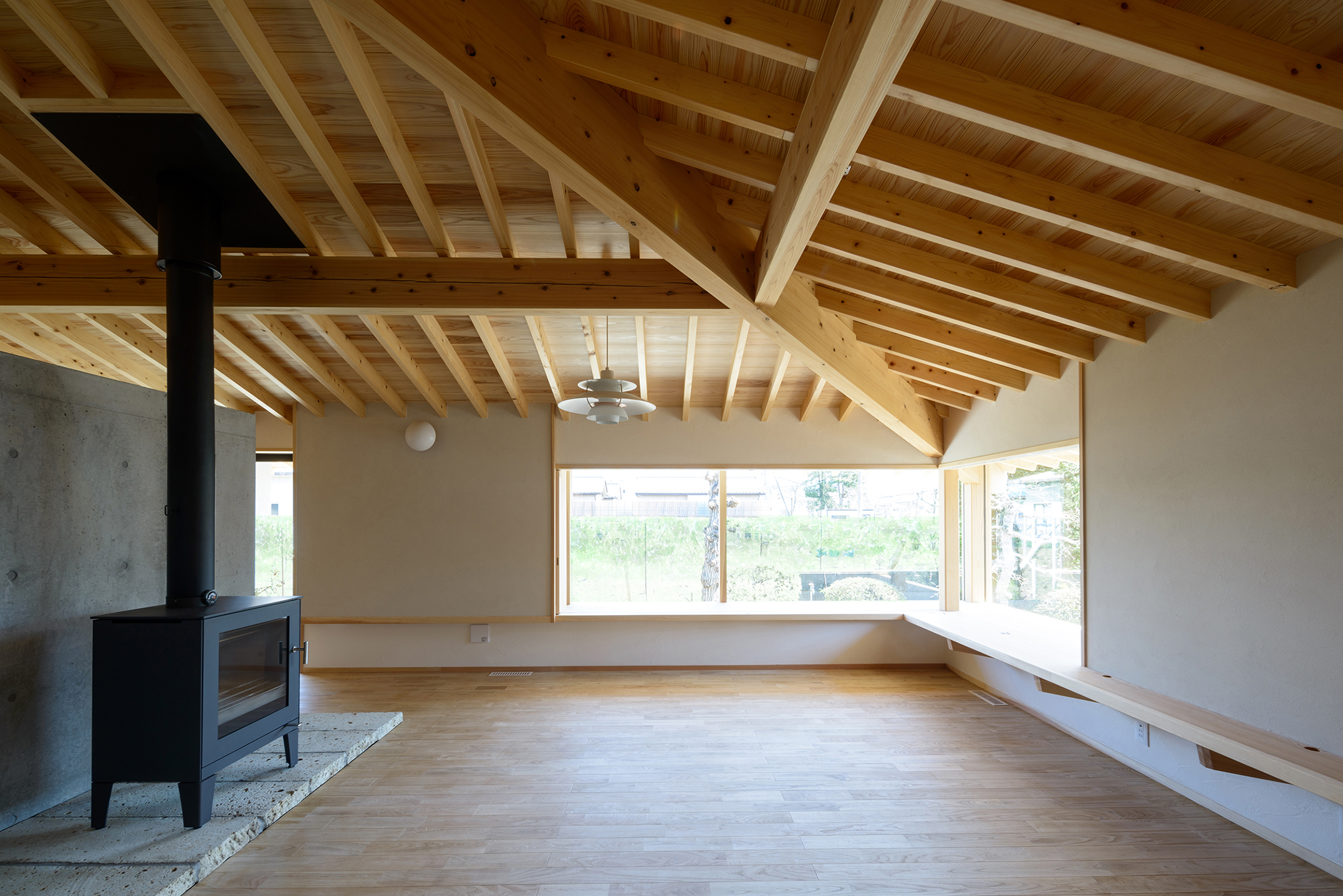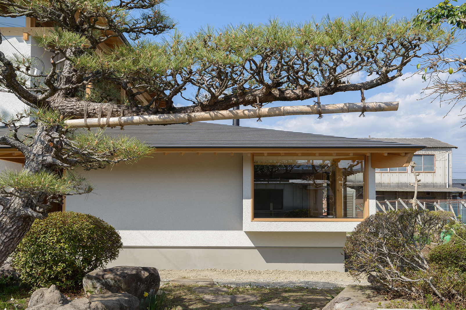 葡萄農家である祖母のための住宅。葡萄畑に隣接した敷地で、出窓を介して風景が連続する住宅を目指した。畑の棚柱や梁といった野太い線架構をモチーフに住宅の骨格(柱・梁)を構成しながらも、間接光による柔らかな明るさをもった生活空間となっている。内部では@300の垂木現しとすることで繊細な住空間を実現。
