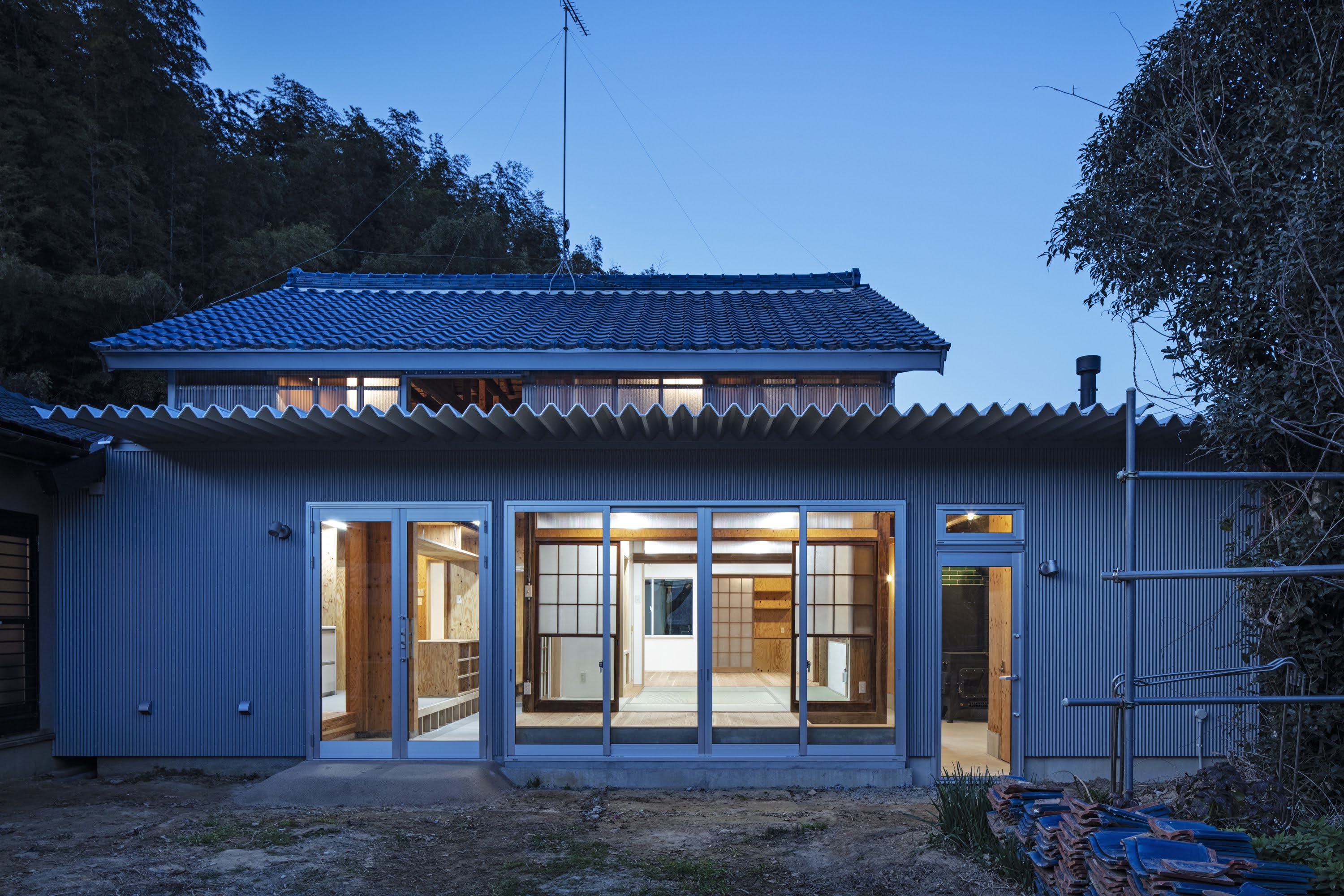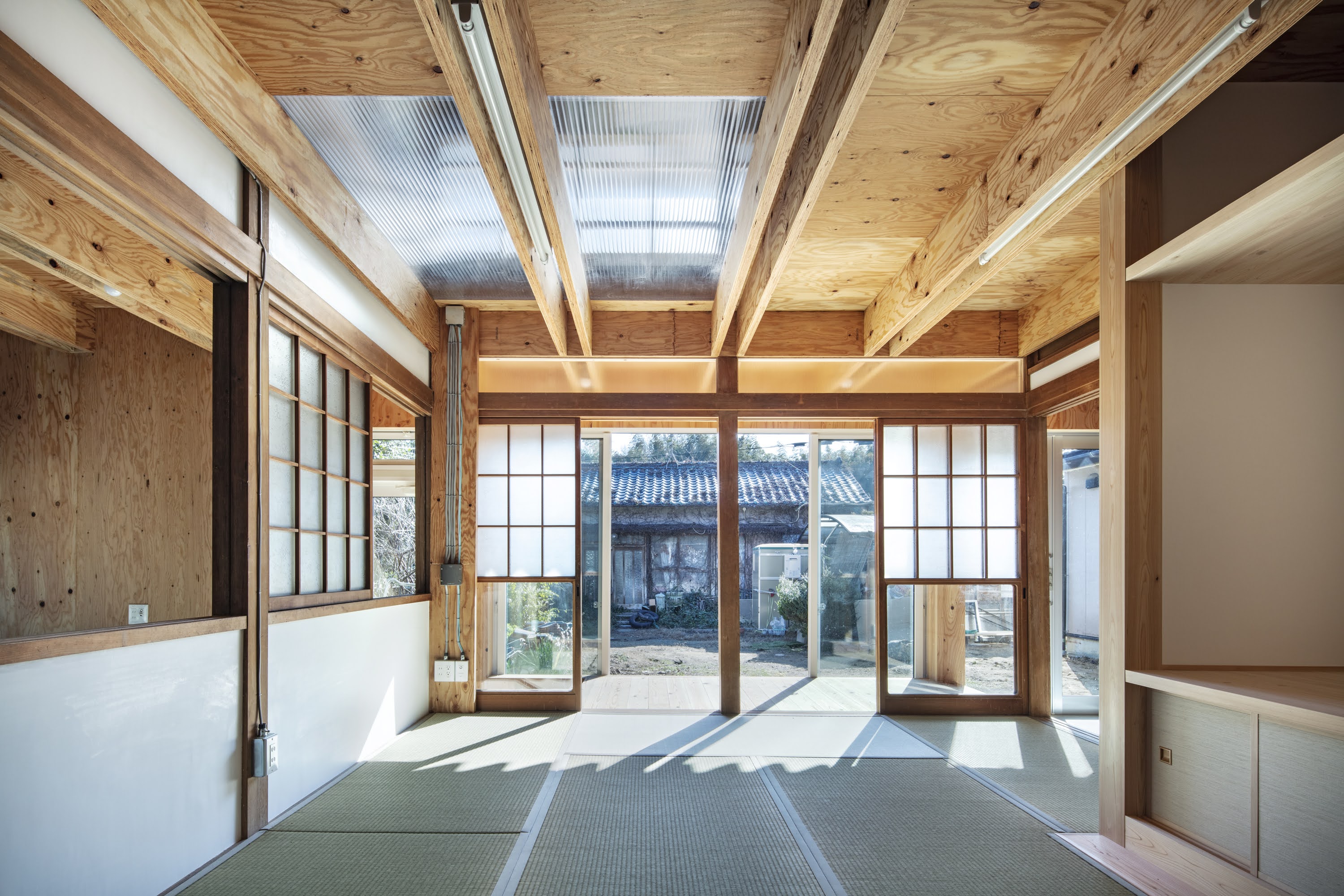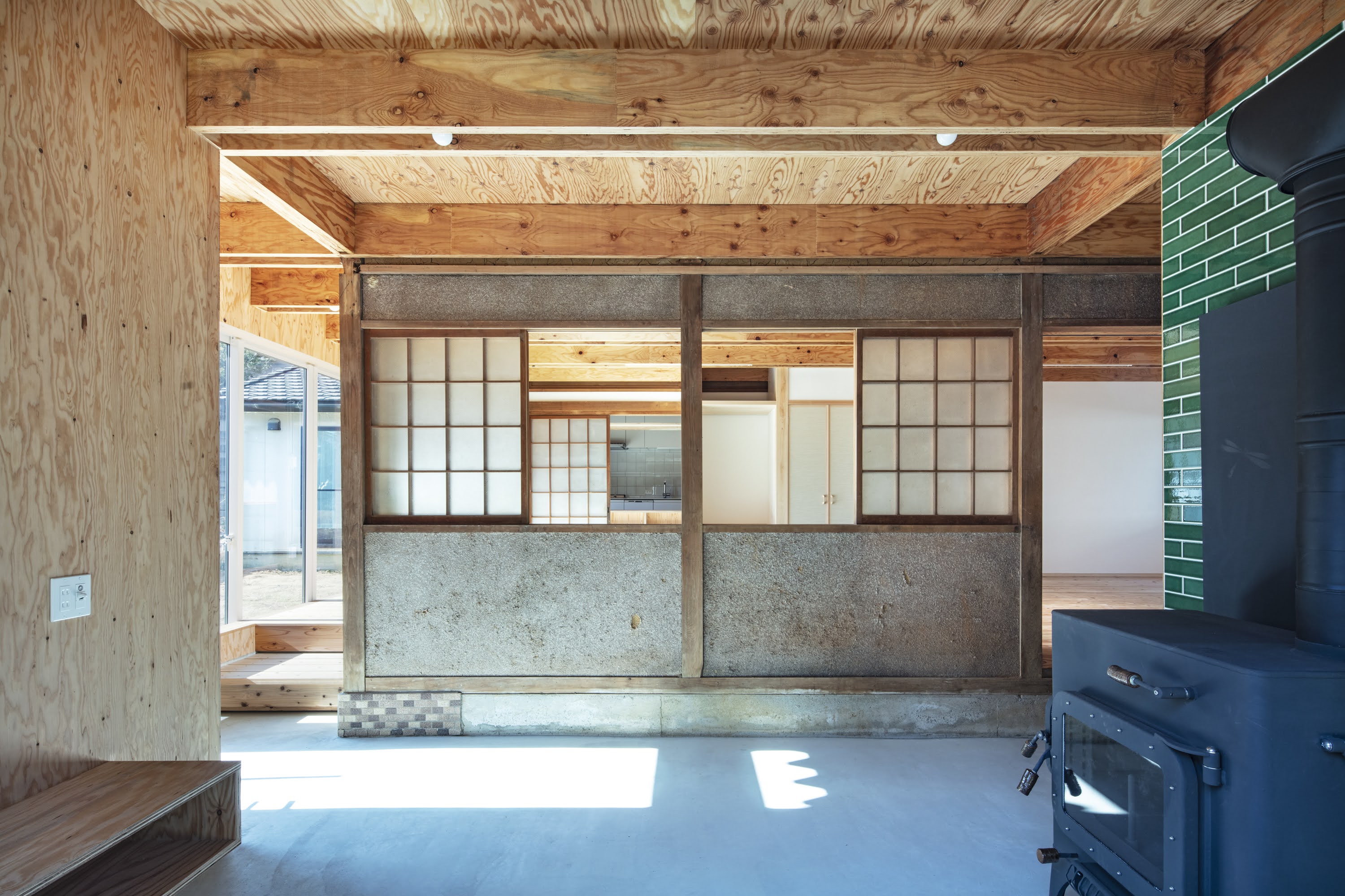 築50年の農家住宅を2世帯住宅へと改修した。水廻りを中心に設けた耐震コアを、既存柱を合せ梁で挟みこんで構成した「剛な天井(水平構面)」で繋ぎ、既存部材を最大限に残す耐震補強方法を考えた。古い木材と新しい木材の組合せからなる「剛な天井」に、断熱・防水性能を持たせることで住宅性能を大幅に向上させた。
