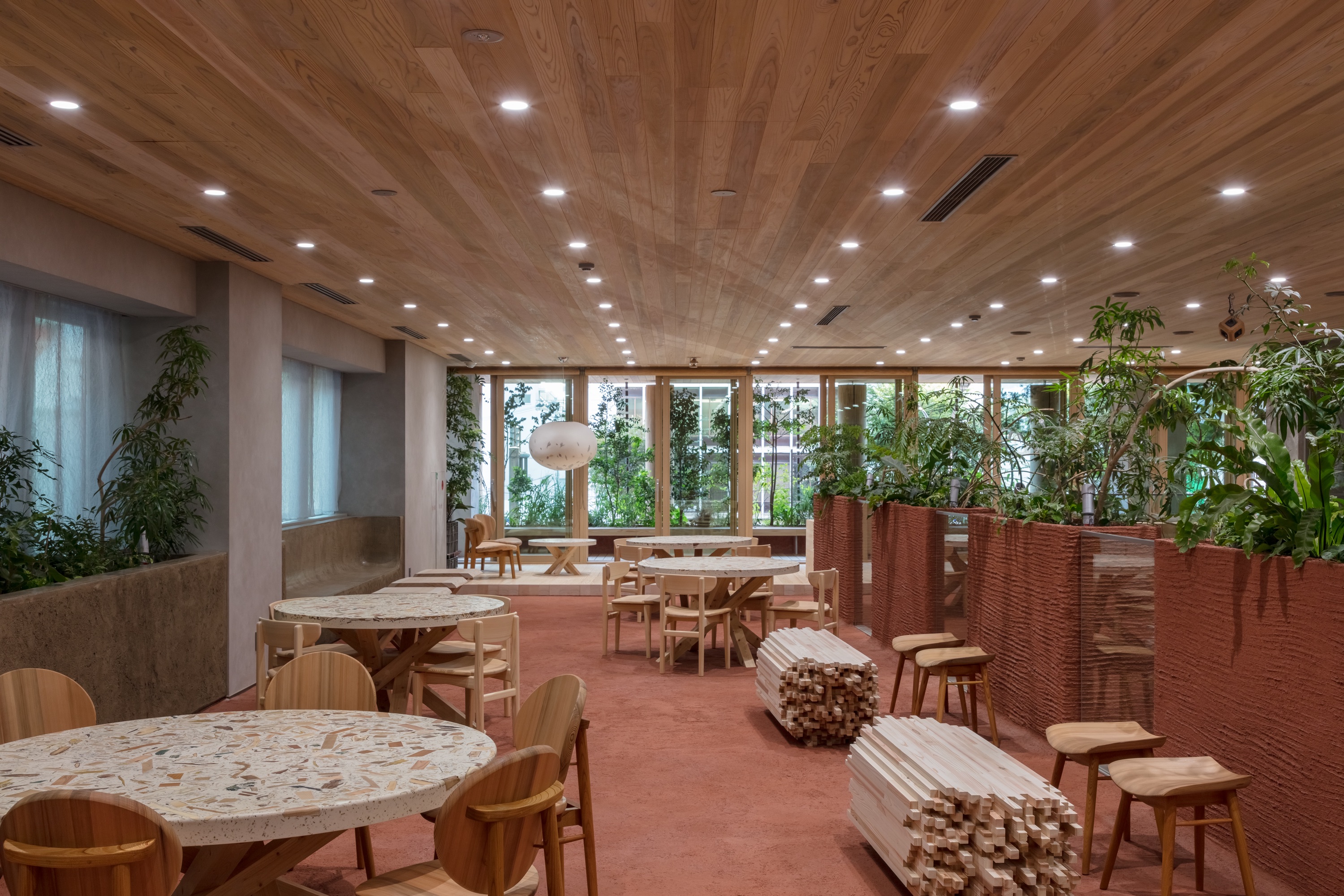ファサードの樹齢130年の吉野杉の丸太は取り外し可能になっており、自然乾燥させることで次に活用することを想定しているという。都市の貯木場たるコンセプトを見事に実践している。