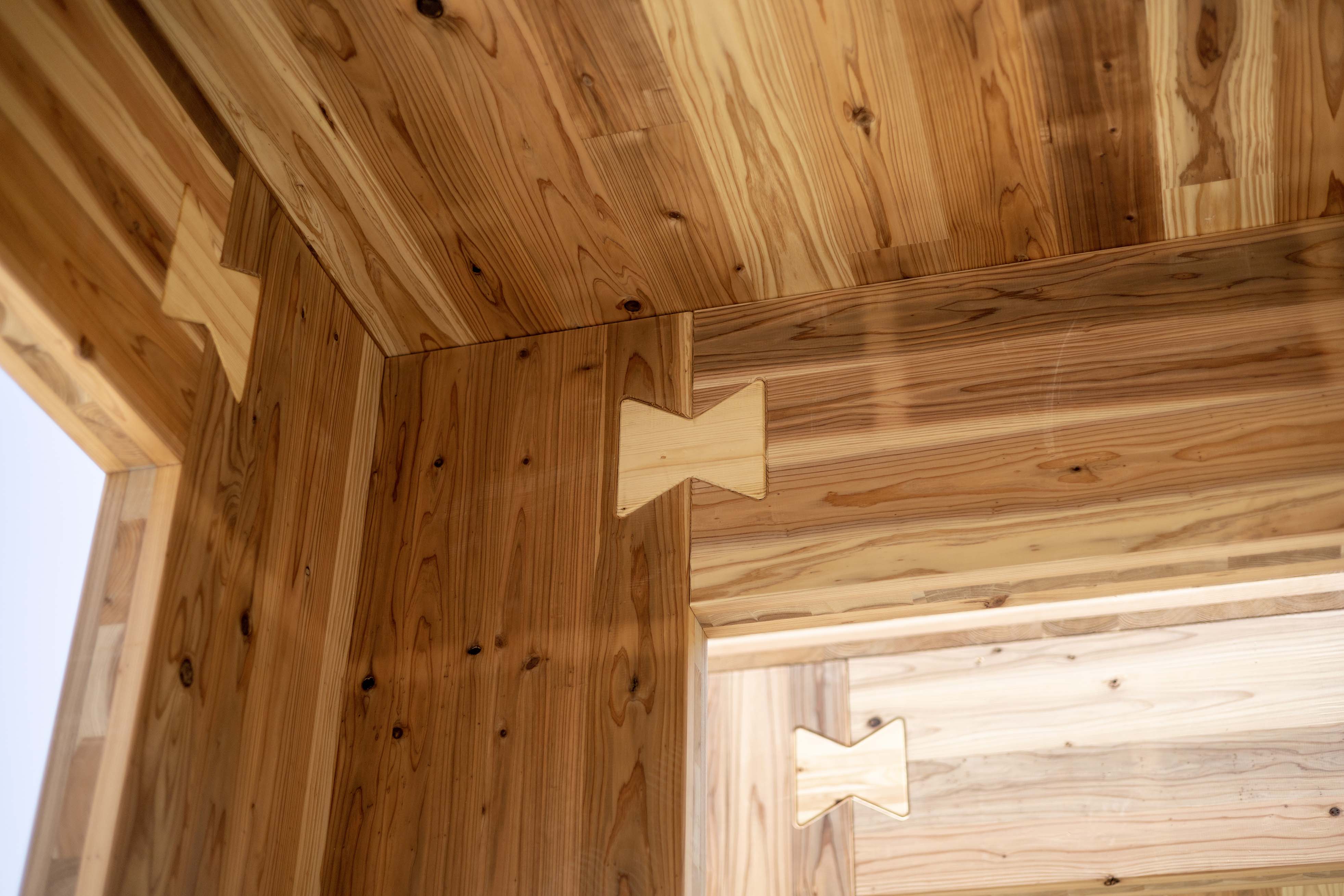 国産CLT材を日本伝統技術「蝶蟻」で接合した新たな木造工法によってつくられた箱型木製ユニットです。 日本の宮大工の高度な技術によって作られた箱型の構造体は誰でも、どこでも、容易につくることができる新しい建築構造体です。 短工期・強耐性といった特徴を生かして様々な建築物に使用することが期待されます。