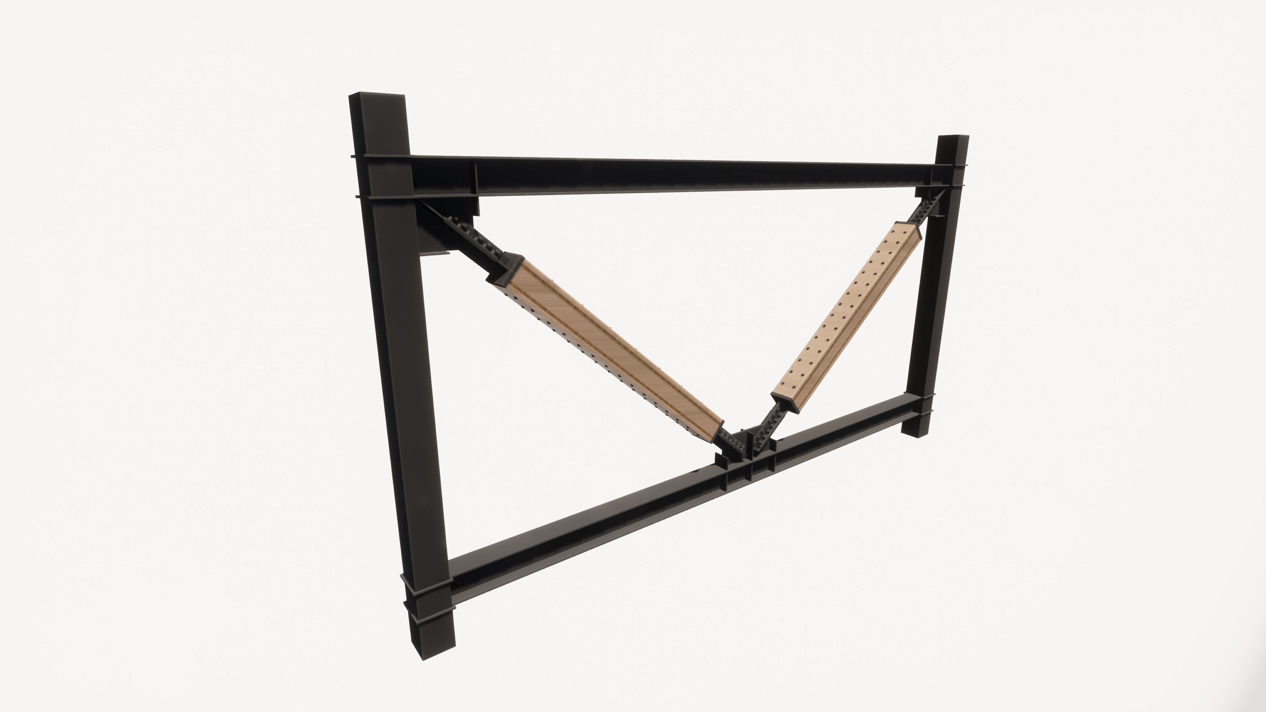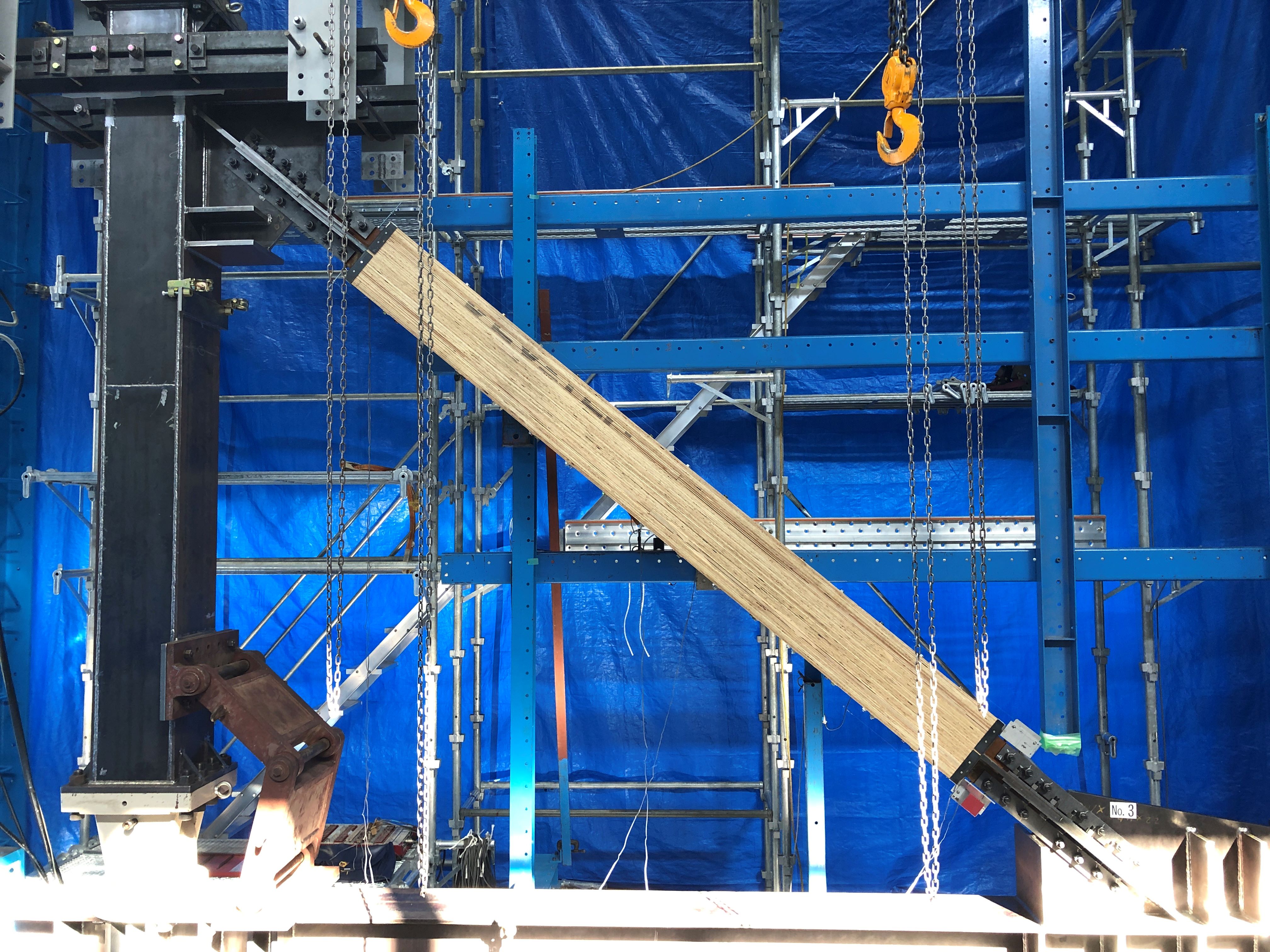 KS木質座屈拘束ブレースは拘束材に木質系材料を用いた座屈拘束ブレースです。鉄骨造等の建築物に木材をあらわしで使用することができ、空間に木質感を加えることが出来ます。また、一般的な鋼製耐震ブレースや座屈拘束ブレースと比べ製作時のGHG排出量が少なく、二酸化炭素を固定することも出来ます。