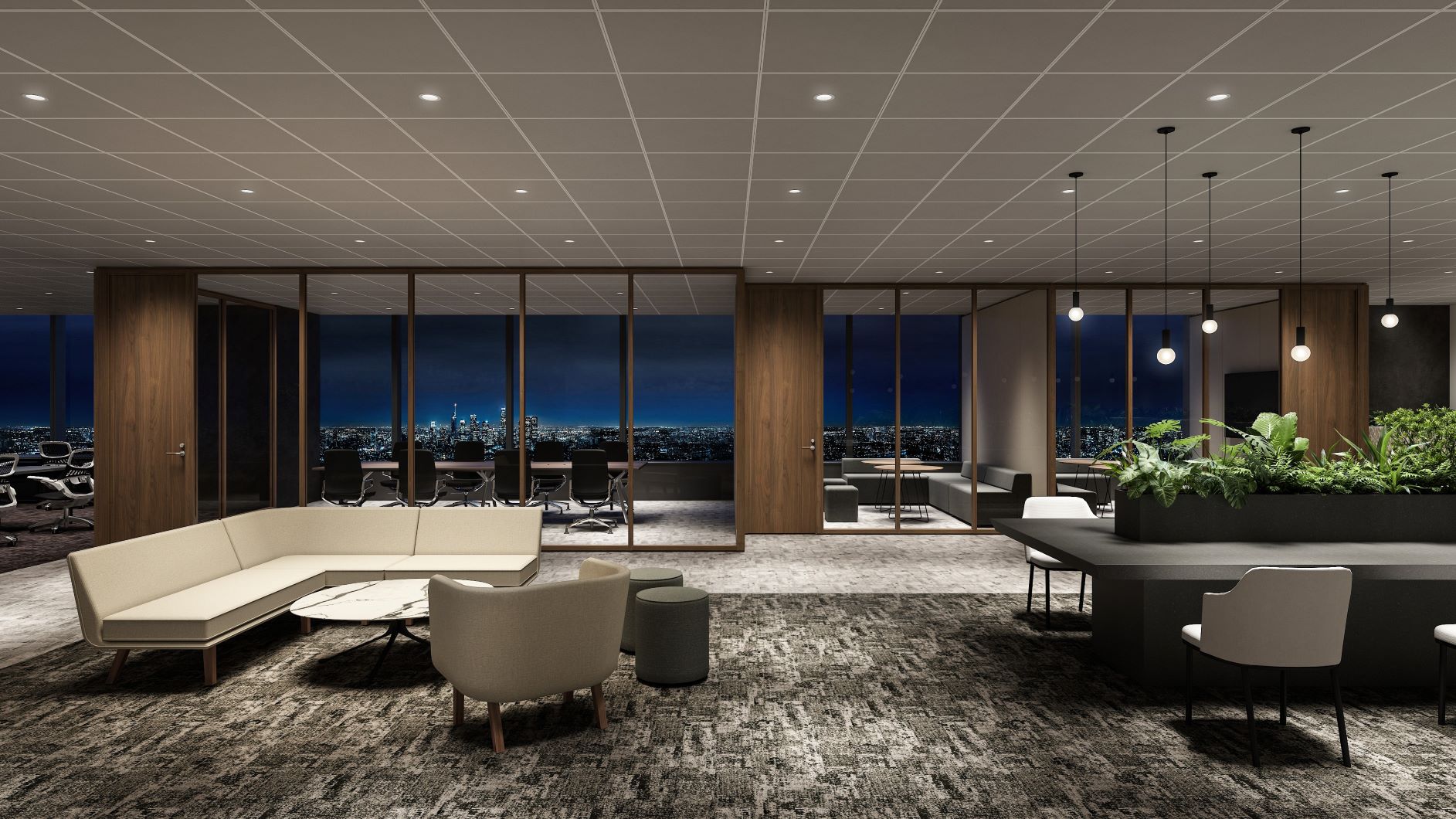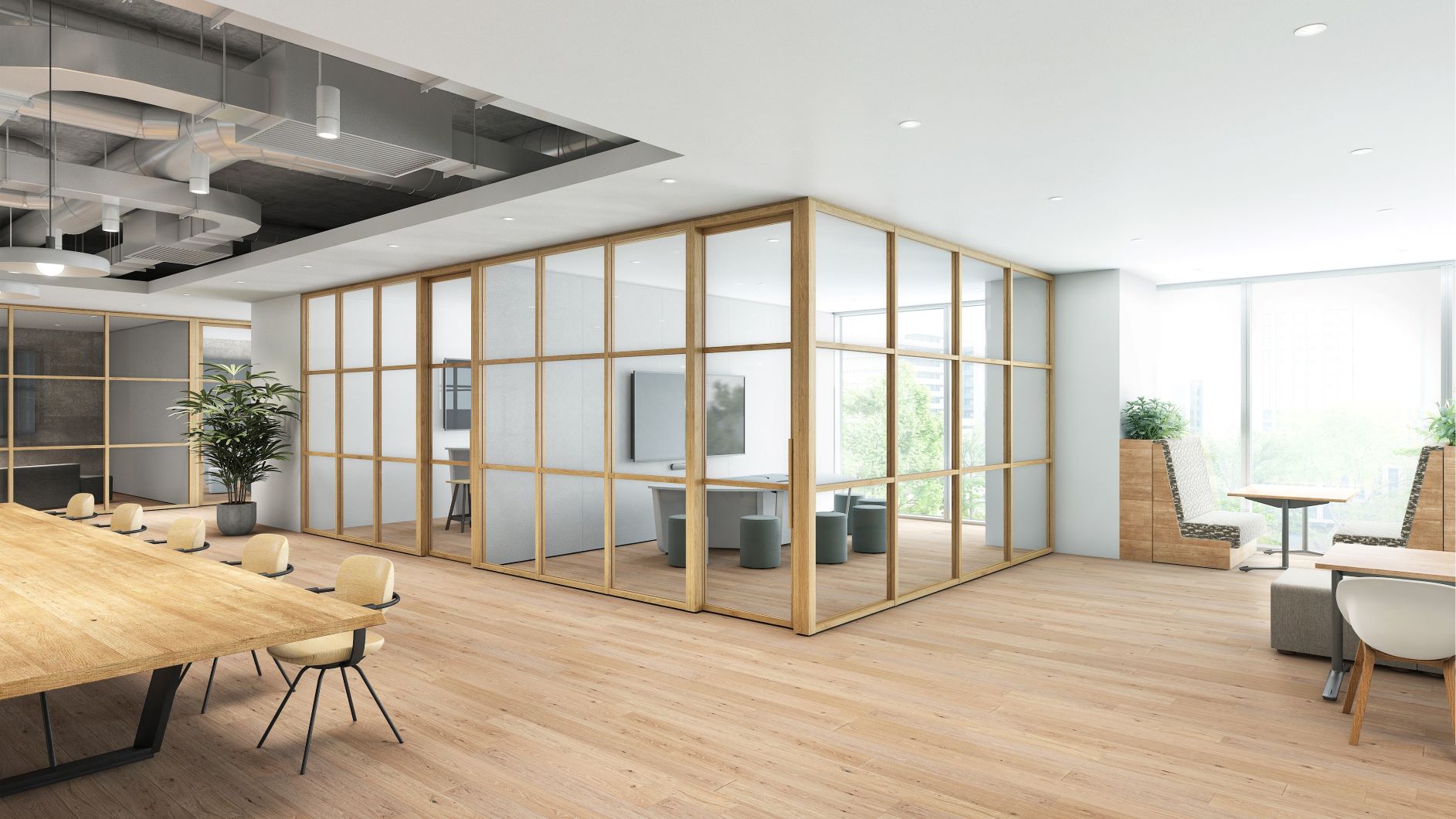 防耐火制限から無垢材を使いにくい内装においても、トータルデザインが高い木質空間が実現できる提案である。可動式の間仕切を使い分けることで用途に合わせてフレキシブルな対応ができる。