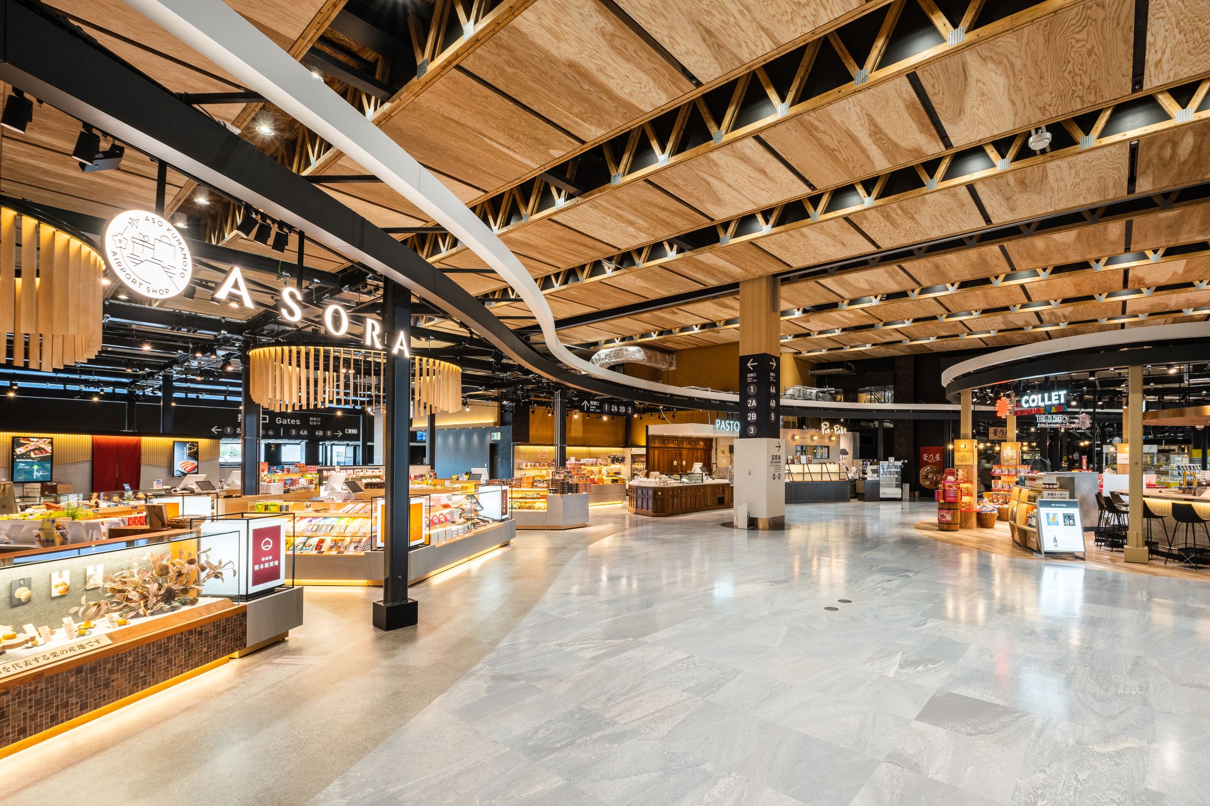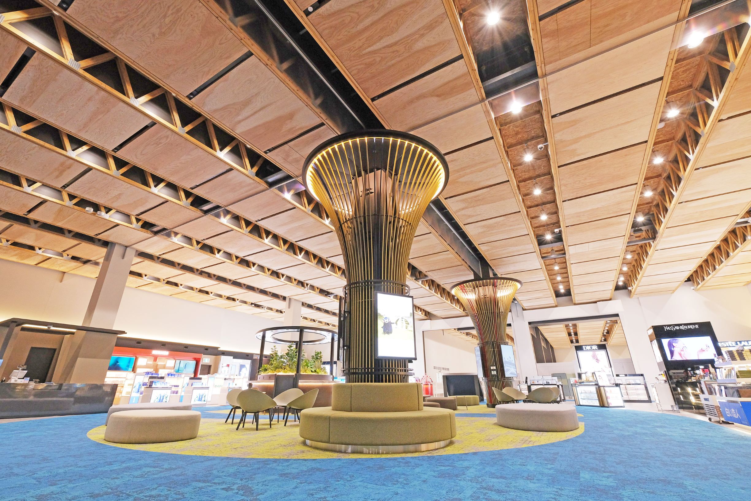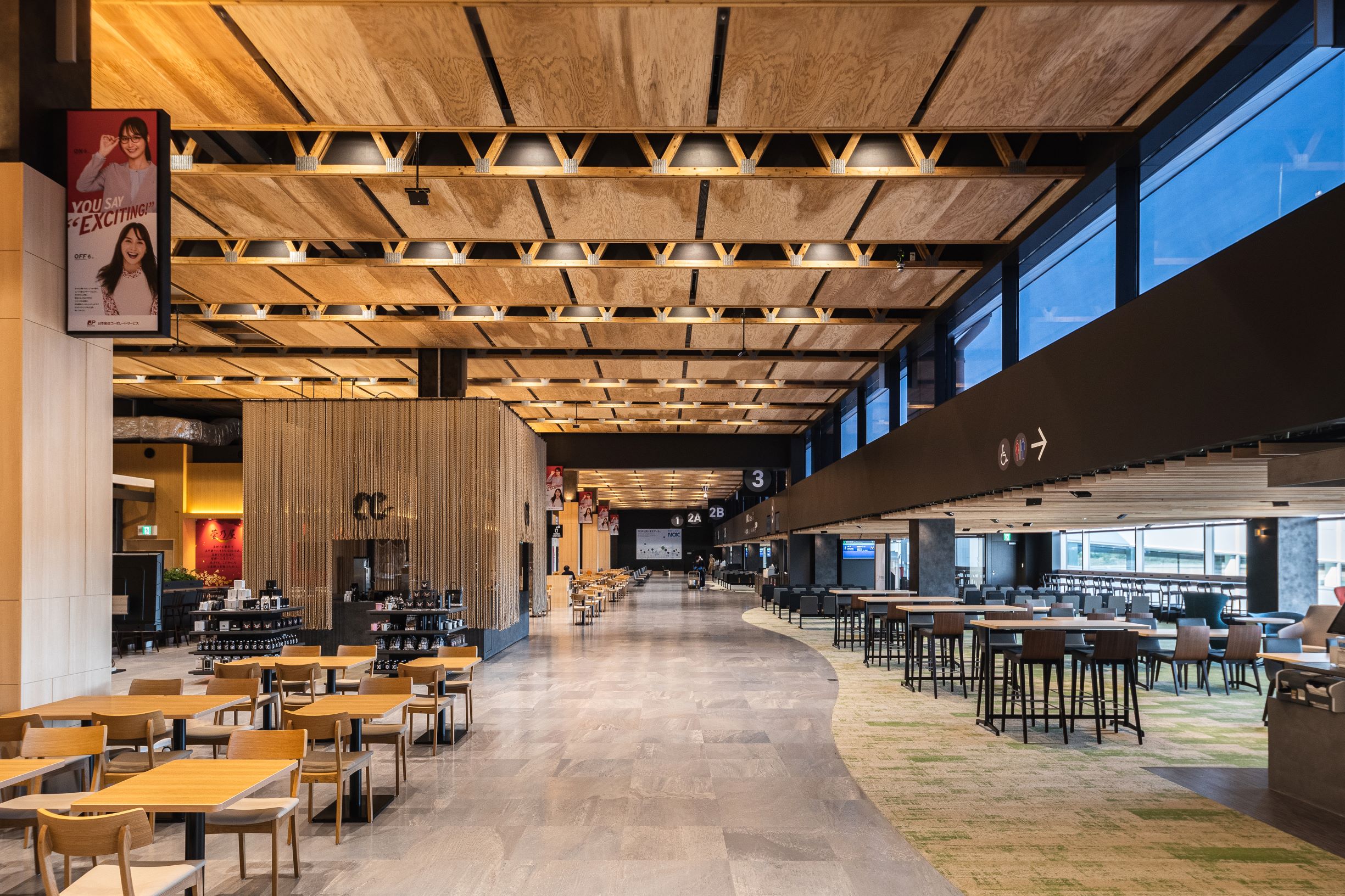 搭乗客の待合機能に留まらず、滞在することを目的とした、楽しめるターミナルを木材活用によって実現した。一般流通材を採用しながら、広さと快適性を満たした空間づくりに成功している。