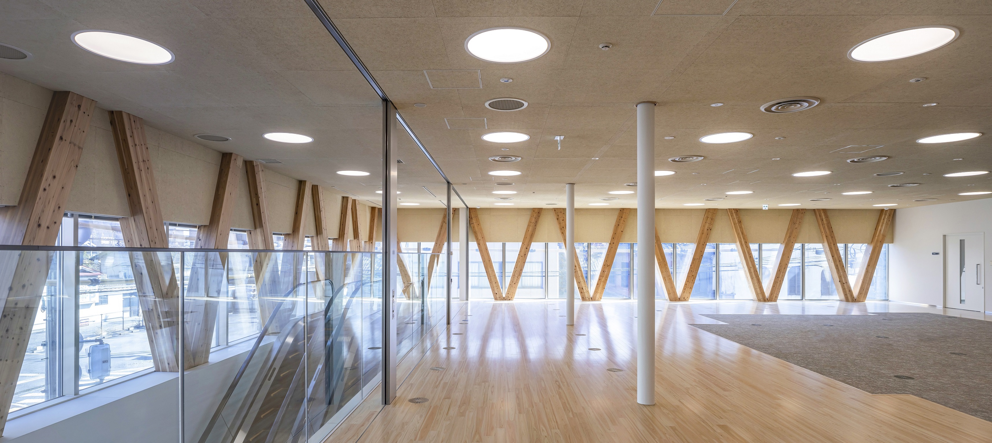 V字型に連続して配置された木柱が内外からも目を引く空間。意匠的には軽やかになり、採光や換気の面でもメリットがある。ZEB取得と木材利用による地域の環境対応のオフィスとして良質なモデル。
