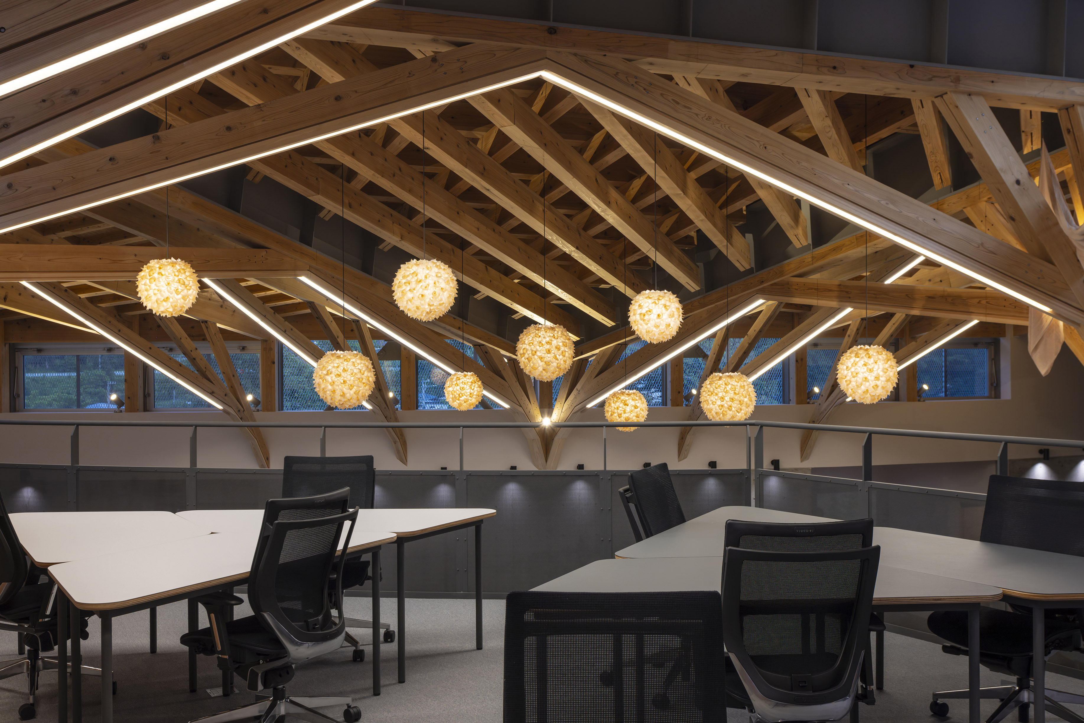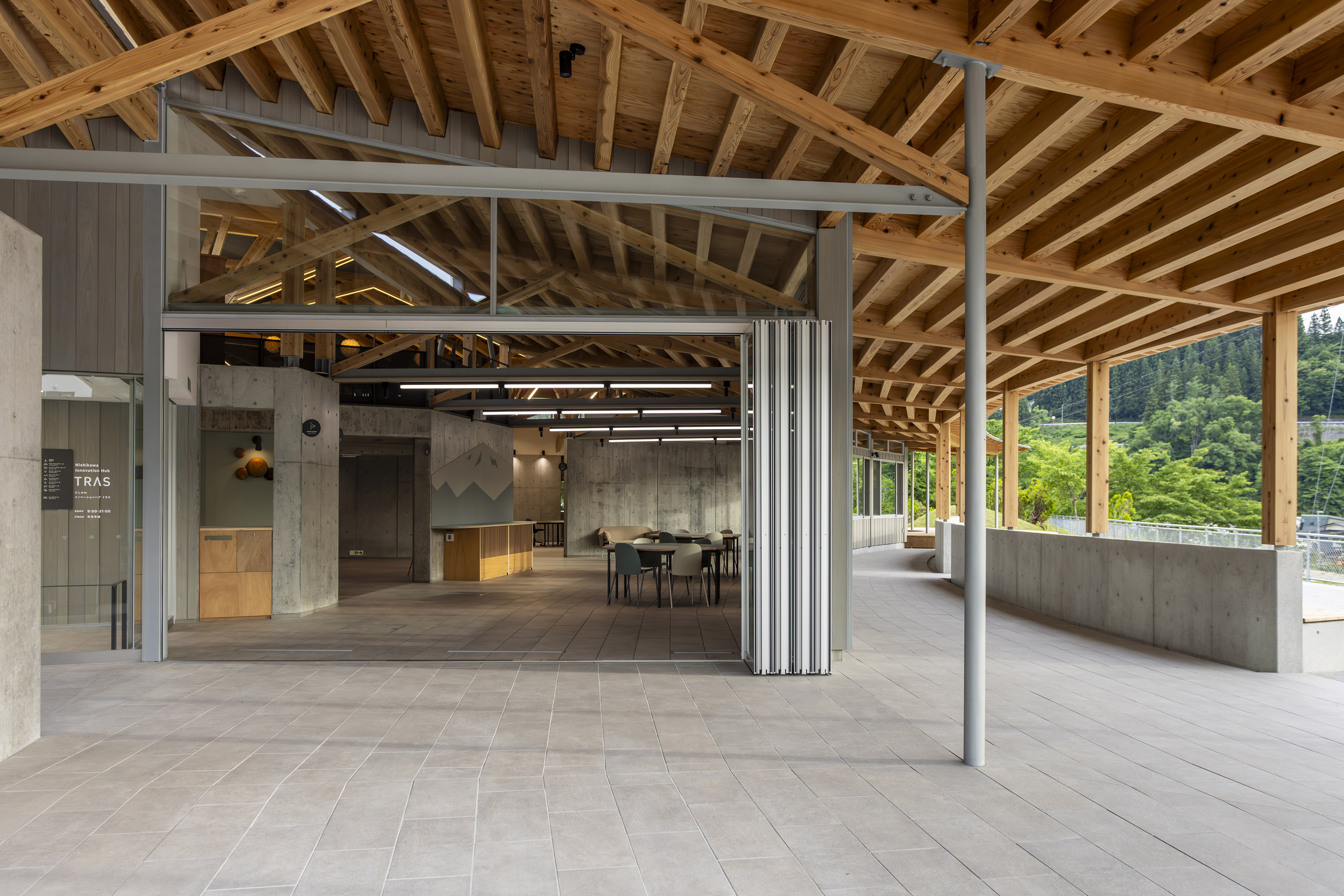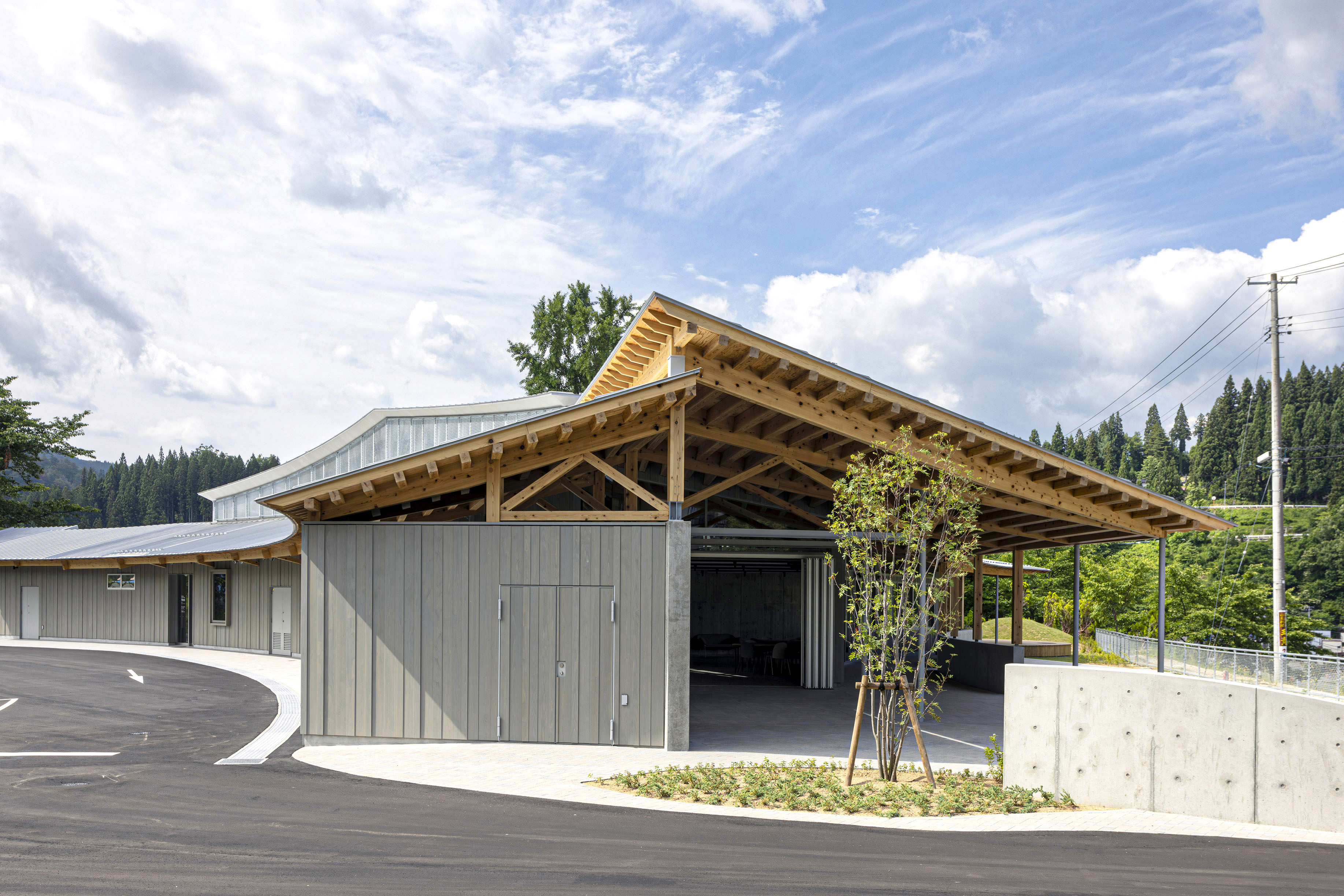 霊峰・月山の麓にある小さな町に〈みんなでつくる つなぐ・つながる場所〉をコンセプトに生まれた複合施設です。3つの円弧が互いに重なり合うユニークな平面形状と、町内産の「西山杉」を用いた3次元的な構造フレームによって、ひとつながりでありながらも多様な出来事が共存する森のような空間をつくりました。