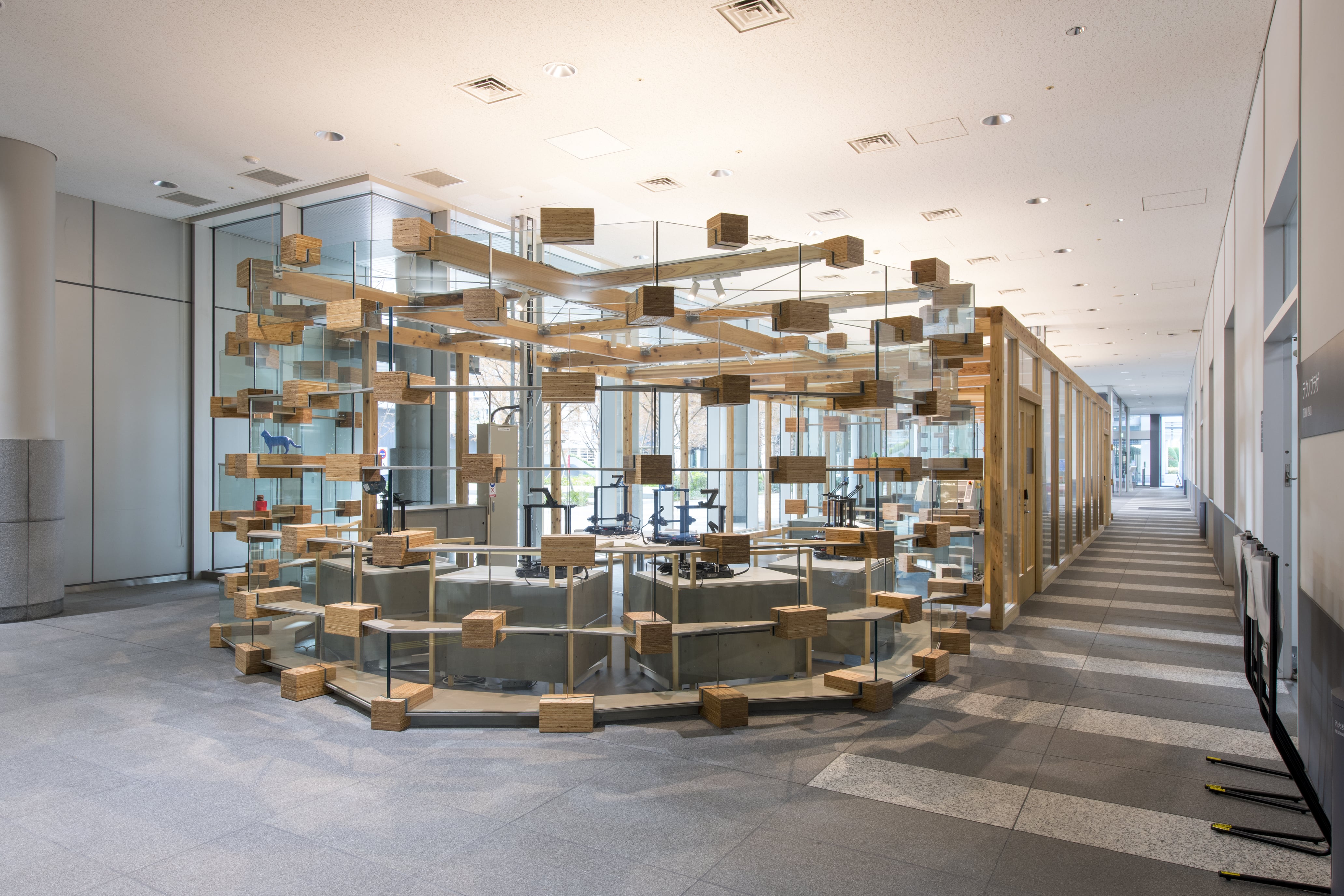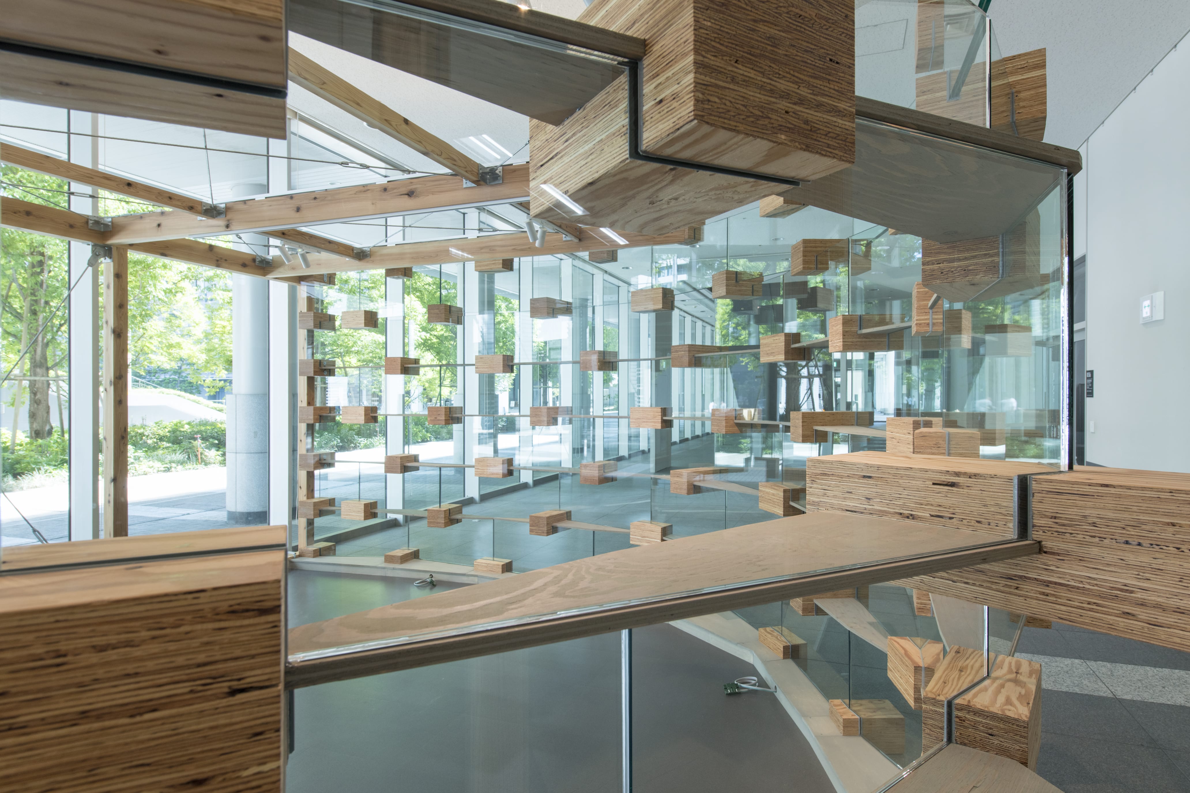 ガラスとLVLのコラボレーションによる実験的空間で、視覚的にも面白い効果を生み出している。ものづくりやデザインの実験の場にふさわしい、チャレンジングなデザインが見る人の興味を掻き立てるだろう。