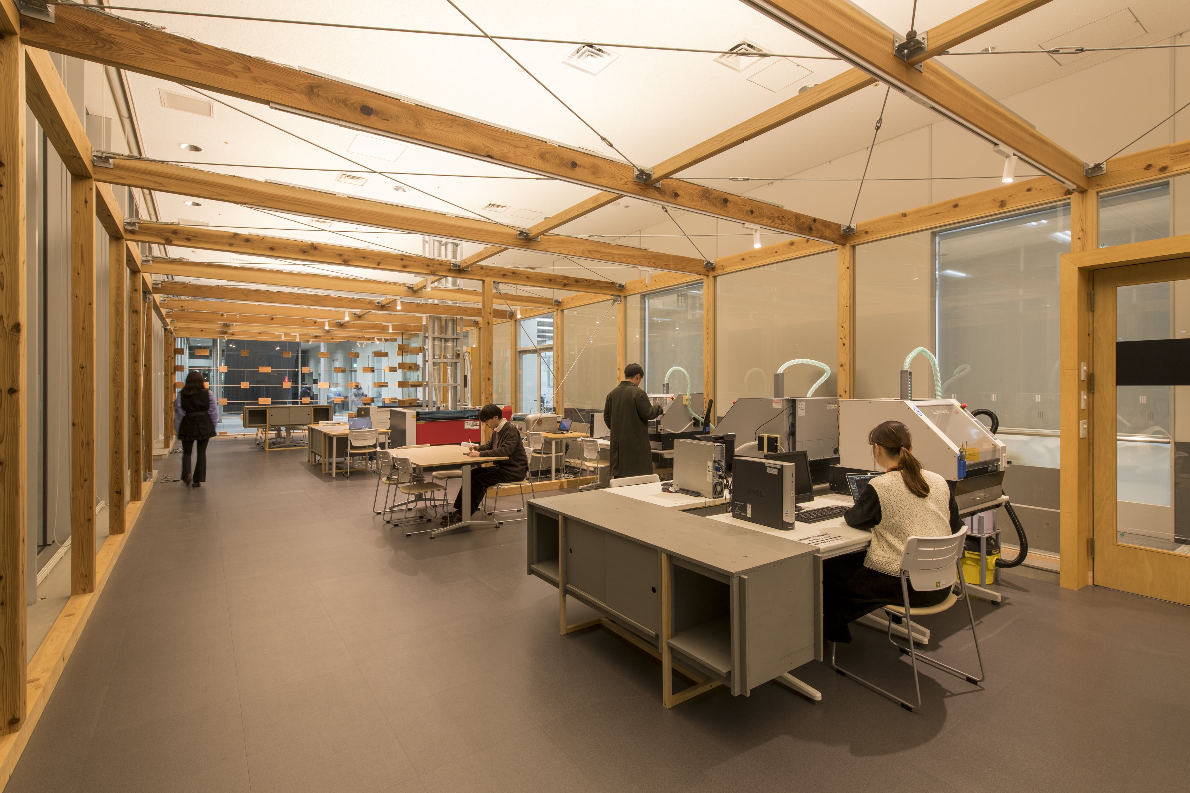 大学校舎のロビー内に木のブロックとガラスを組み合わせてつくりだしたファブラボ。重量感のあるLVLの塊が浮遊するように見えるスクリーンが、中で行われる学生たちの創作の姿を魅力的に映し出す。中央には軽快な軸組を採用しており、東西に添えられたガラス壁に地震力を負担してもらいつつ、開放的な表情をつくりだす。
