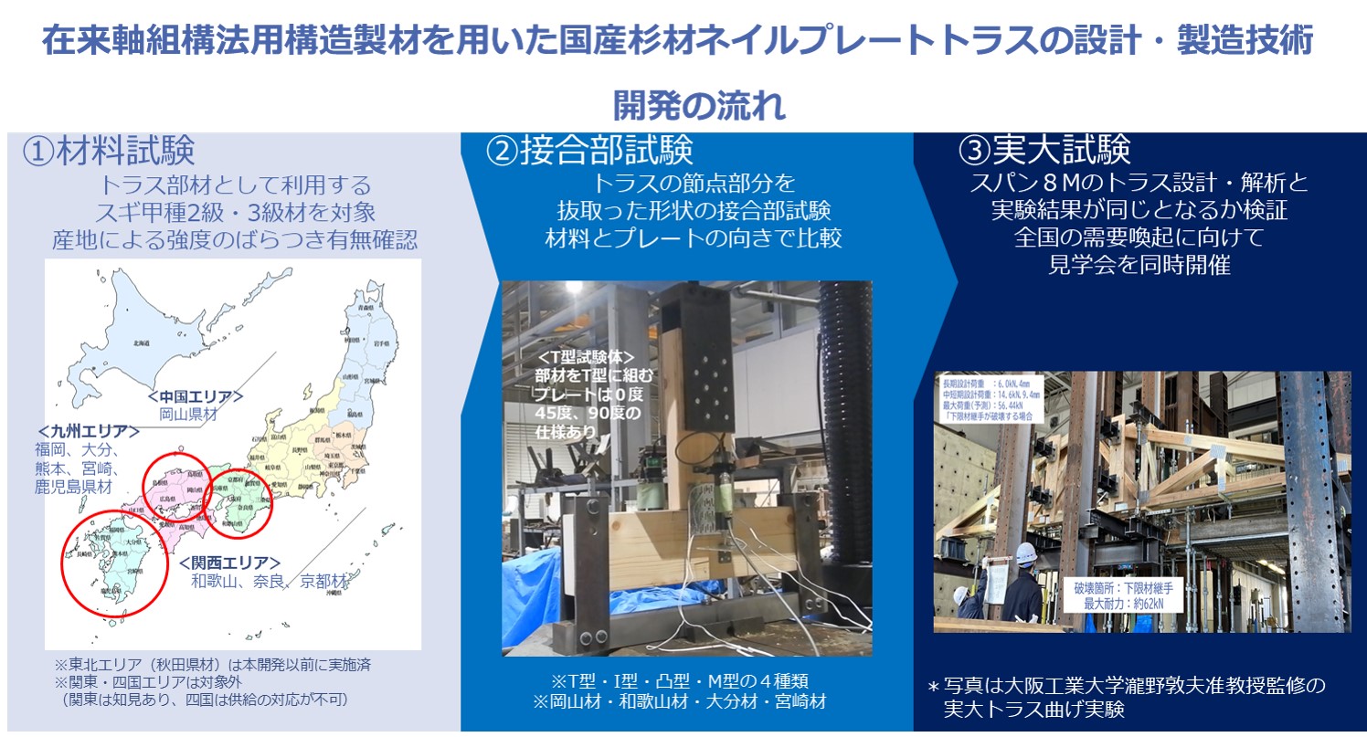 ネイルプレートトラスに利用できる材料は、枠組壁工法用製材のみとされていたが、流通量の多い在来軸組構法用の一般流通製材を材料に加え、関西、中国、九州エリアの各材料で試験し、構造性能を実証したことで適用範囲が広がった。大断面集成材を使わずに製材で大スパン架構ができ、各地域での地産地消が可能になった。