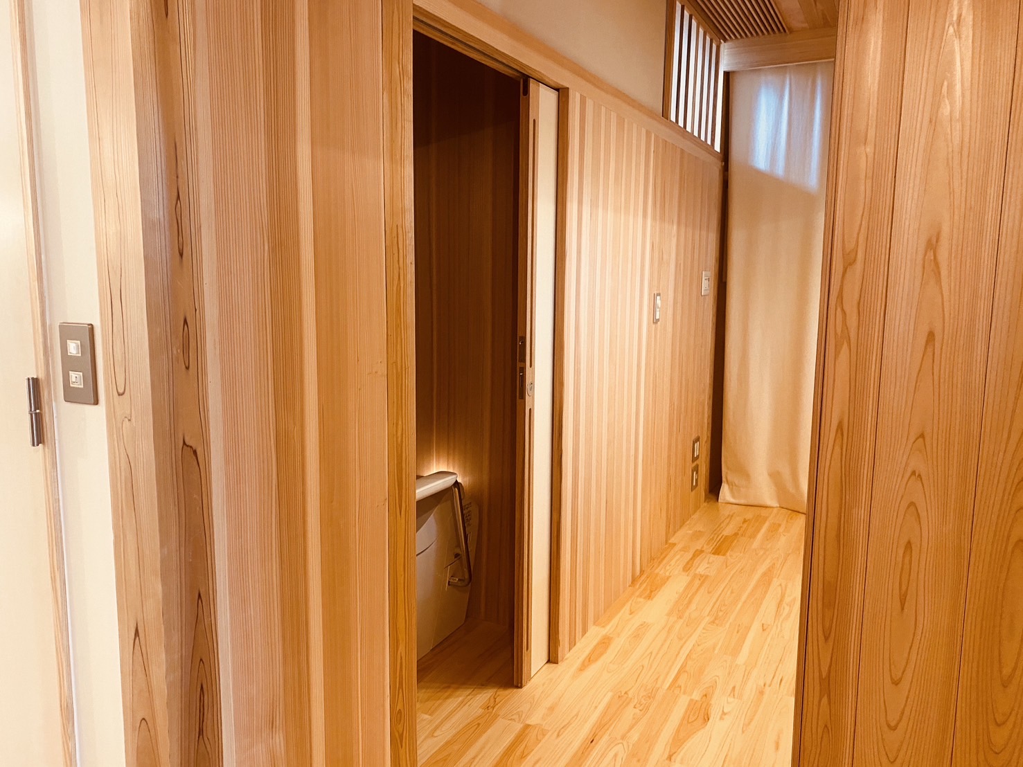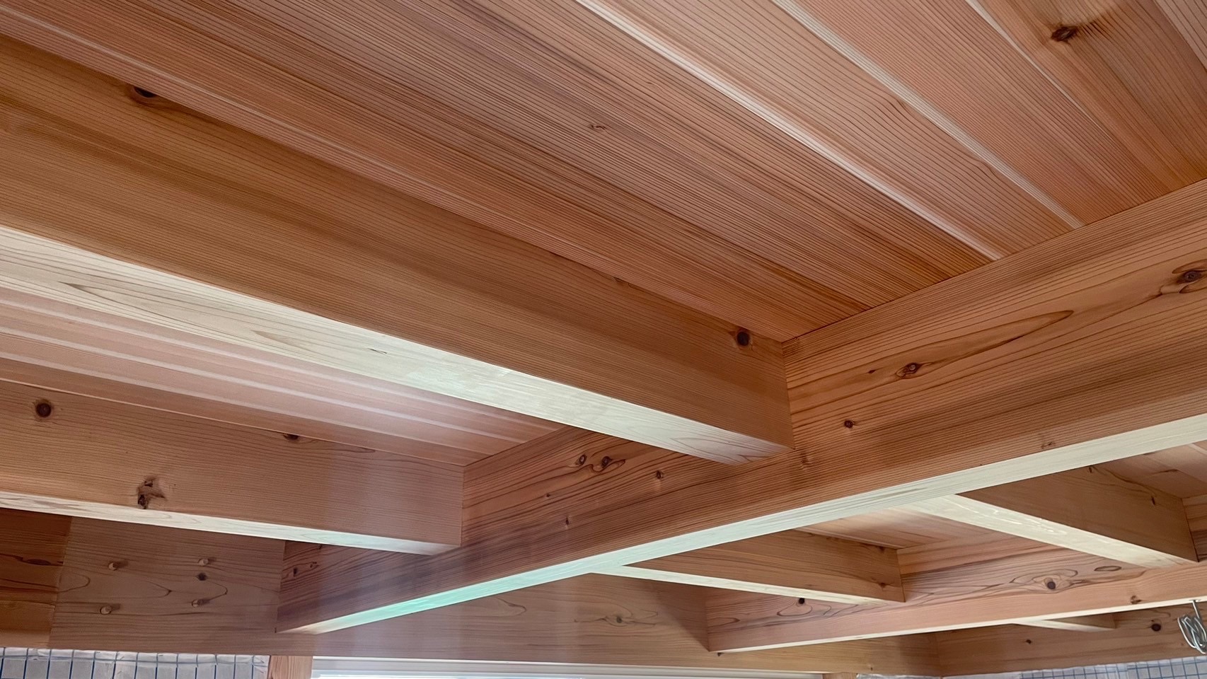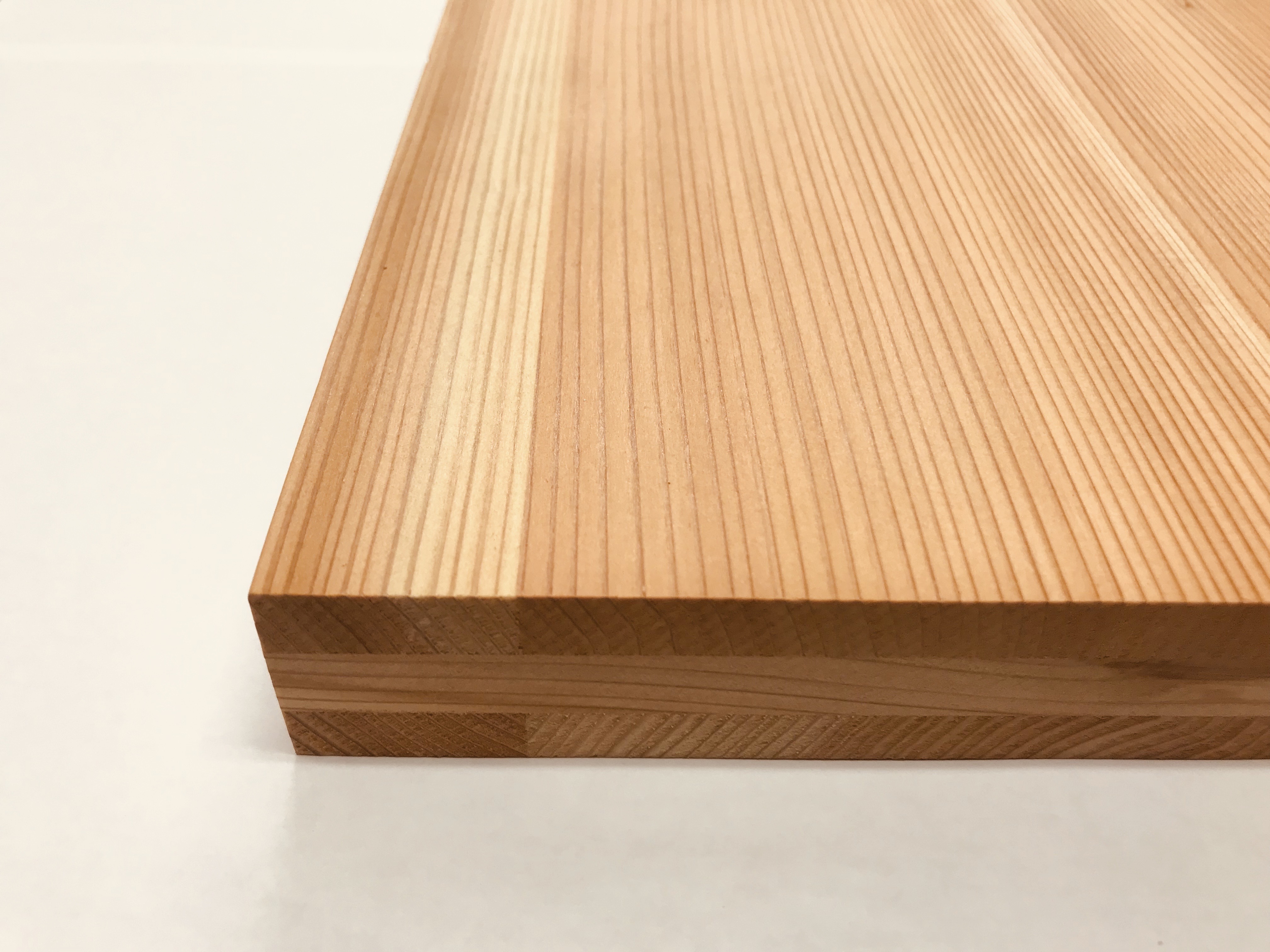 杉の大径材の活用につながるパネル材だが、柾目の意匠が綺麗に出た内装にも使いやすい製品である。製材時の歩留まりが60%を超えるという実績は山元還元の点から有効であり、設計的にも様々な使い方を試したくなる。