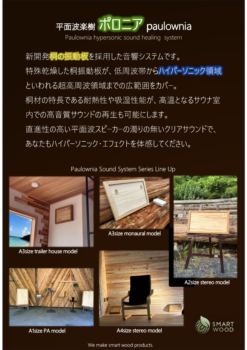 成長が早くCO2吸収に優れ、また素材としても独自の特性を持つ早生桐を活用した生活関連商品群。「楽樹」は平面振動板スピーカーやギター等楽器。軽量性や「ハイパーソニックエフェクト」による音響効果を打ち出す。建材は移動式サウナやトレーラーハウス等、軽量性や高い断熱性能をアピール。
