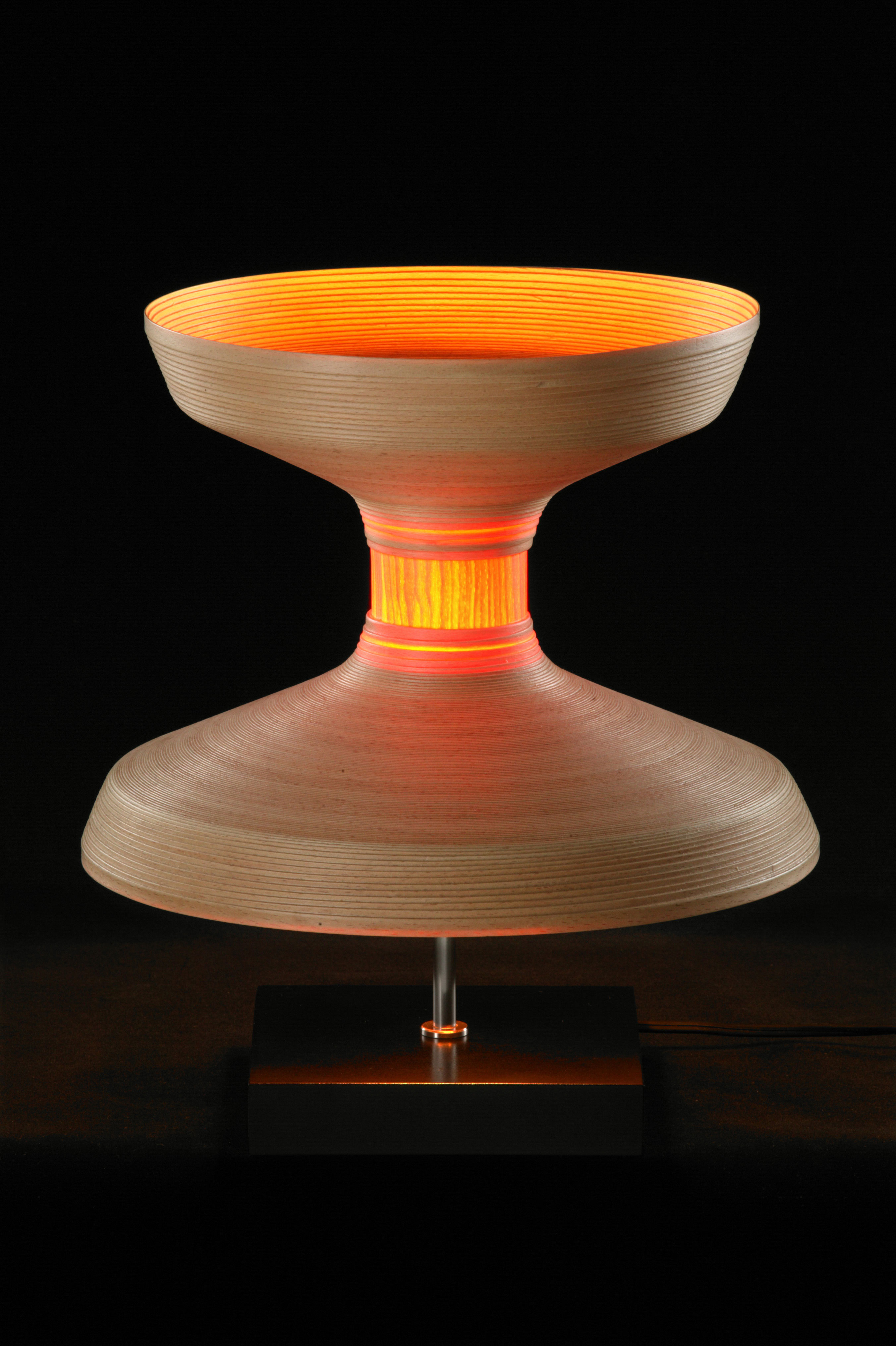 テープ状にしたブナ材をコイルのように巻き、押し出して成型するという、ブナコの製法ならではのデザインです。筒状の中間部は光を透すと温かなオレンジレッドに包まれた木目が浮かび上がります。スタイリッシュなデザインは和室・洋室どちらに置いても空間の引き締め役となります。