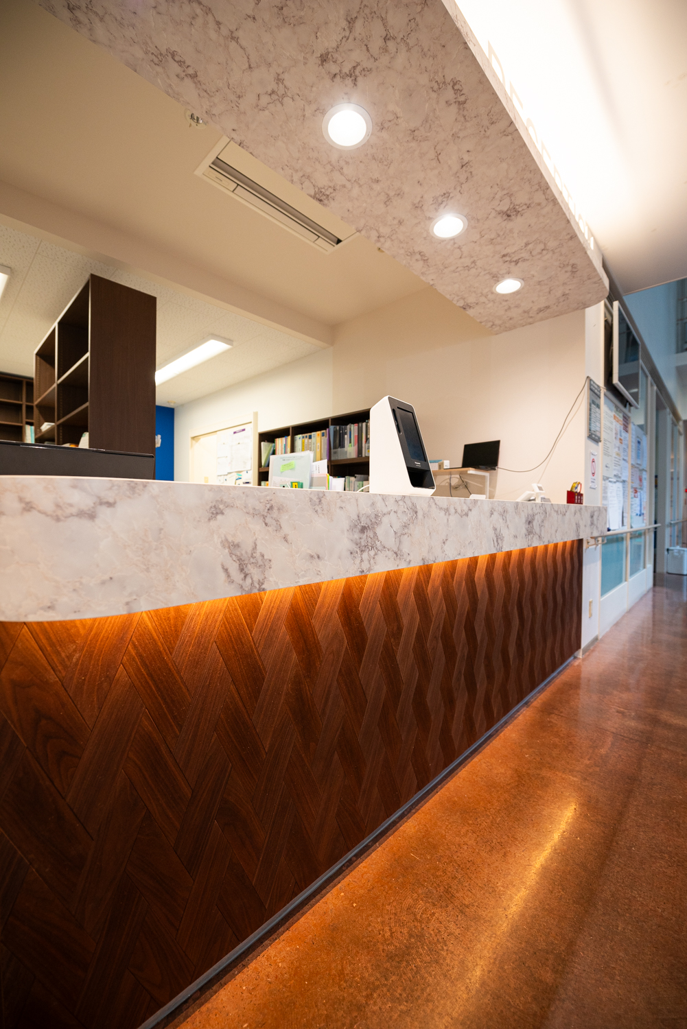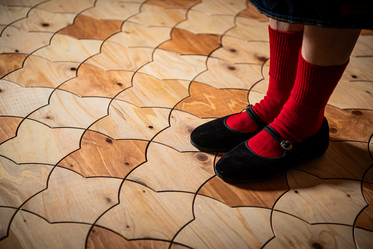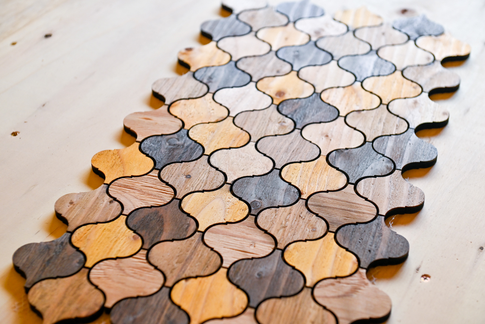レーザー加工機を用いることで、オリジナルのデザインの木製タイルができ、空間演出の幅を広げてくれる。店舗や事務所など、木を使いながら空間に個性を出したい時に適した作品である。