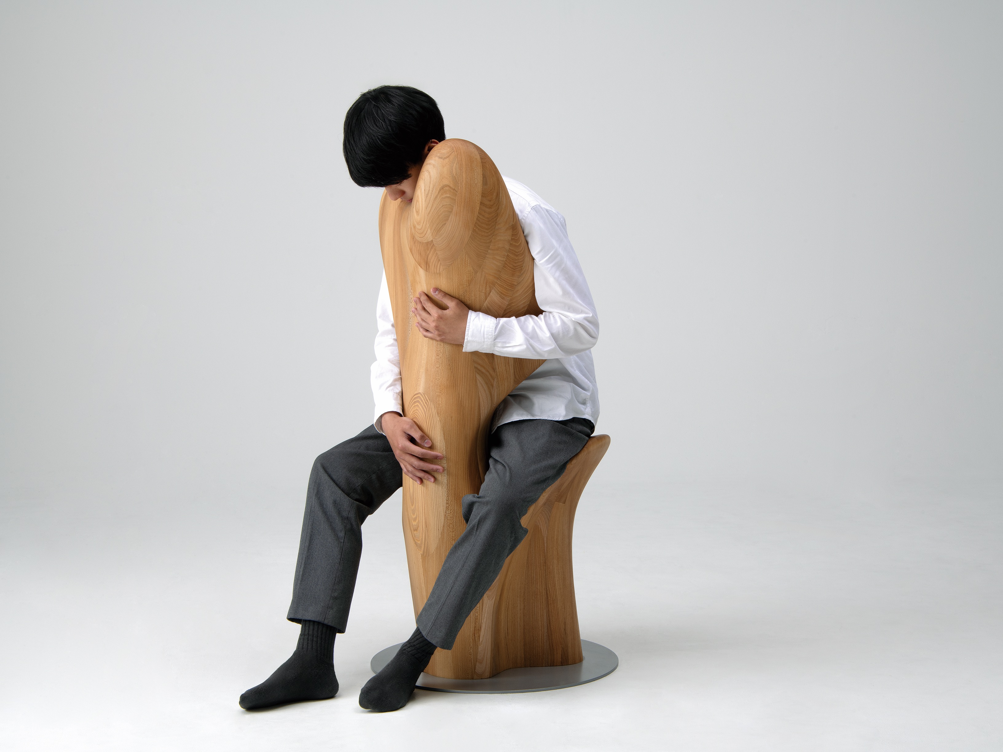 従来にない視点から生まれた椅子の提案。木を抱くことで身体全体で木の温もりを感じることができる点は新しい体験だろう。有機的なフォルムがもつ圧倒的な存在感が人々の目を引き付ける。
