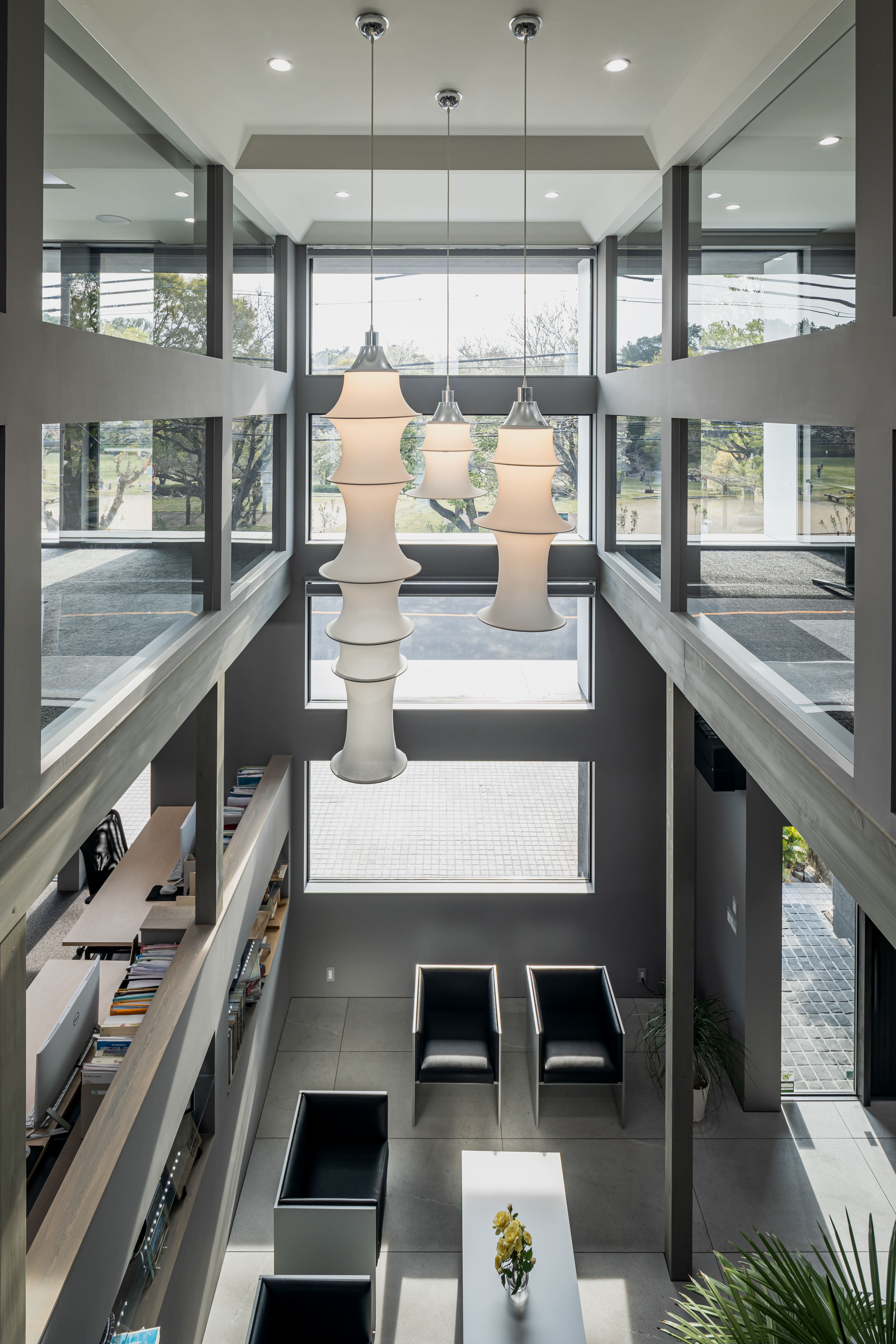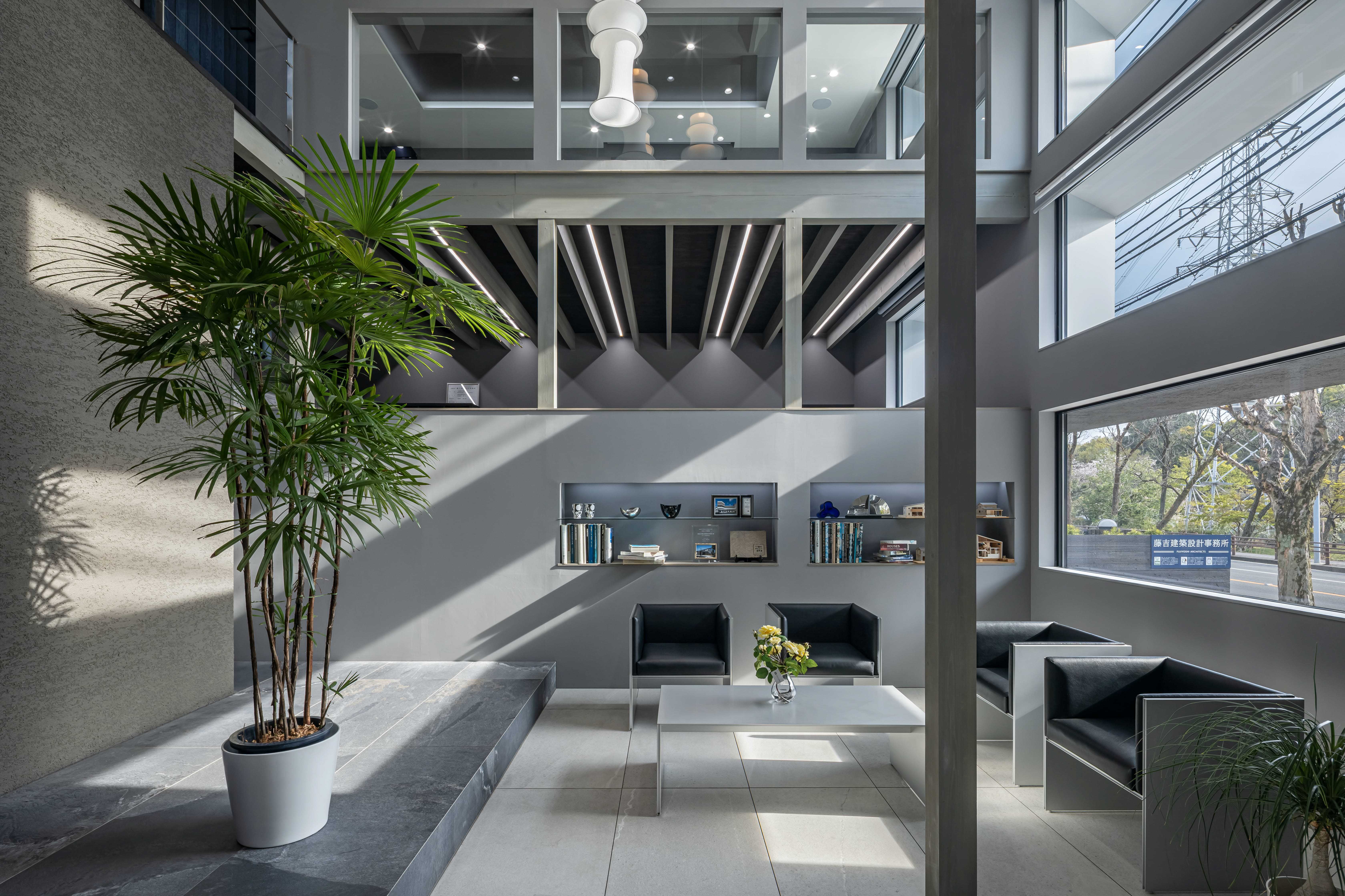 既存の木質イメージを刷新し、開放的な吹き抜けと大開口で印象的な空間を実現。木材の質感を活かしたスタイリッシュな構成は、郊外における小規模木造オフィスの新しい魅力を伝えるデザインである。