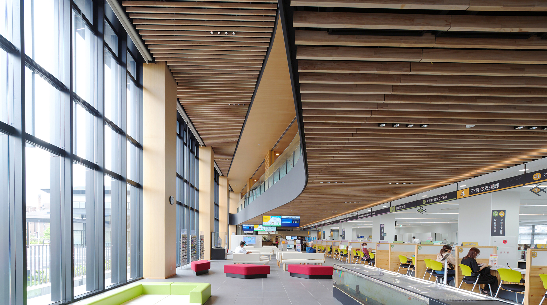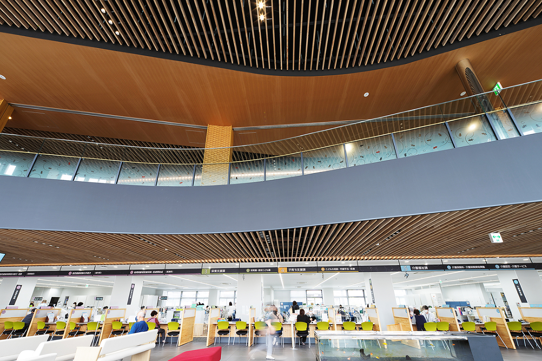 金魚の日本三大産地のひとつである奈良県大和郡山市における庁舎建て替えプロジェクト。積極的な木の活用により、来庁者をやさしく迎える空間や、職員が快適に働ける環境を実現。さらに、市役所という公共性の高い建築を通じて、木の魅力と価値を広く社会に発信することを目指した。