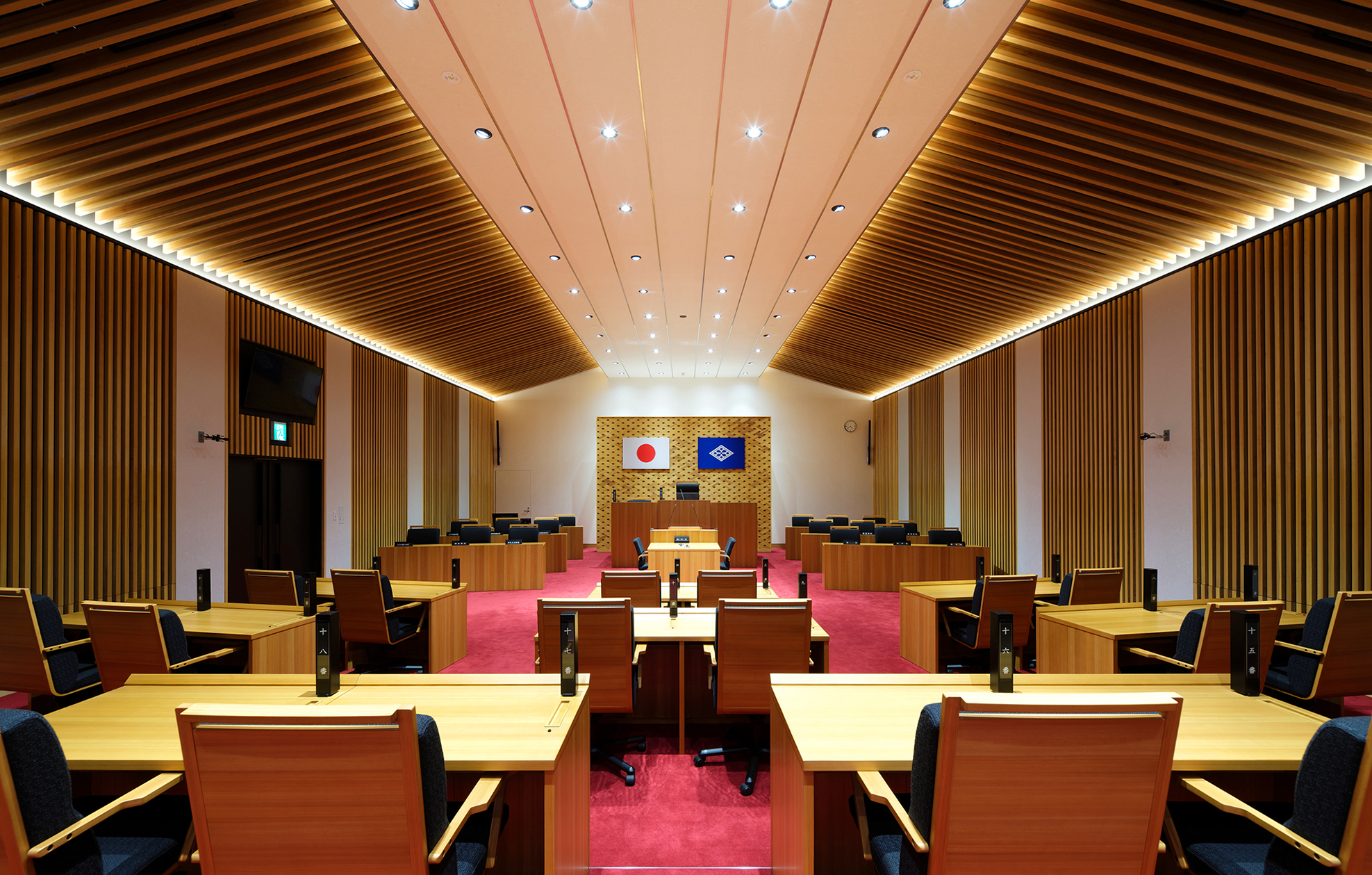 地域資源である金魚を彷彿とさせる曲線を造形した高度な技術と、県産材で構成した議場の象徴性が見事である。地域材の多彩な表現を通じて木材が持つ文化的価値と建築の可能性を発信している。