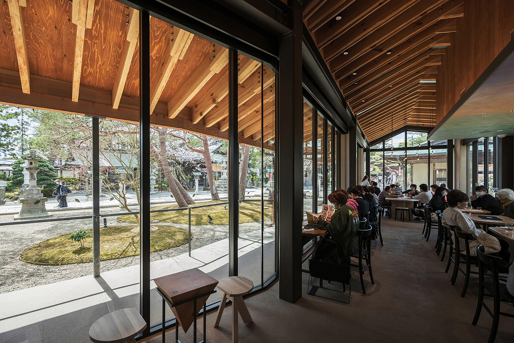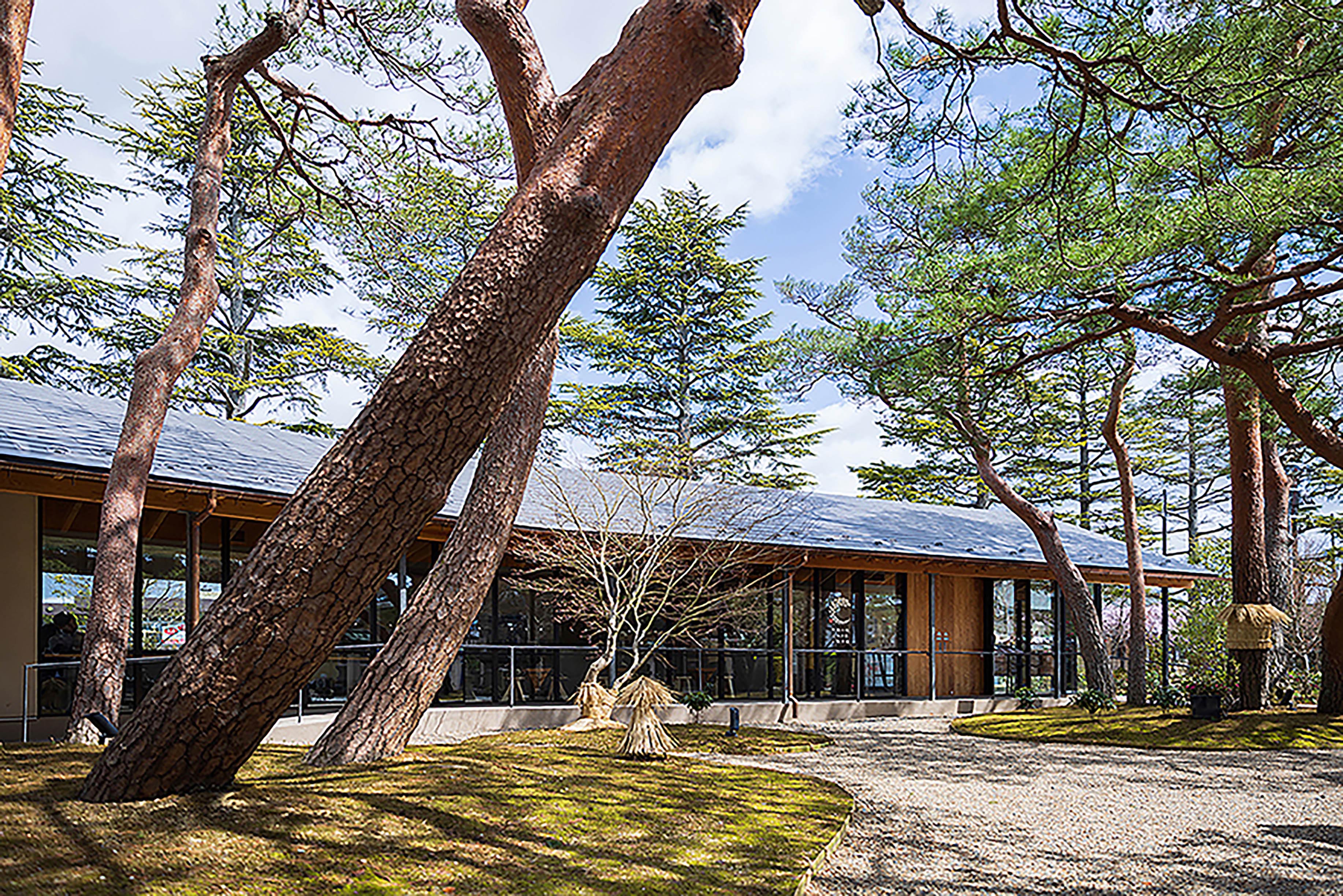 宮城県岩沼市に鎮座する日本三稲荷「竹駒神社」。境内の一角に心の拠り所となる癒し場を築くにあたり掲げたコンセプトは “呼び起こす”。「神社=鎮守の杜」と一体的に計画し、杜と共存する空間を創造。本施設が日常の延長として神社との距離を近づけ、新たなコミュニティを醸成し、地域の発信拠点となることを目指した。