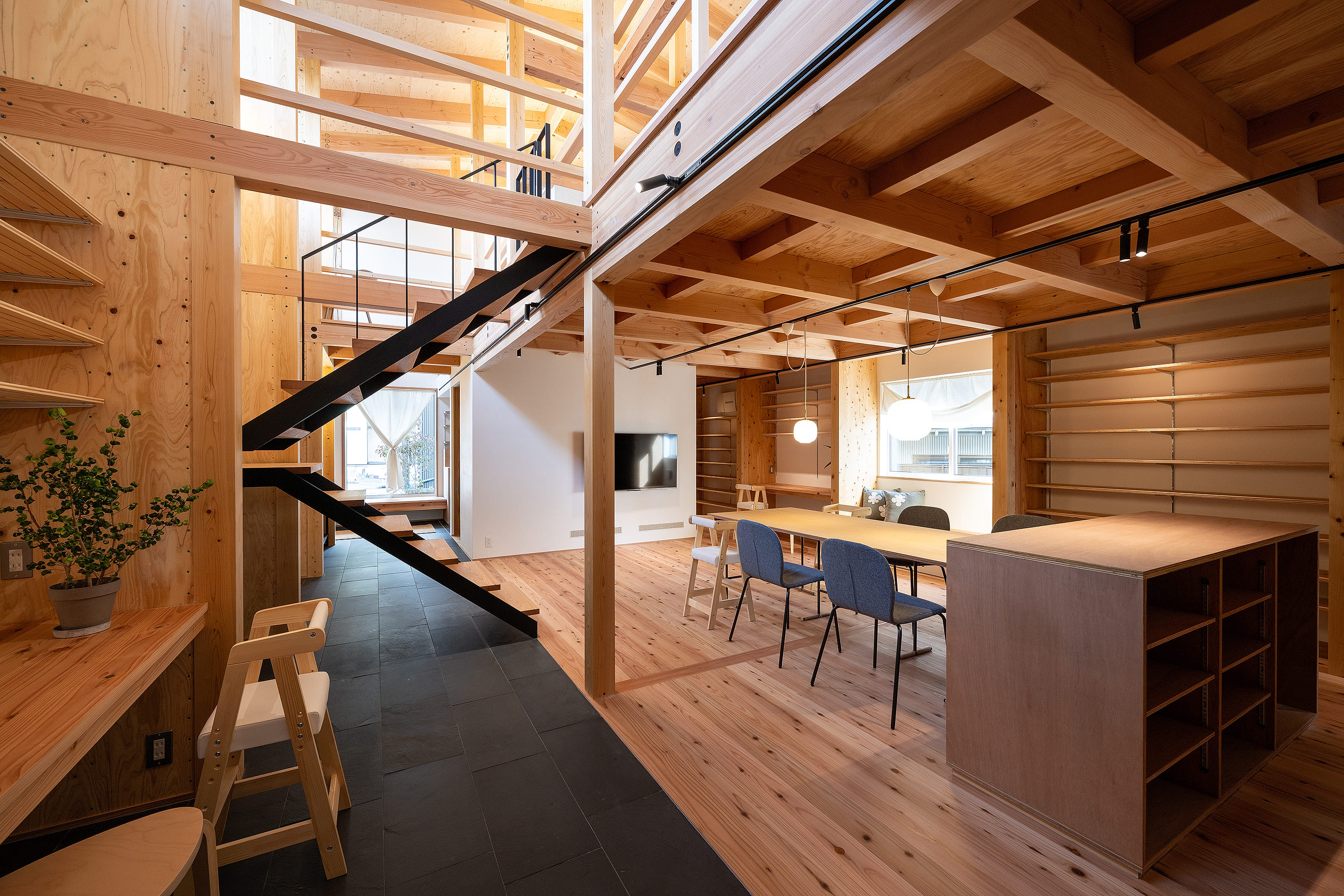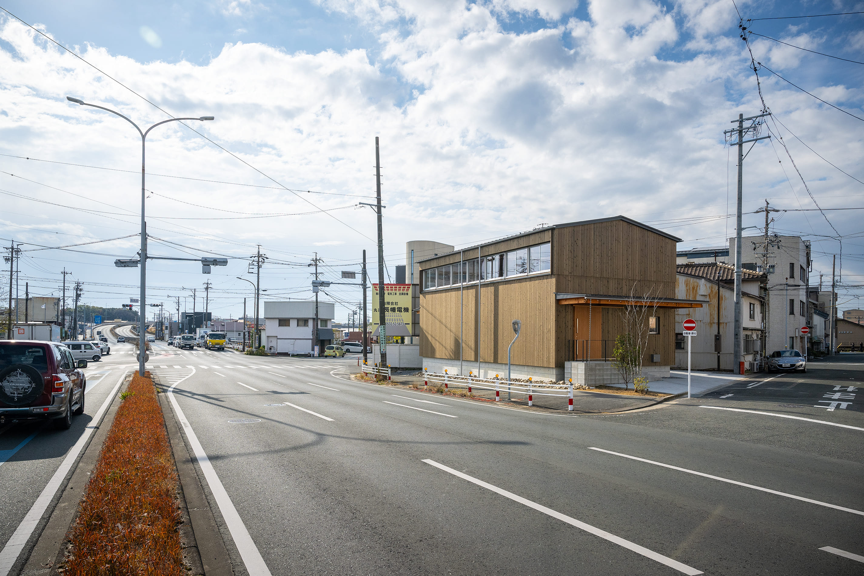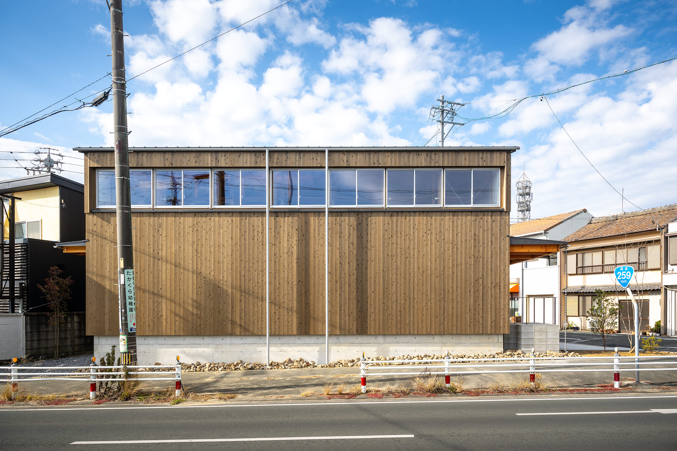 総杉板張りの外壁が街へ開き、防火地域でも木材が活用可能であることを発信している。シンプルな外観ながら木の存在感が強く、地域材の可能性を都市動線上で提示する社会提案性の高い建築である。