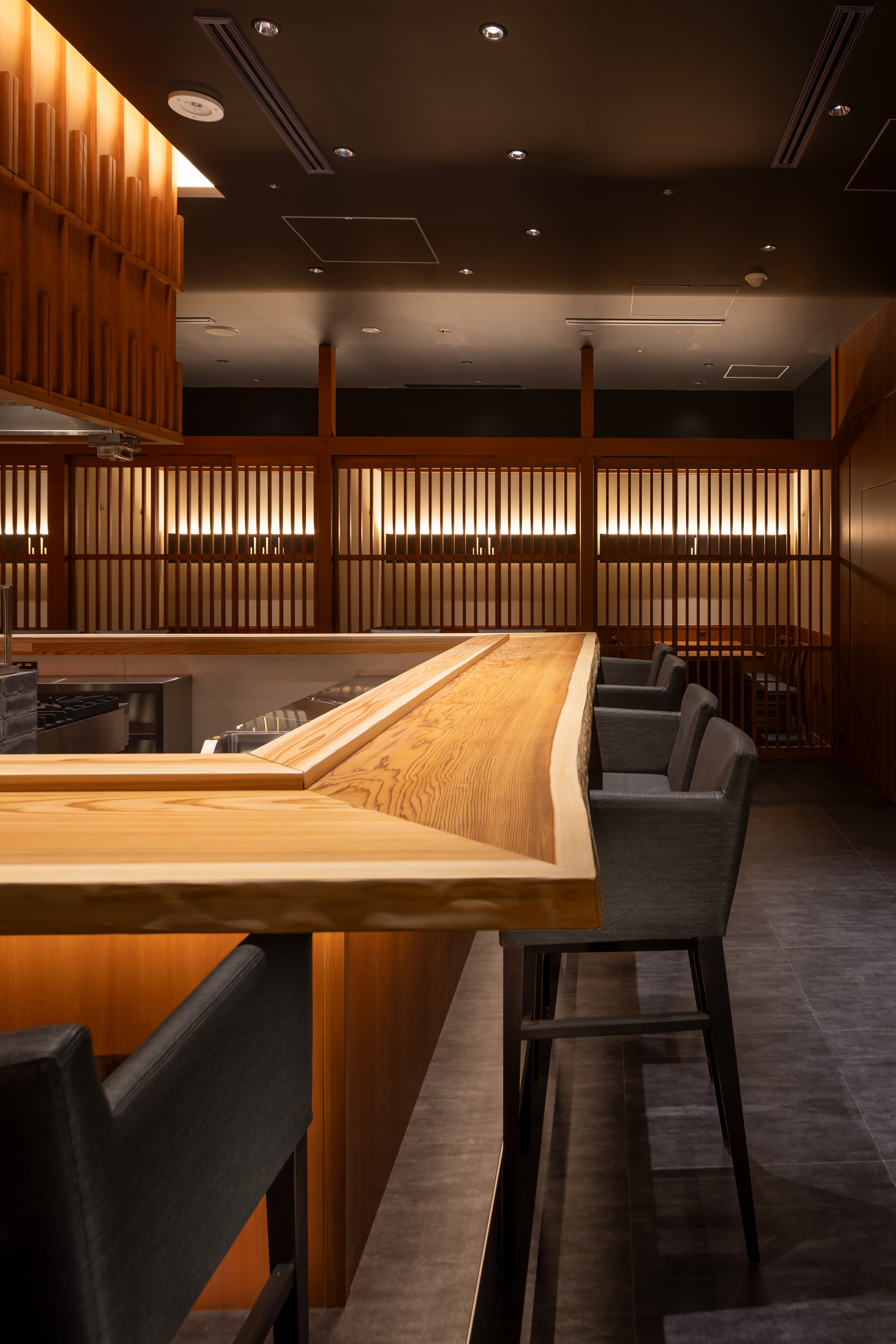 国産スギの無垢カウンターが食体験の質を高め、豊かな食の時間と地域材の風合いの良さを来訪者に伝える場として秀逸である。日本の食文化と木材の価値を同時に発信する心地よい設えの空間である。
