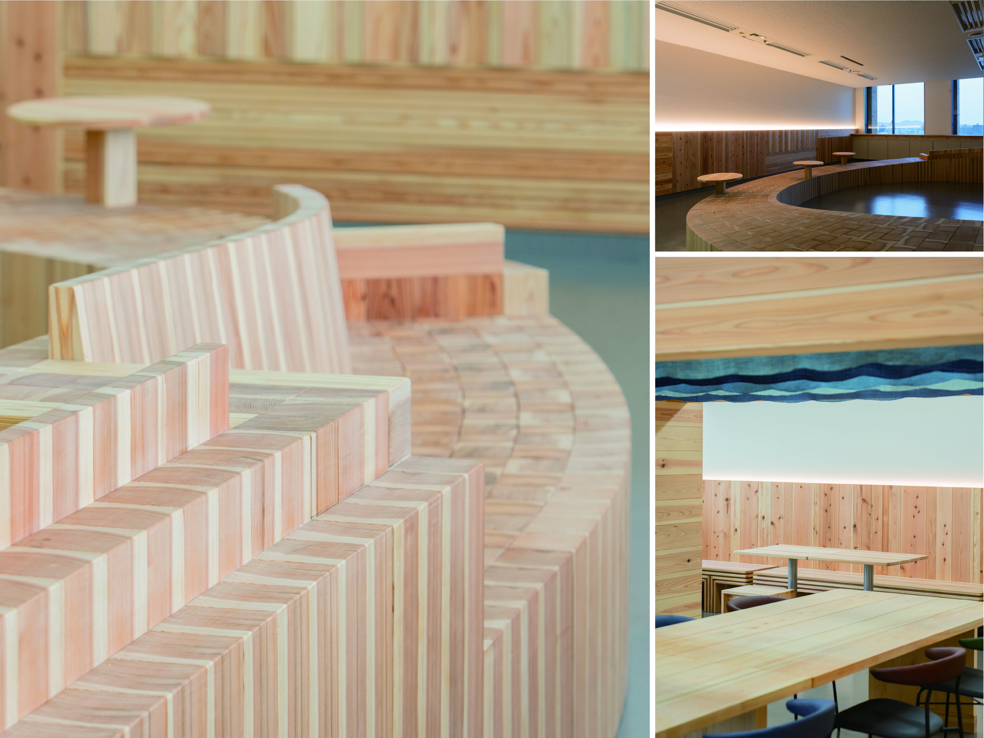 大径材や藍染スギなど地域の素材や文化を内装、家具として活かし、食事や休憩といったリラックスした時間を過ごすスペースに彩りを与えている。徳島の文化を木材利用を通じて発信する良質な取組。