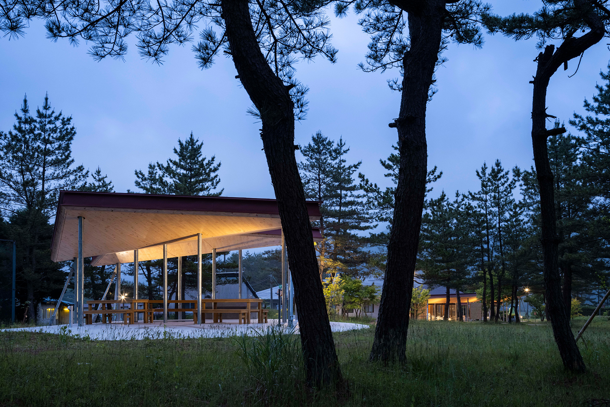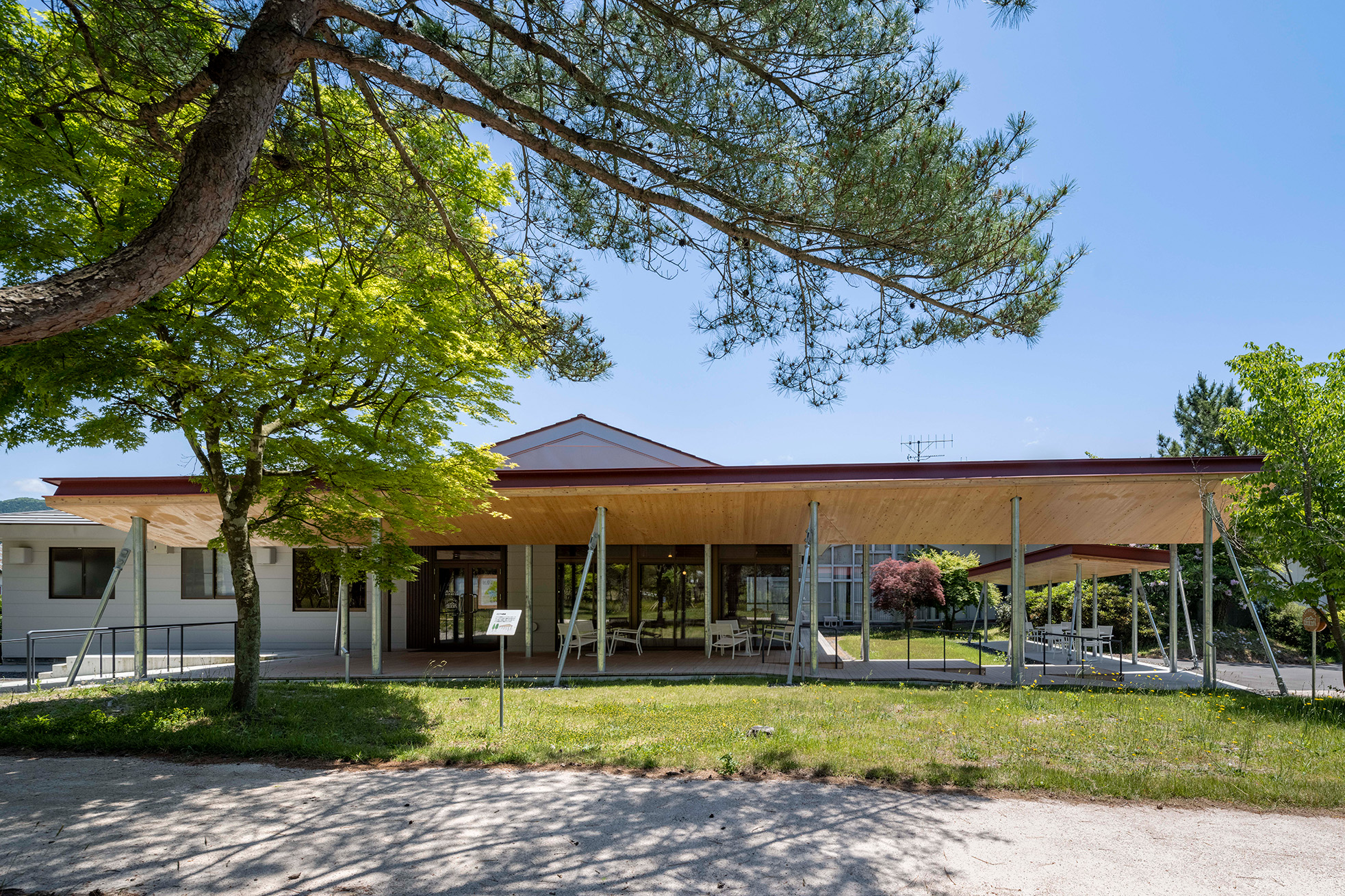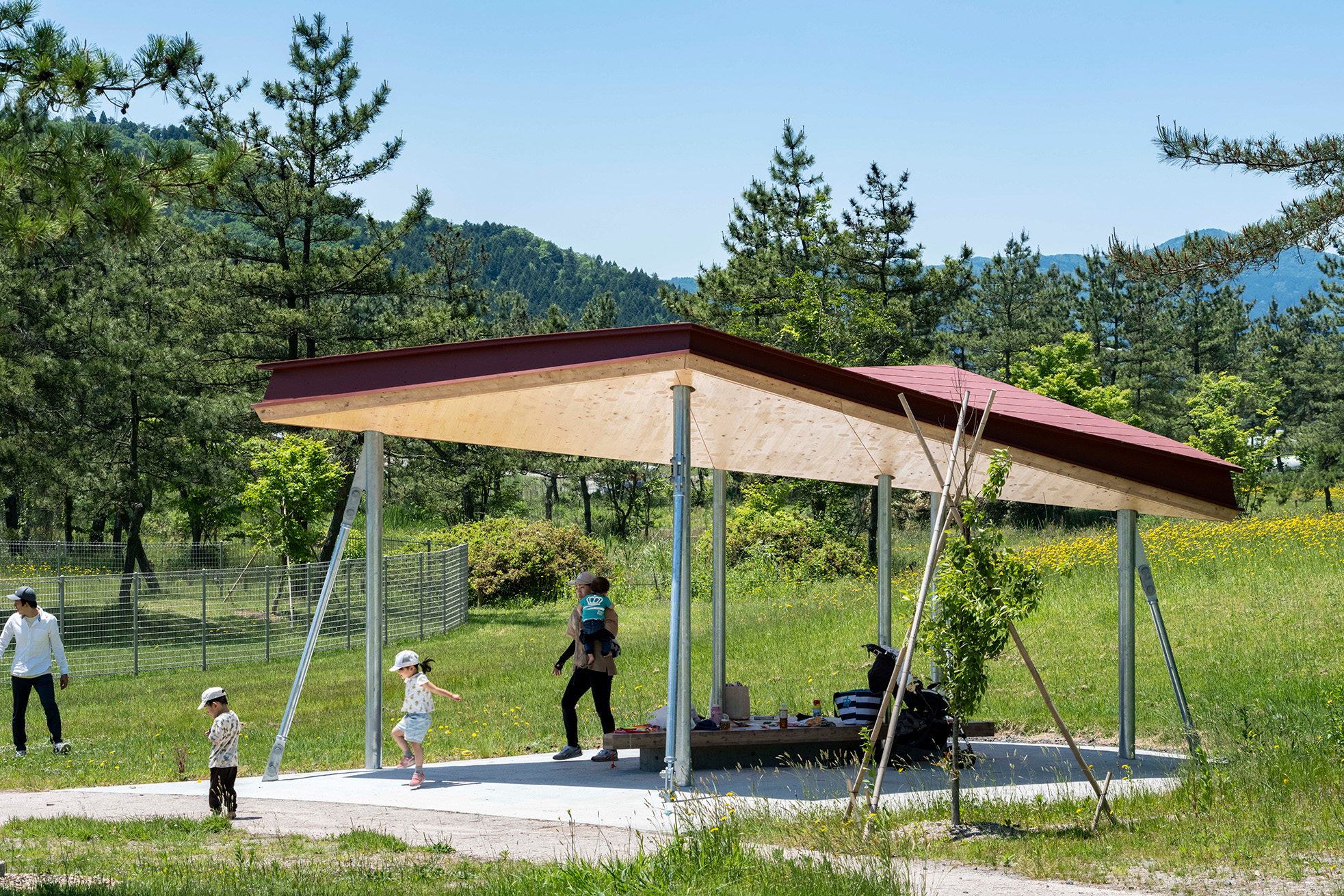ミニゴルフ場跡地を、地域の木を活かして市民のための公園にリノベーションした。起伏ある広い草地に、CLTの木の葉のような屋根を持つレストスペースや、木や膜など自然になじむ遊具を離散的に設え、それらを巡り高原の魅力を楽しむ公園である。パークセンターは、子供たちが木に触れて遊ぶ場所として改修した。