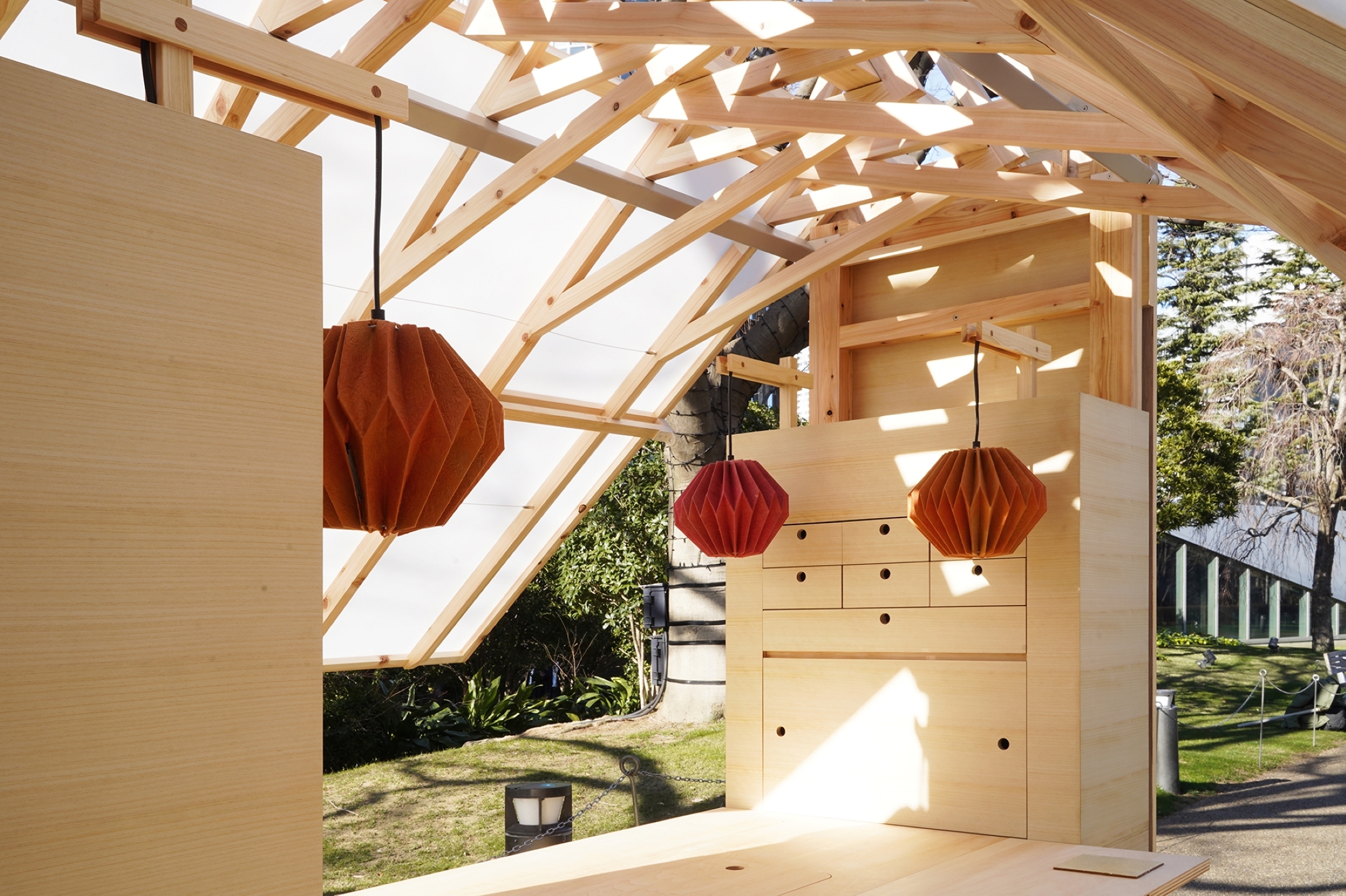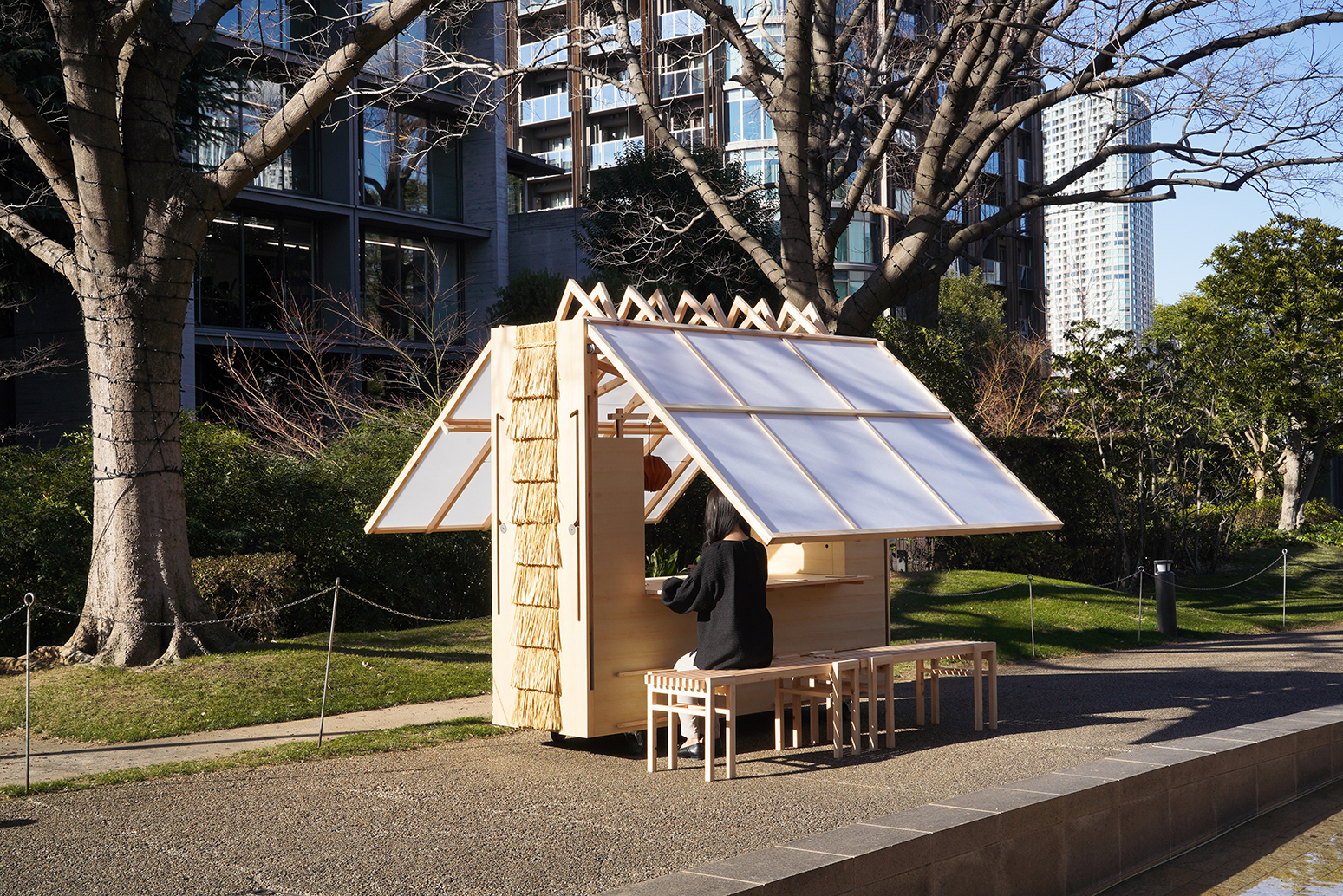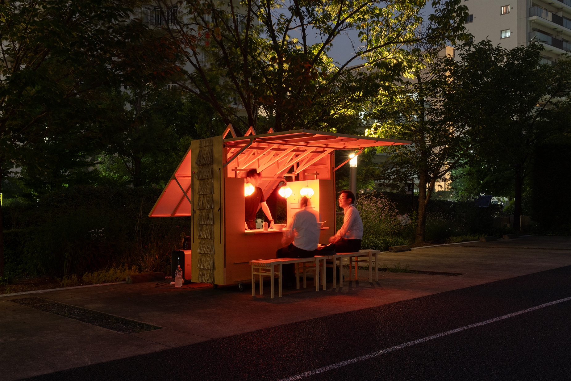道路や公園を動き回り、場に合わせて3モードに拡張するラーメン屋台。【箱型】移動時【家型】狭い場所【大屋根】開けた場所、集まるとマーケットとなる。都心近郊の切り捨て間伐材を森林資源として柱・梁・屋根に利用した。小麦葺き、廃棄乾燥麺タイル、和紙の提灯など、ラーメンから想起される材料の資源循環を図った。
