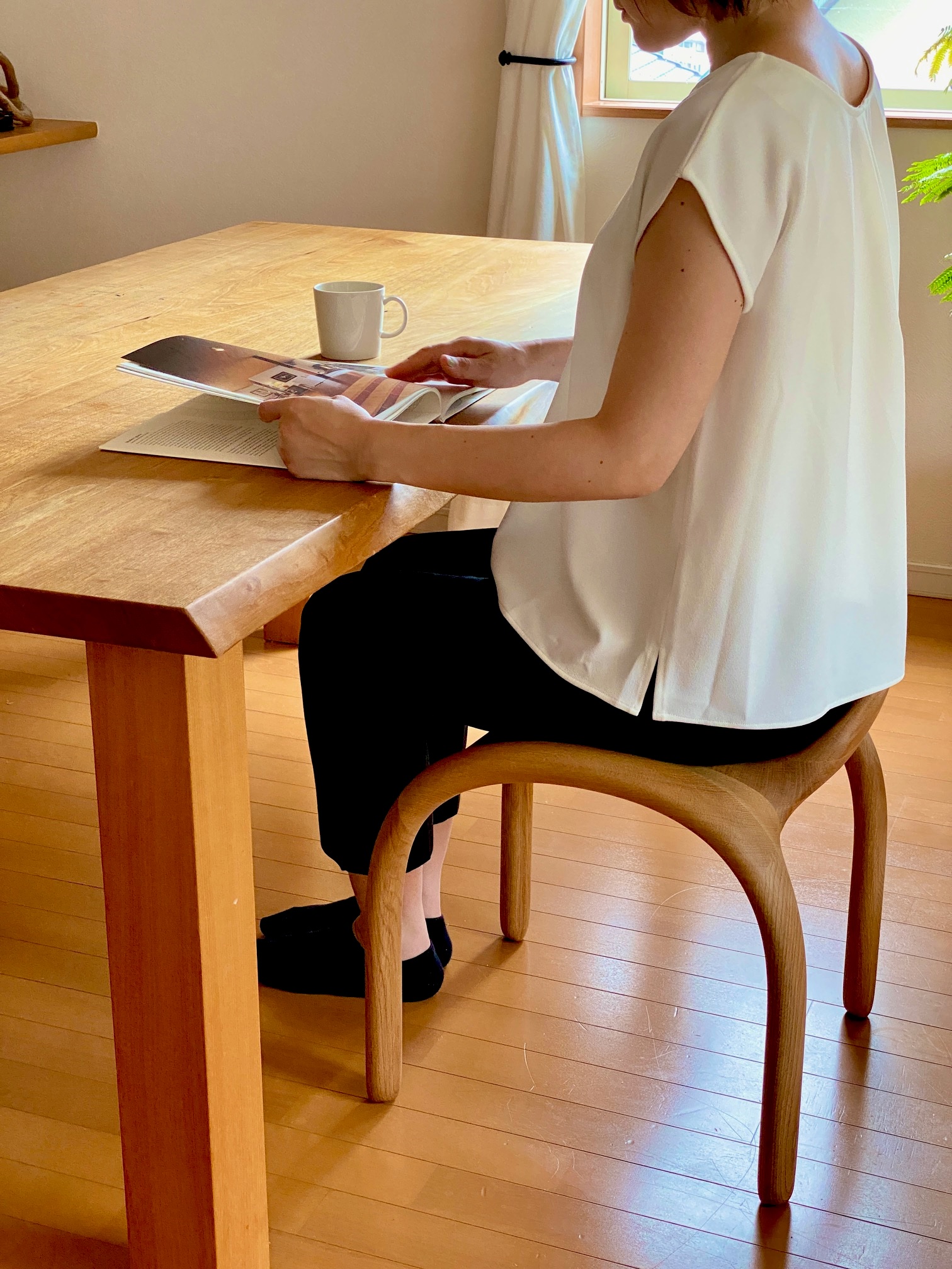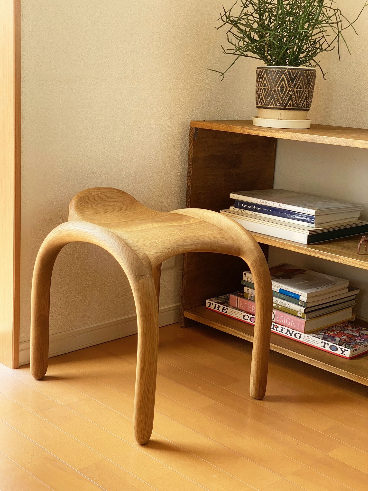 3Dデータ加工により造形と構造を一体化し、木の柔らかさを空間に広げる家具である。直感的なデザインをそのまま製品に反映した面白さが活きている。利用者に視覚的な印象と使いやすさを提供している。