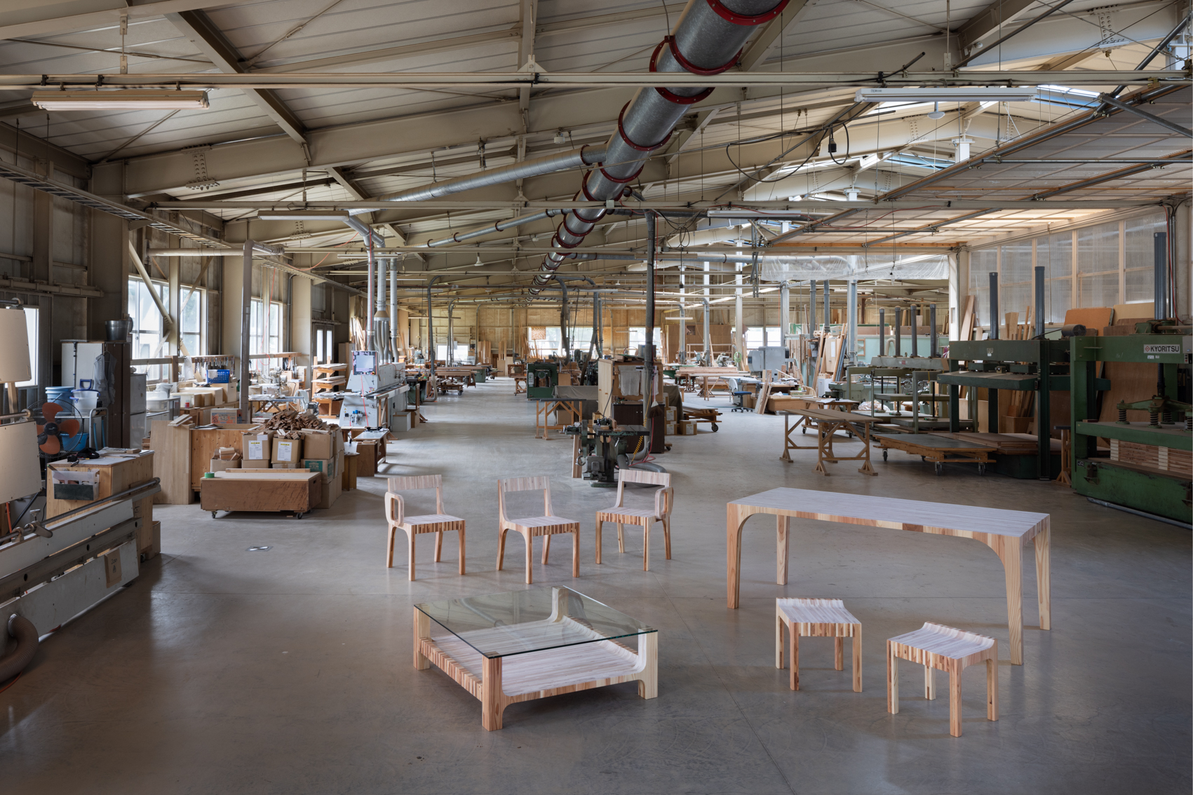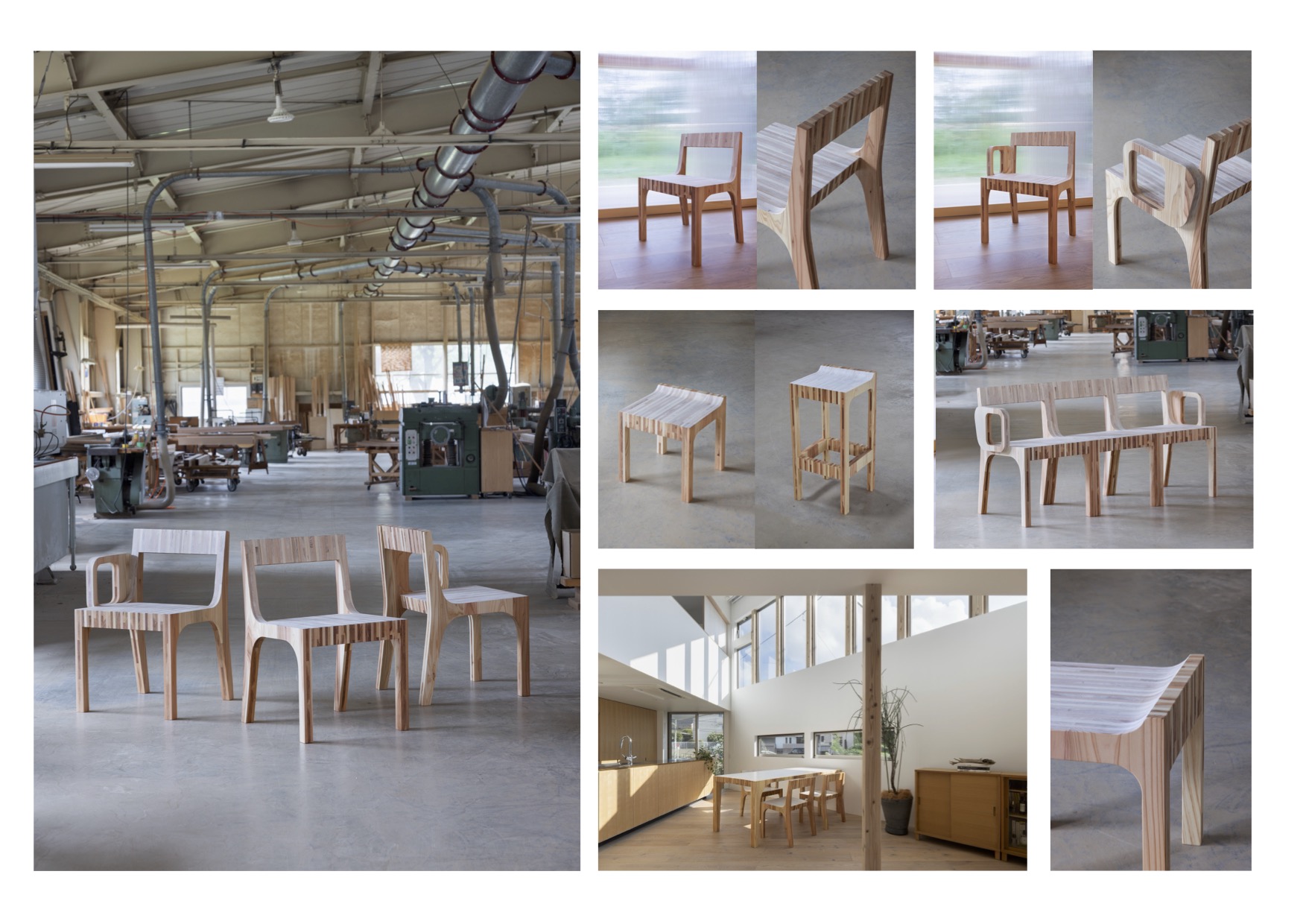 能代の家具屋さんや建具屋さんが製品の製作過程で出す端材は、これまで倉庫の片隅に積まれ、ある一定量を超えるとゴミとして破棄され燃やされていた。LAMINAは、ゴミとして処理されている半端ものの秋田杉の端材を集め、同じ厚さに揃え、3層に直交させて重ねてプレスした板を作り、その板で造った家具。