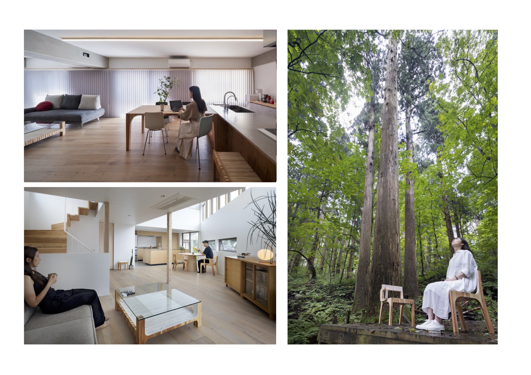 秋田杉の端材を重ねるアップサイクル手法により、廃材に新たな価値を与えたサーキュラーエコノミーの時代に適合した製品である。材を重ねた板の独特の表情は利用者の感性を刺激する。