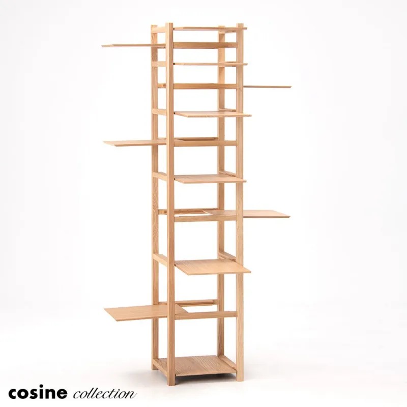 棚の好きな位置に引き出しを設置できる独自構造の自立型収納家具。空間や暮らしに応じて“見せる・隠す・飾る”を自在に構成でき、使い手の創造性を引き出す。北海道産タモ材を使用し、背面にも丁寧な仕上げを施した。職人の技が機能美と彫刻的な存在感を両立させている。