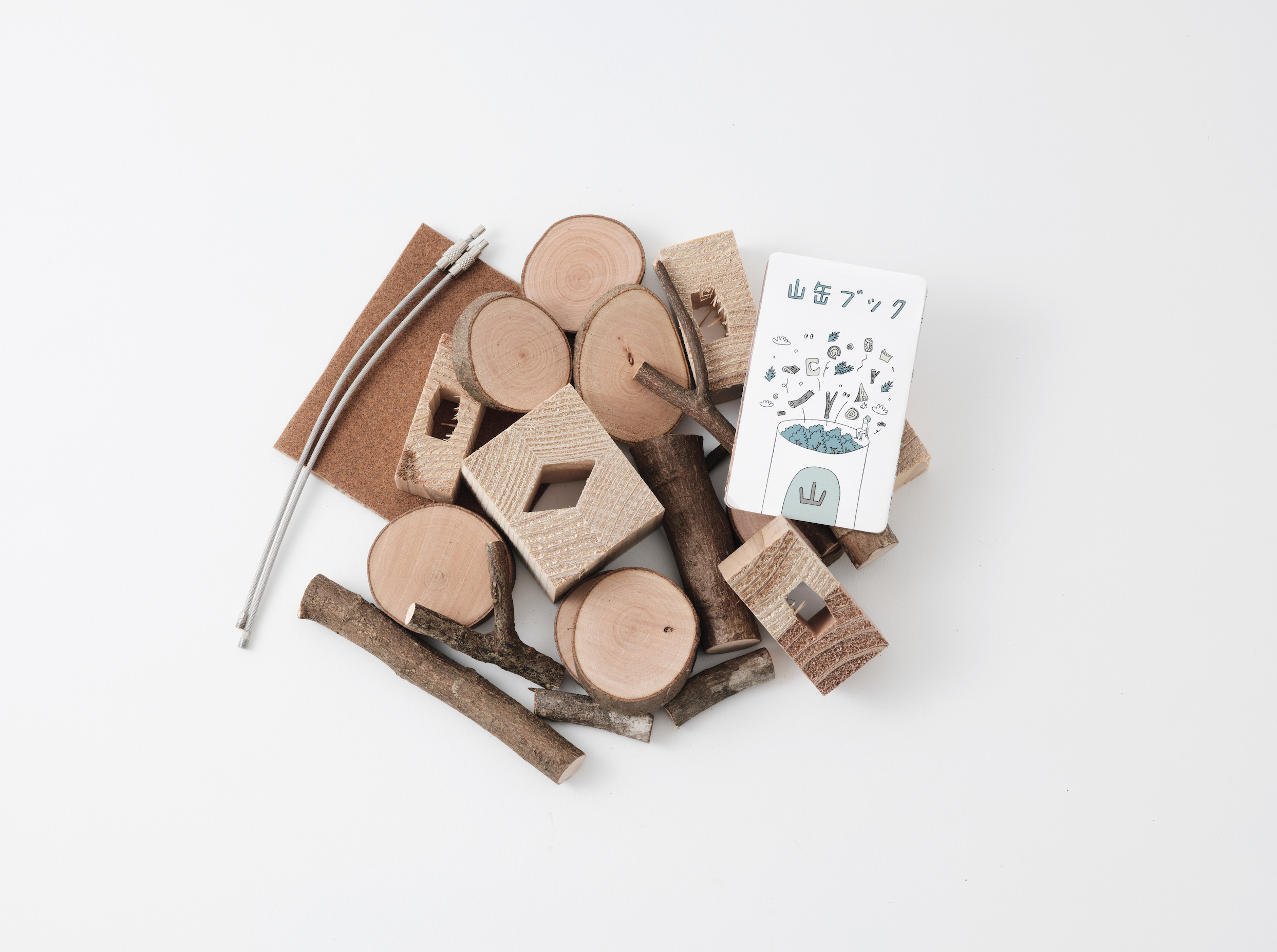 細い枝や製材過程で出る木の端材と、5種類の付属パーツをランダムに詰め合わせた、木育用途の木工キット。木端と一緒に、木の端材や生まれた場所の説明や遊び方が学べる「山缶ブック」も付属している。木端を使い、アイデアを思い思いに形にできる。