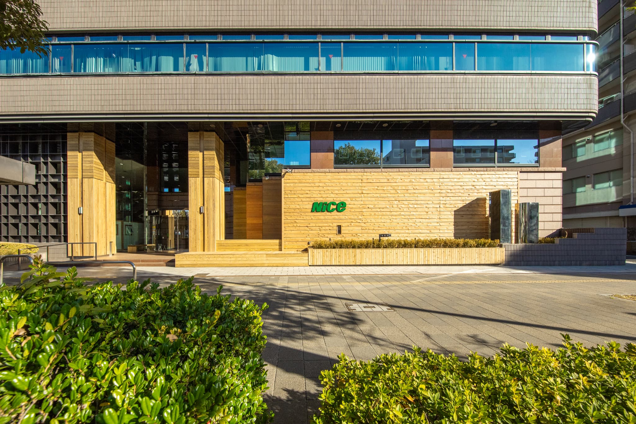 築30年超のナイス本社ビルを非住宅外装・外構木質化の「実験場」として活用。腐朽や施工、メンテナンスの不安解決を目指し、ObiRED®やGywood®など高耐久国産材と最新加工技術を実大で検証、経年変化を公開。国産材の新たな用途拡大とサプライチェーン活性化に貢献する。