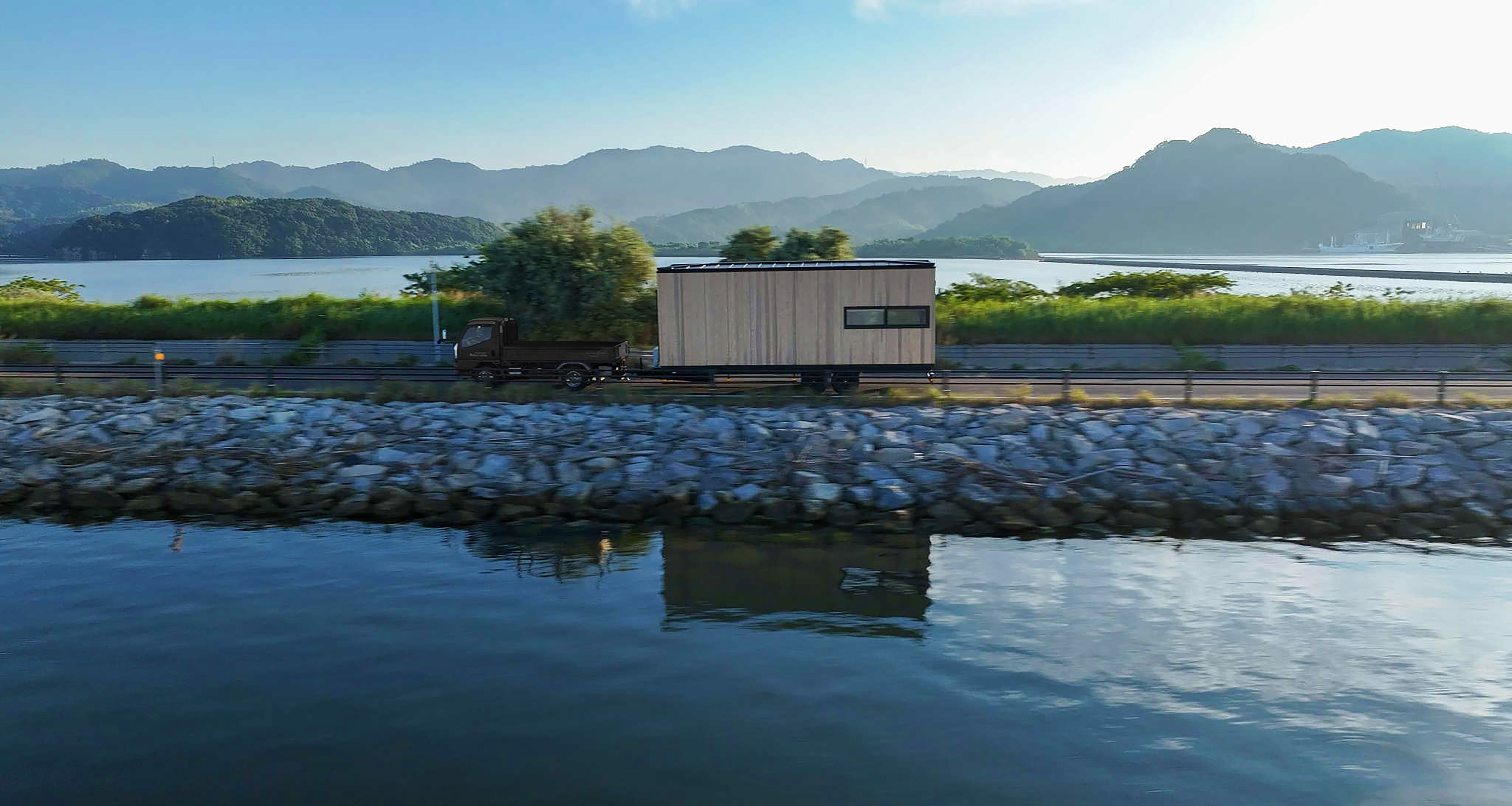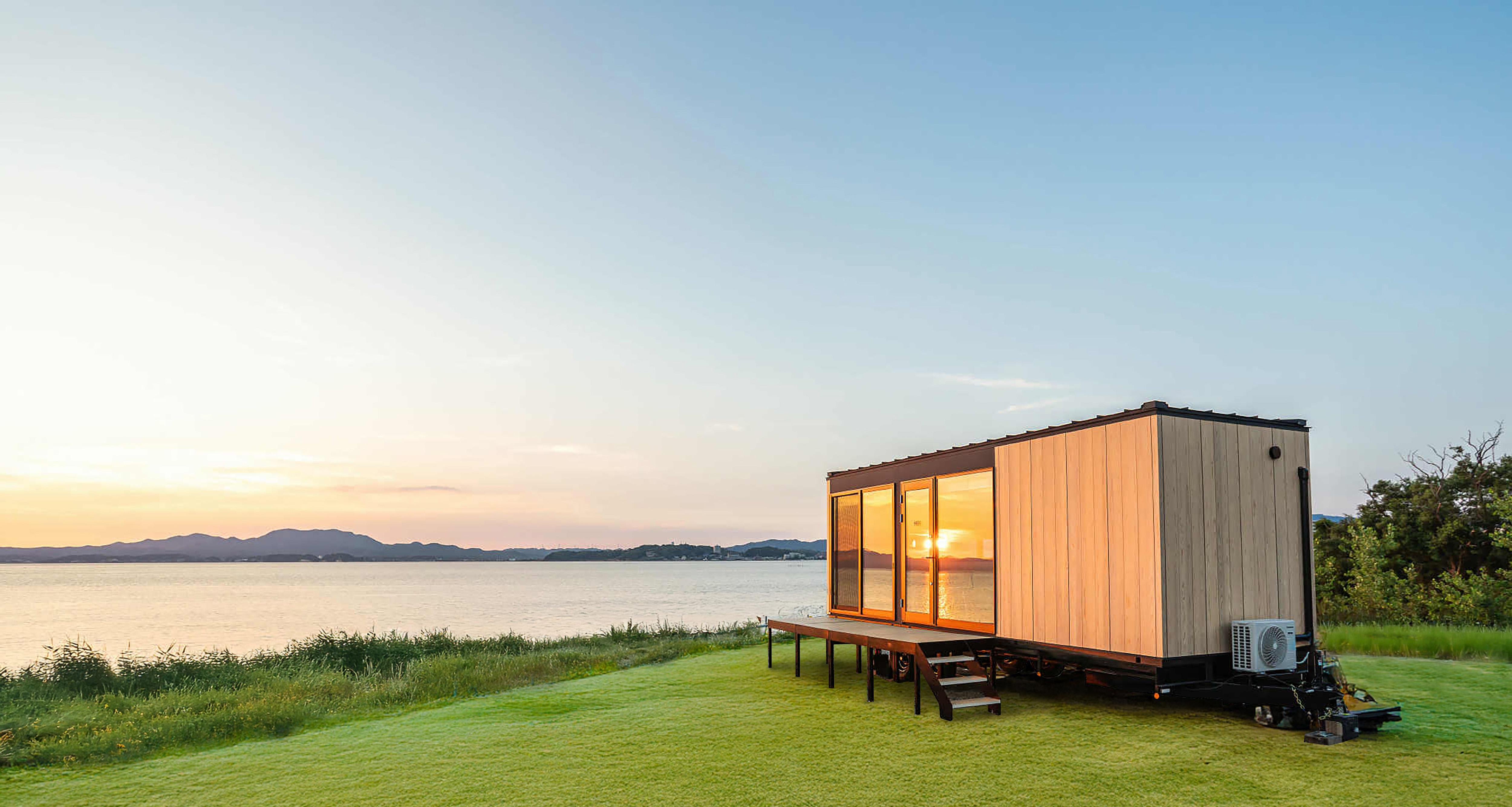 内外装に地域木材をふんだんに活用し、2400mm角のユニットで構成された、トレーラーに積載可能なシステムハウス。トレーラーハウスとしての利用はもちろん、地面に固定してタイニーハウスとしても活用できる。住まいや店舗、宿泊施設など多様な用途に対応する柔軟な住宅システムである。