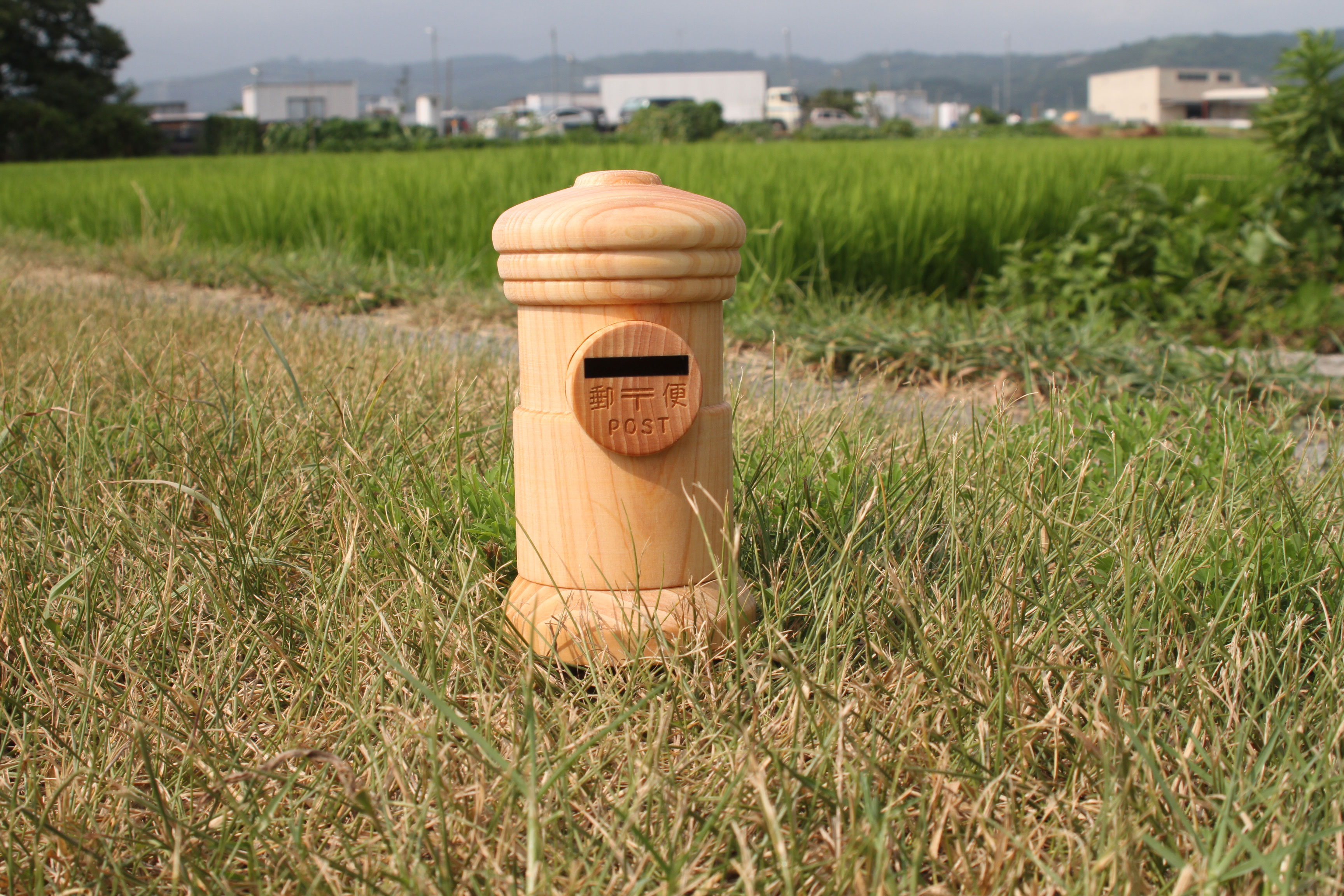 小田原の間伐材で作ったレトロなポスト型の貯金箱です。間伐材も、建築などでは使われない「元玉」という根元の部分を有効利用しています。このポスト型貯金箱は相馬市に送られた木製丸型ポストのミニチュア版として作成されたものです。総ヒノキの郵便ポストの製作は郵便局の方々の熱い思いから始まり、たくさんの人と人との繋がりから生まれました。ゆくゆくは各地域の郵便局で、その土地の特徴となっている材のポストくんを作ってゆきたいと考えています。