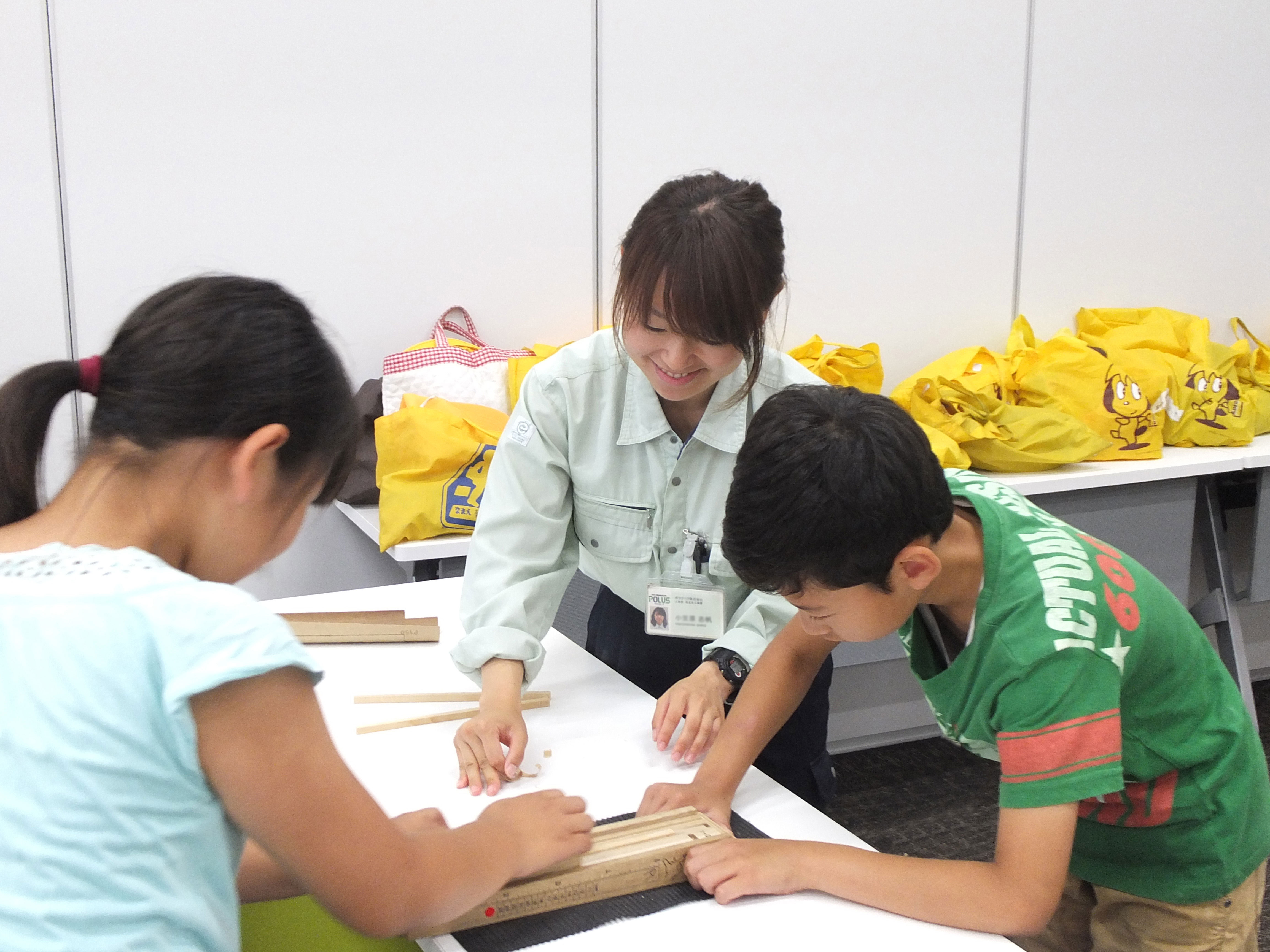 木工体験に木の学習を掛け合わせた、木を扱う企業であるポラスグループが発案した独自の小学生対象の学習プログラムです。(1)自ら感じさせ、考えさせる。(2)自ら興味を惹かせる。(3)習ったことを再度学ばせる。をヒントに、「木工体験」ではカンナなどの専用工具に親しみ、木を扱う感覚、モノをつくる喜び、創造力を育みます。同時に行なう「木の学習」では、「人と木の間」という名の学習専用室にて、木に触れ、実験も行ないながら会話形式で楽しく進めます。これらの体験を通じて子供たちが木に興味を持ち、活躍してくれることを願っております。