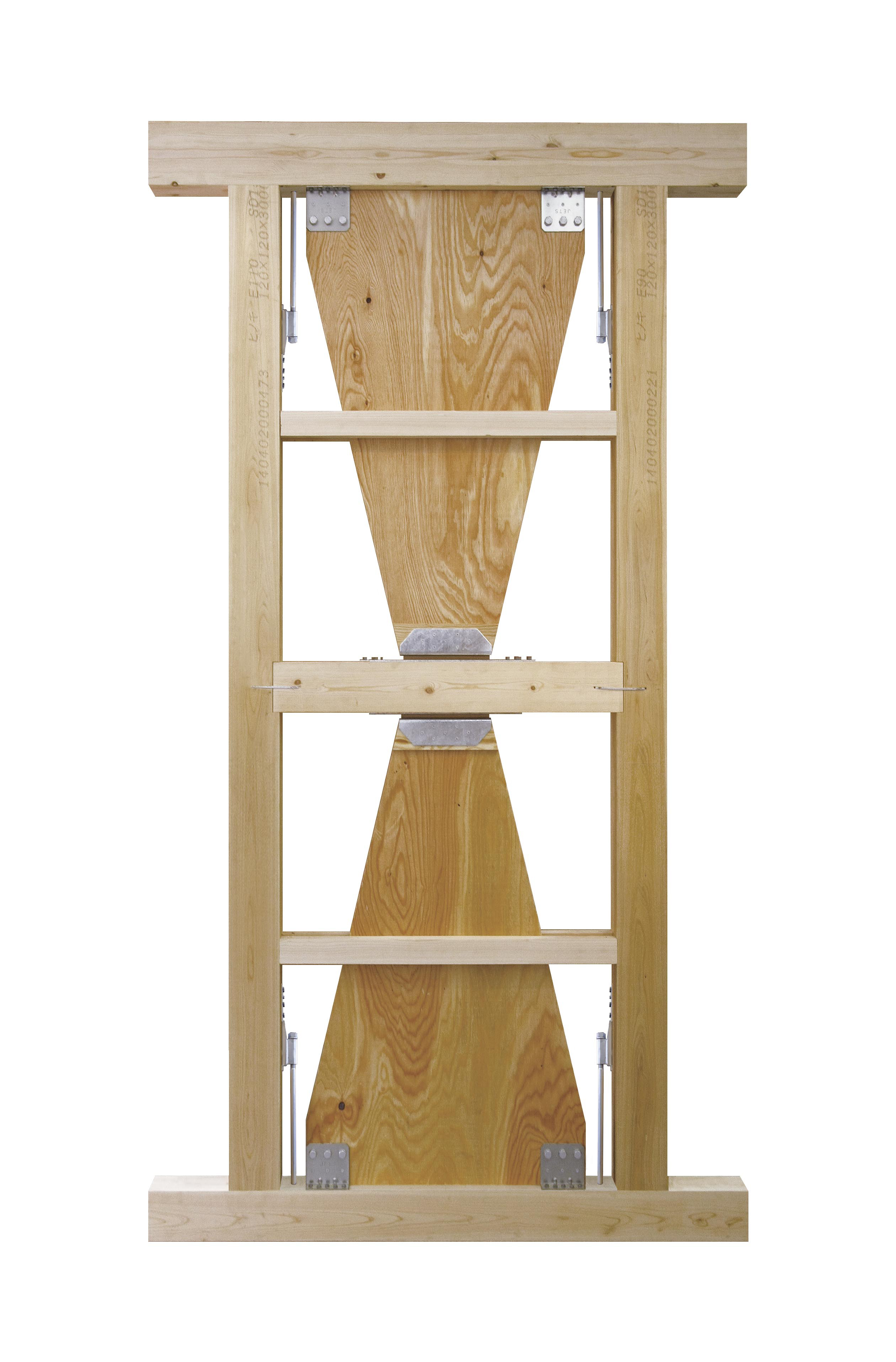 主要部材を木材としているため、製品加工に特別な工場や機械を用いず、装置の取付けも専門技術者を必要とせず、現場の施工者(大工)が一人で取付けを行えます。ダンパーに繋がる伝達パネルは構造用合板を利用し、既存のプレカット工場での加工を可能にしています。生産面・施工面でのコスト低減により一般的な制震装置に比べ安価で、建物面積が大きくなっても追加金額は発生しません。独自のダンパー形状で2013年4月特許を取得しています。
