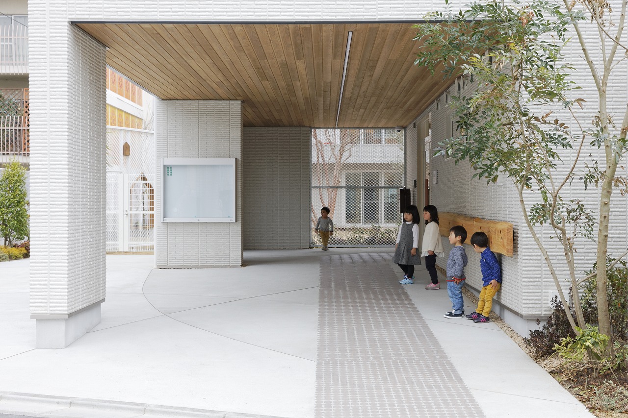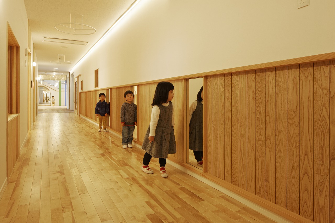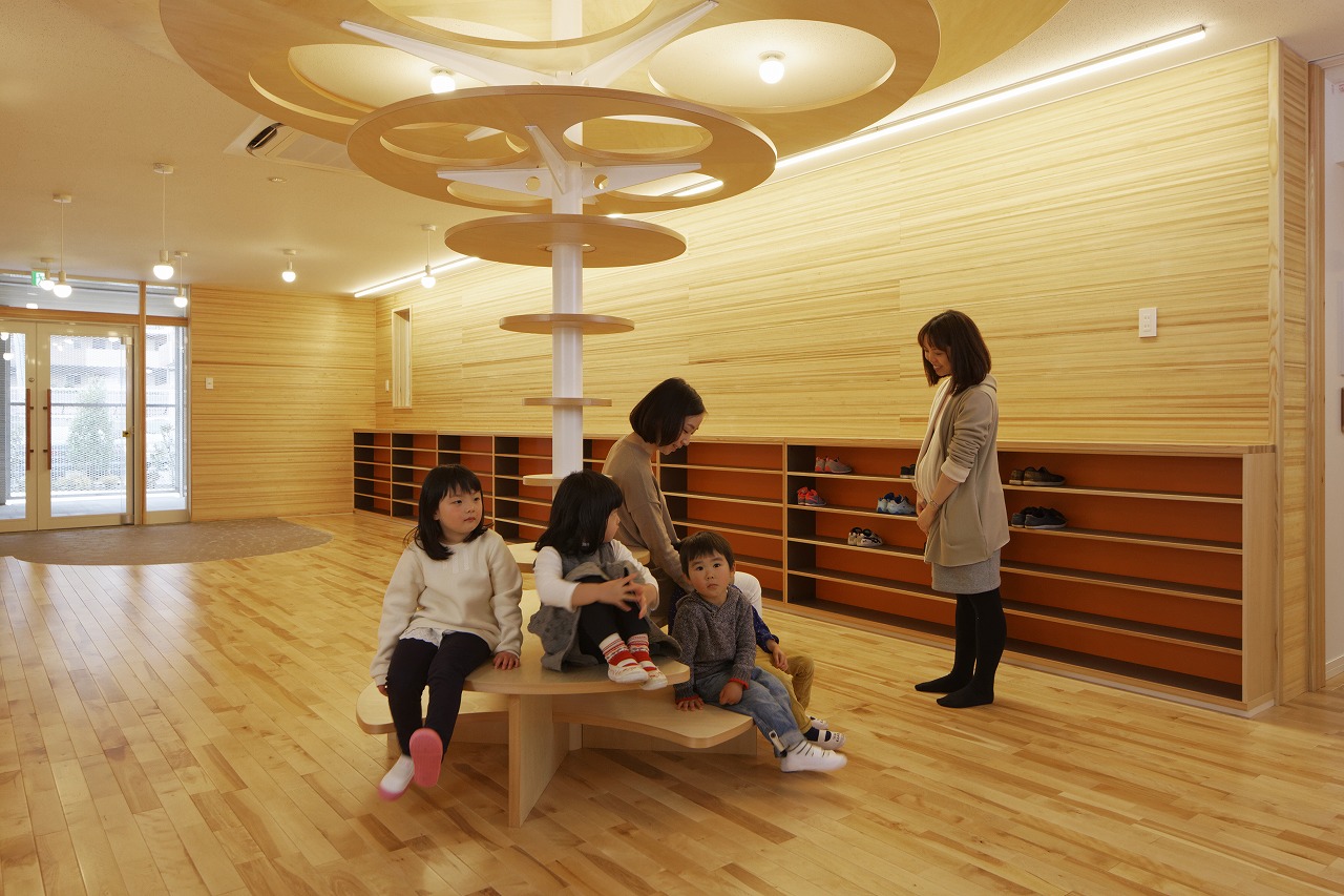 江戸時代より木材流通の重要な拠点であった木場、新木場を擁し、木との繋がりが深い江東区。そんな土地に根差す、木に包まれた園舎を提案。壁・天井には国産材をアクセントに使い、木ならではの感触の柔らかさ、色味の温かさ、木目の多様さを感じられる。そのような空間を通して、豊かな五感と心を育む場としている。