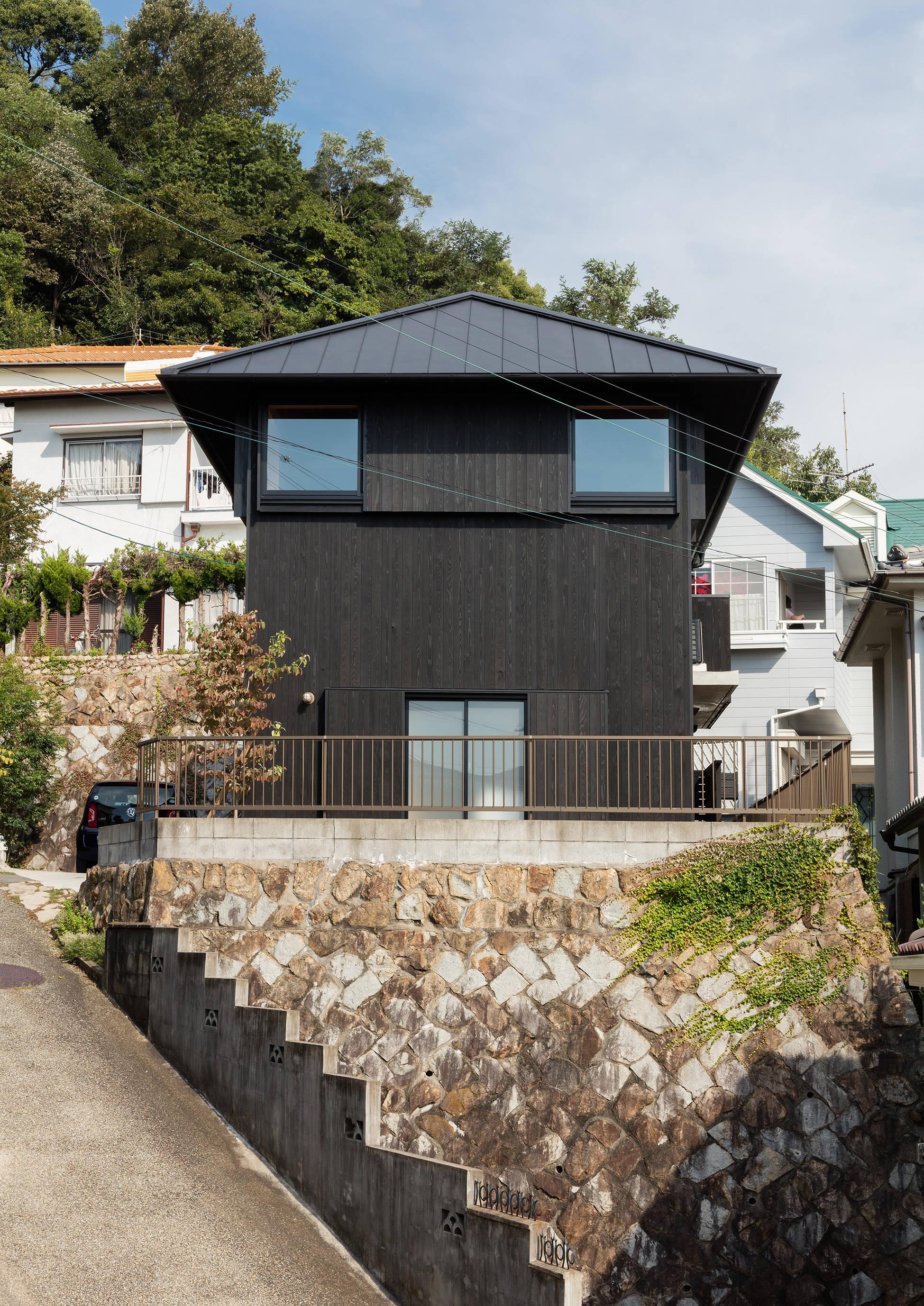 外観が目を引く杉板で、重厚感すら感じさせる。傾斜地という条件をむしろ逆手にとり、環境とのつながりや眺望に活かしている。