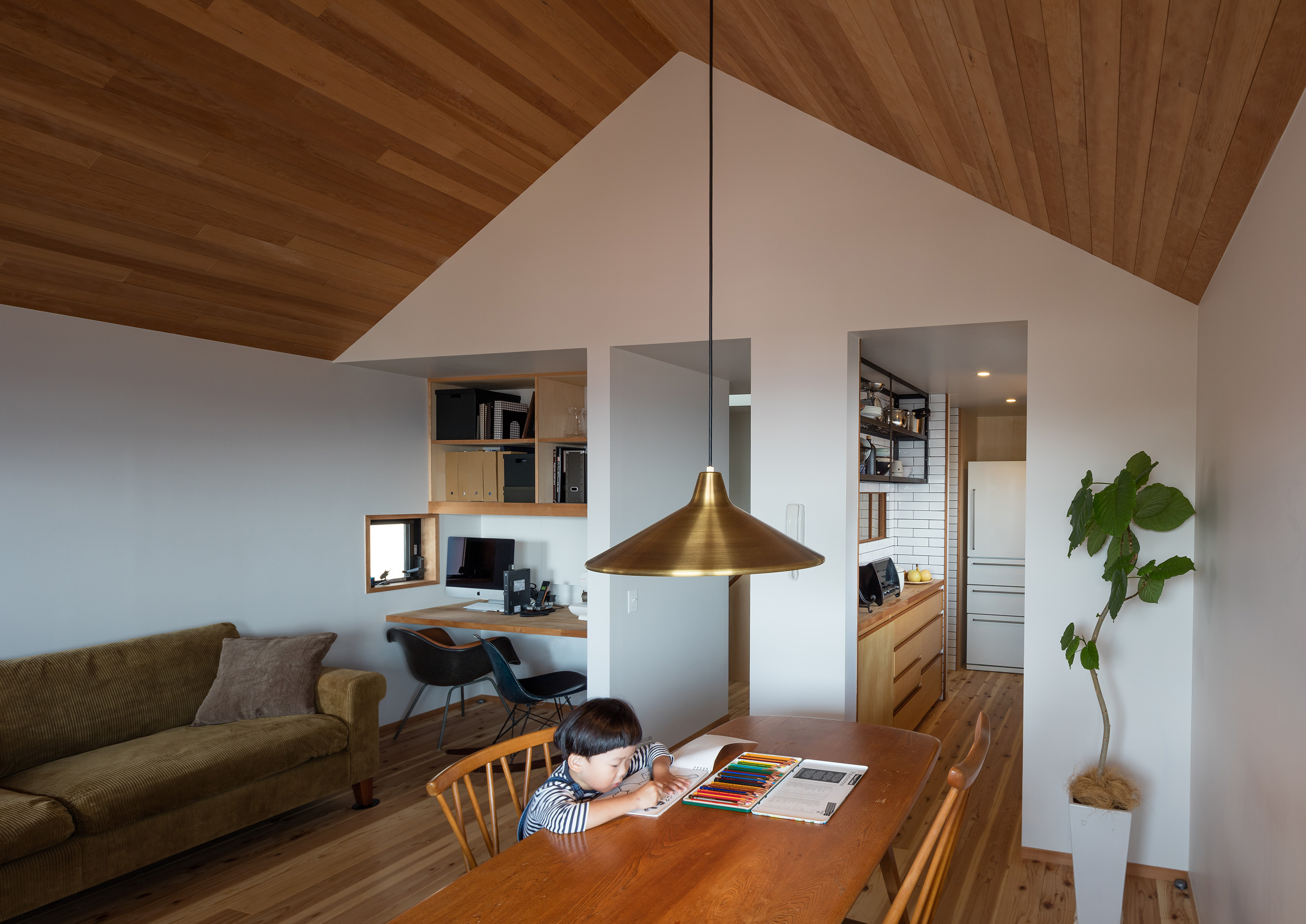 屋根を寄棟、外壁を杉板で包み建物をコンパクトにまとめた。傾斜地に沿う建物配置で建物の形状や外壁の杉板は背景林に馴染む。2階ダイニングリビングは天井、床、窓、カウンターと木が感じられるようにした。コーナーに設けた窓は隣地の建物が視界に入らず南前方に広がる大阪平野まで眺望を得ることが出来る。
