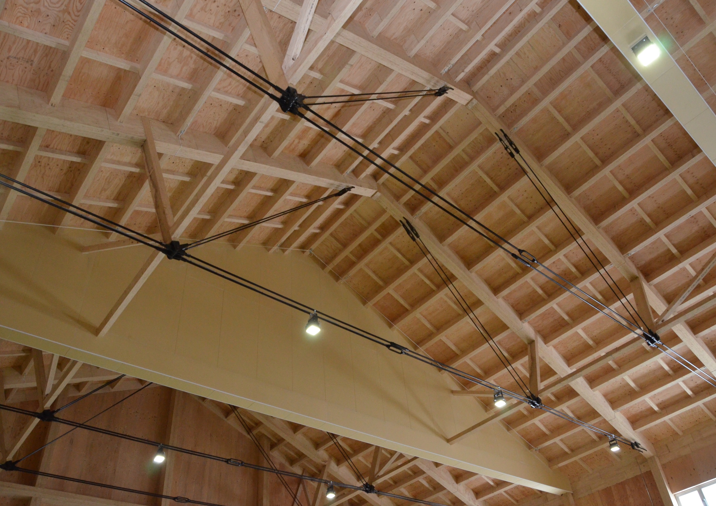 地元地域の間伐材などで製造できるオロチLVL。大型施設を持たない地域のプレカット工場、工務店であっても一般流通材を使用し無柱大空間建築物を建築できるHSトラス構法。この2つを用いることによって地域の森林の保全・活用と地域経済の活性化、地域業者との連携を積極的に行い、株式会社オロチ第2工場を建築した。
