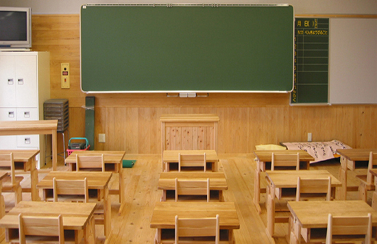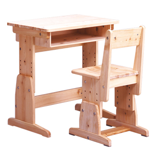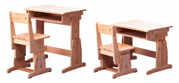 ピッチ調整で長く使える、スクール用の机と椅子。頑丈なイメージを伝えるデザインで、パイプを使った主構造のものが主流のなかオール木製は価値が高い。