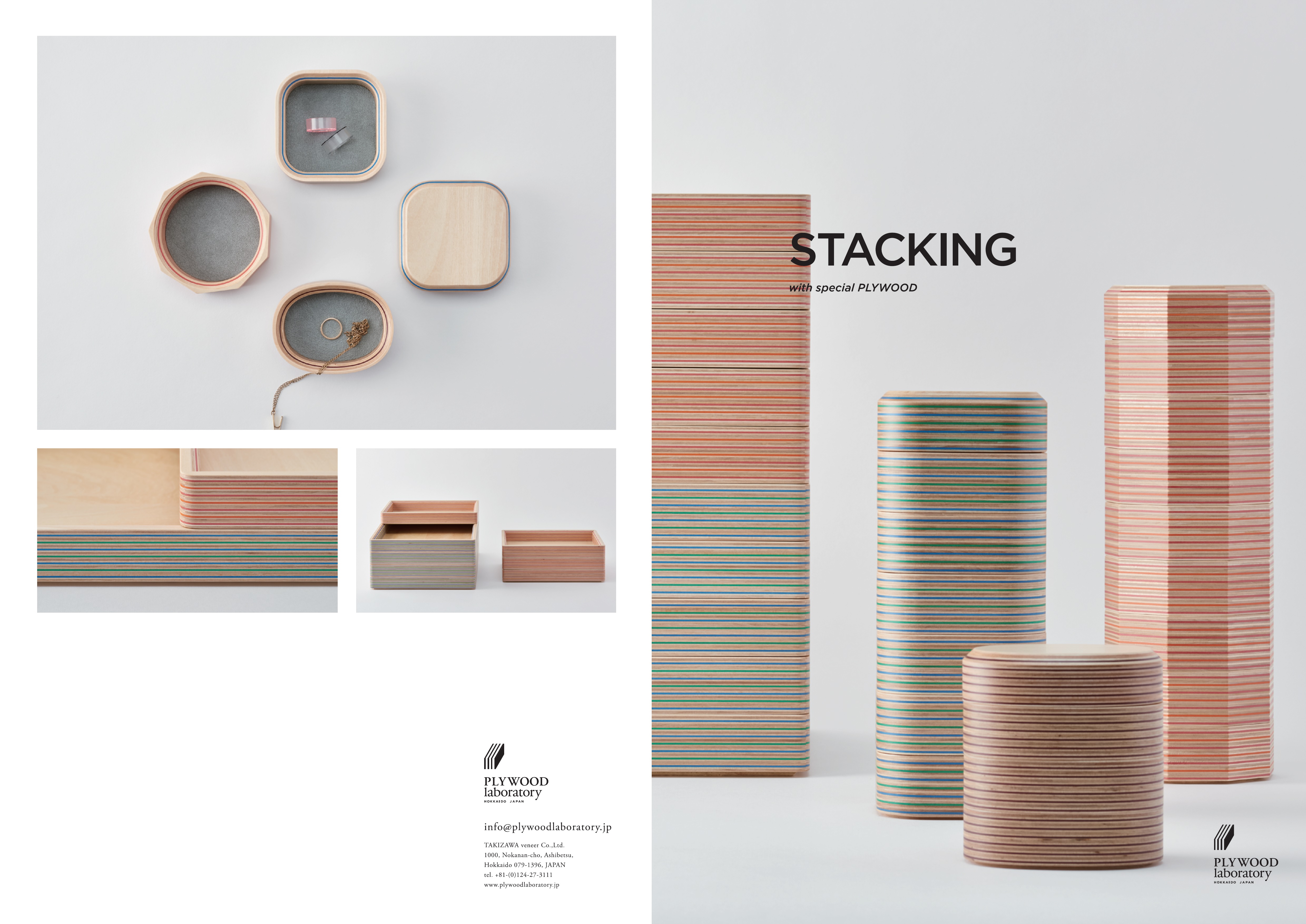 カラフルな再生紙とシラカバ間伐材、北海道のシナの小径材などを貼りあわせた特徴ある合板を使った小物入れ。スタッキングした際の意匠性が面白く、海外でも受け入れられそうなデザインである。