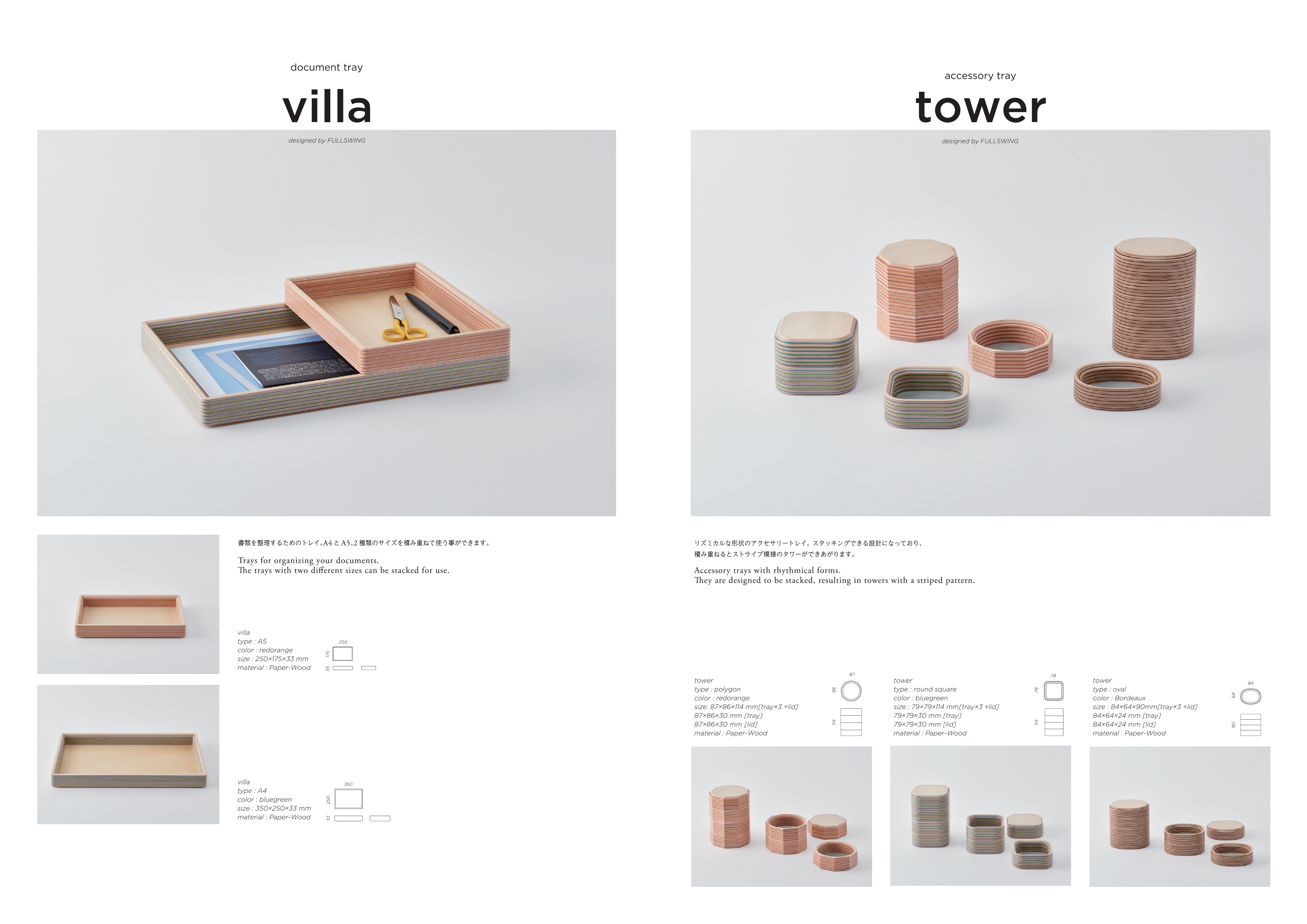 従来の合板の常識を覆し、木口断面が美しく、デザイン性が高い新しい合板。カラフルな再生紙と木材でできた新しい合板。そのペーパーウッド合板を使った今までにはない雑貨。接着剤がノンホルマリンで安全。今まで使われていなかったシラカバ間伐材、北海道のシナの小径木などを利用。