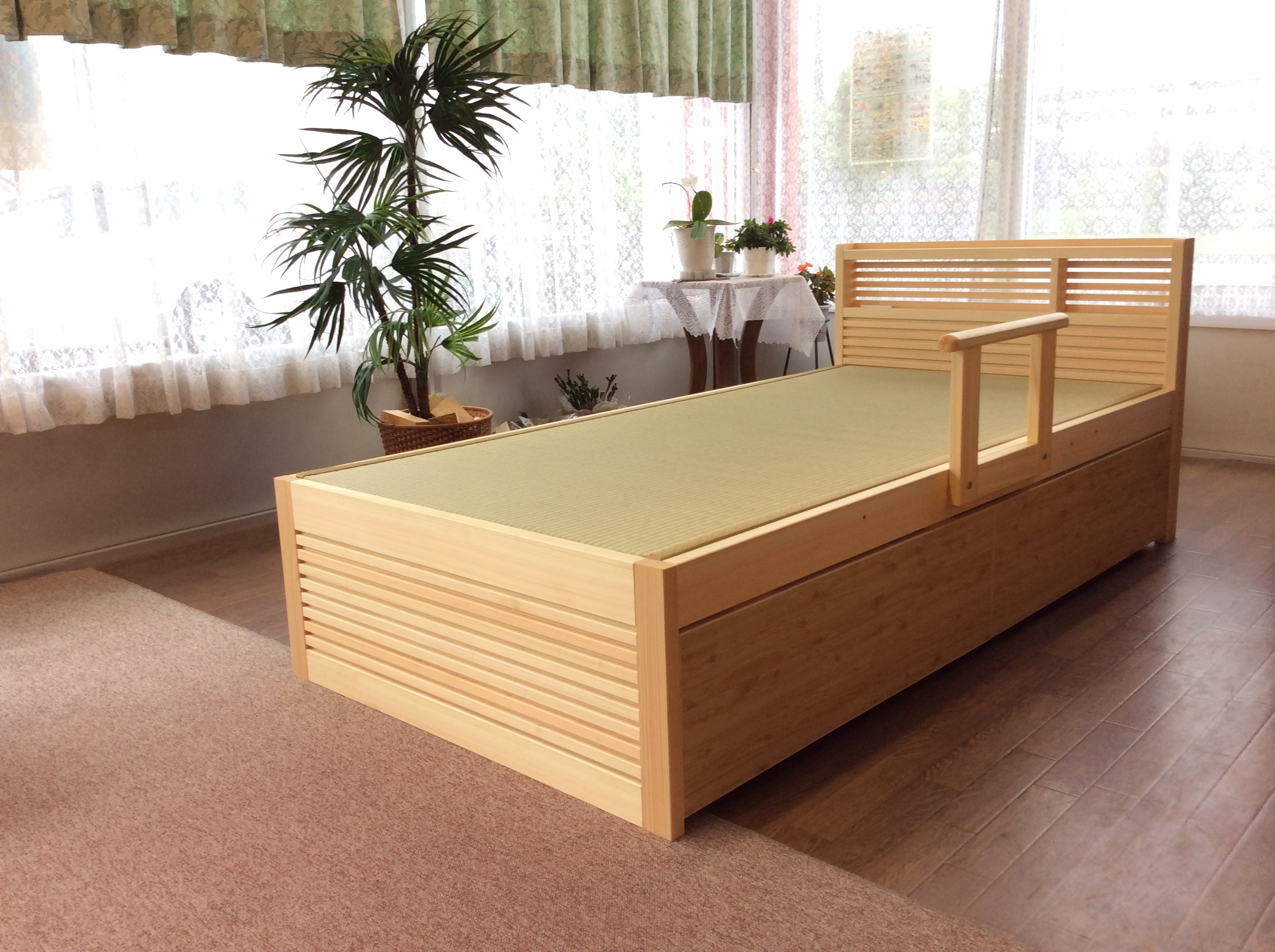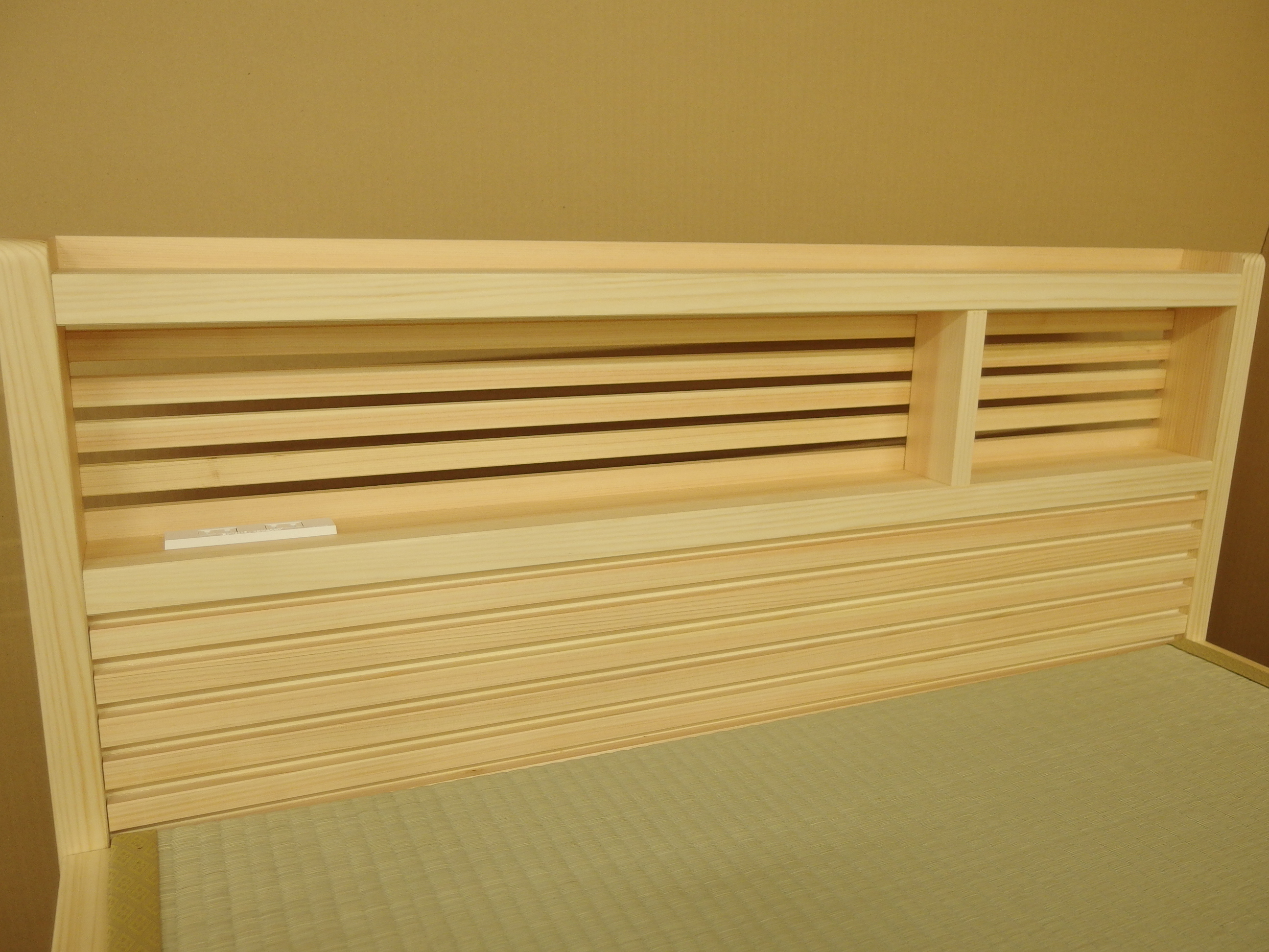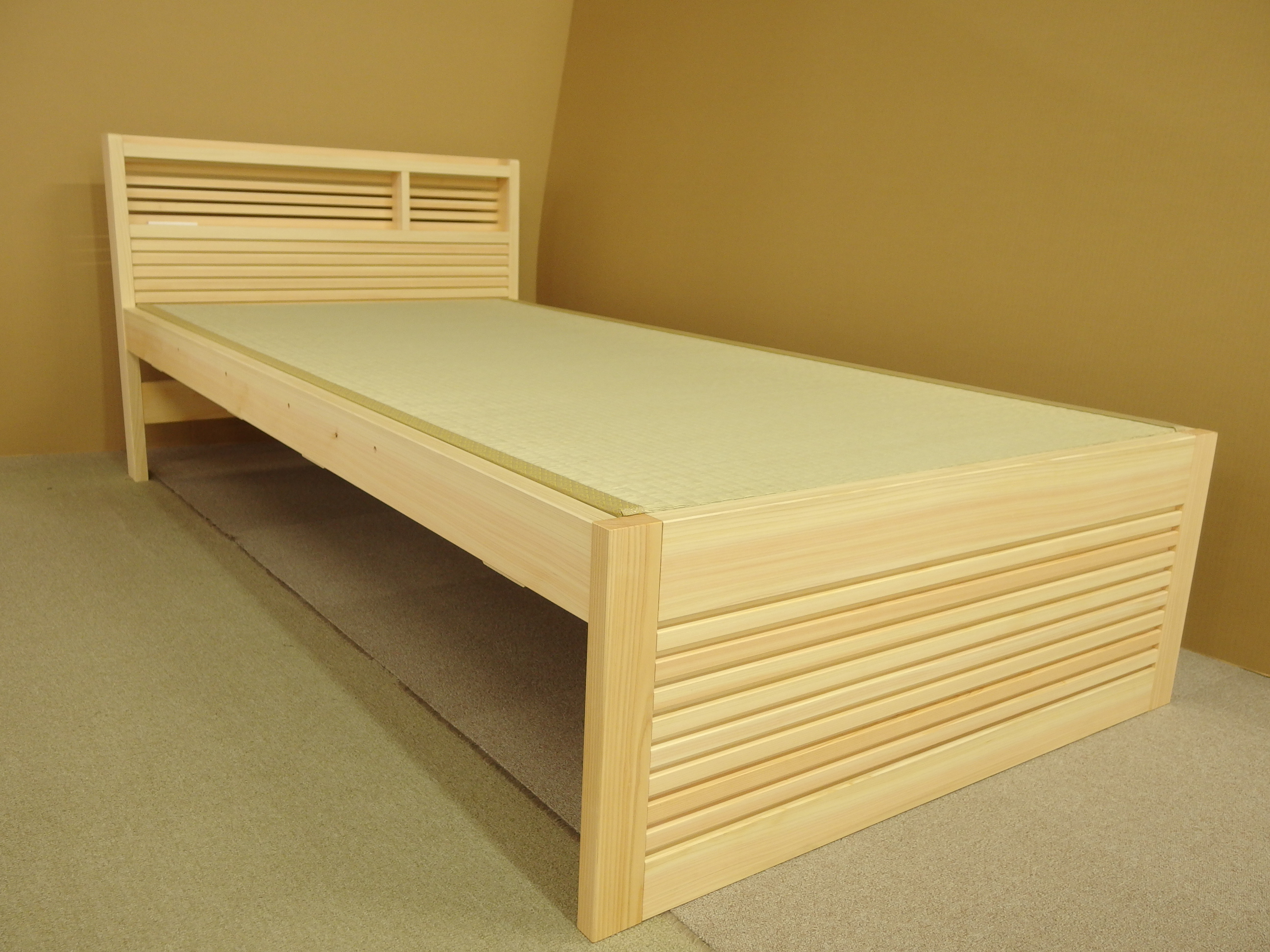 ヒノキ材と畳を使用した和風ベットです。ヒノキ材の香りと畳の風合い、その組み合わせにより、リラックスして睡眠へと導きます。ヘッドボードに欄間を使用することにより、通気性がよく、部屋に設置した際開放感があります。オプションで、手すり、引き出しもつけることも出来ます。