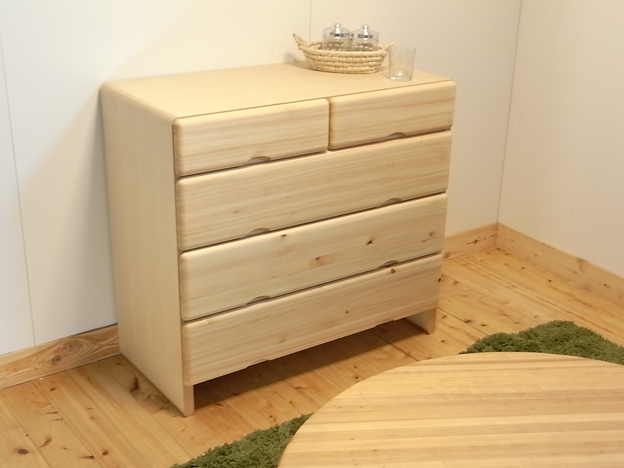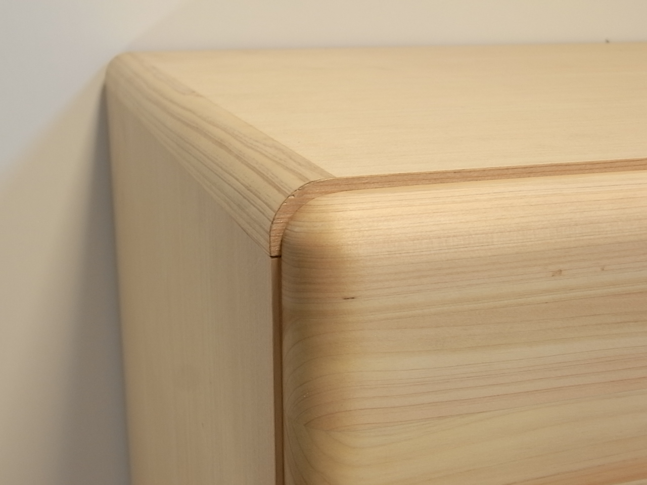子供用衣類収納タンス。角を丸め、取っ手などの出っ張りをなくし、衝突事故などの防止へ配慮し、家庭内利用での安全性を高めた。植物由来のオイルをベースにした天然塗装で、赤ちゃんがなめたりした場合も安心である。