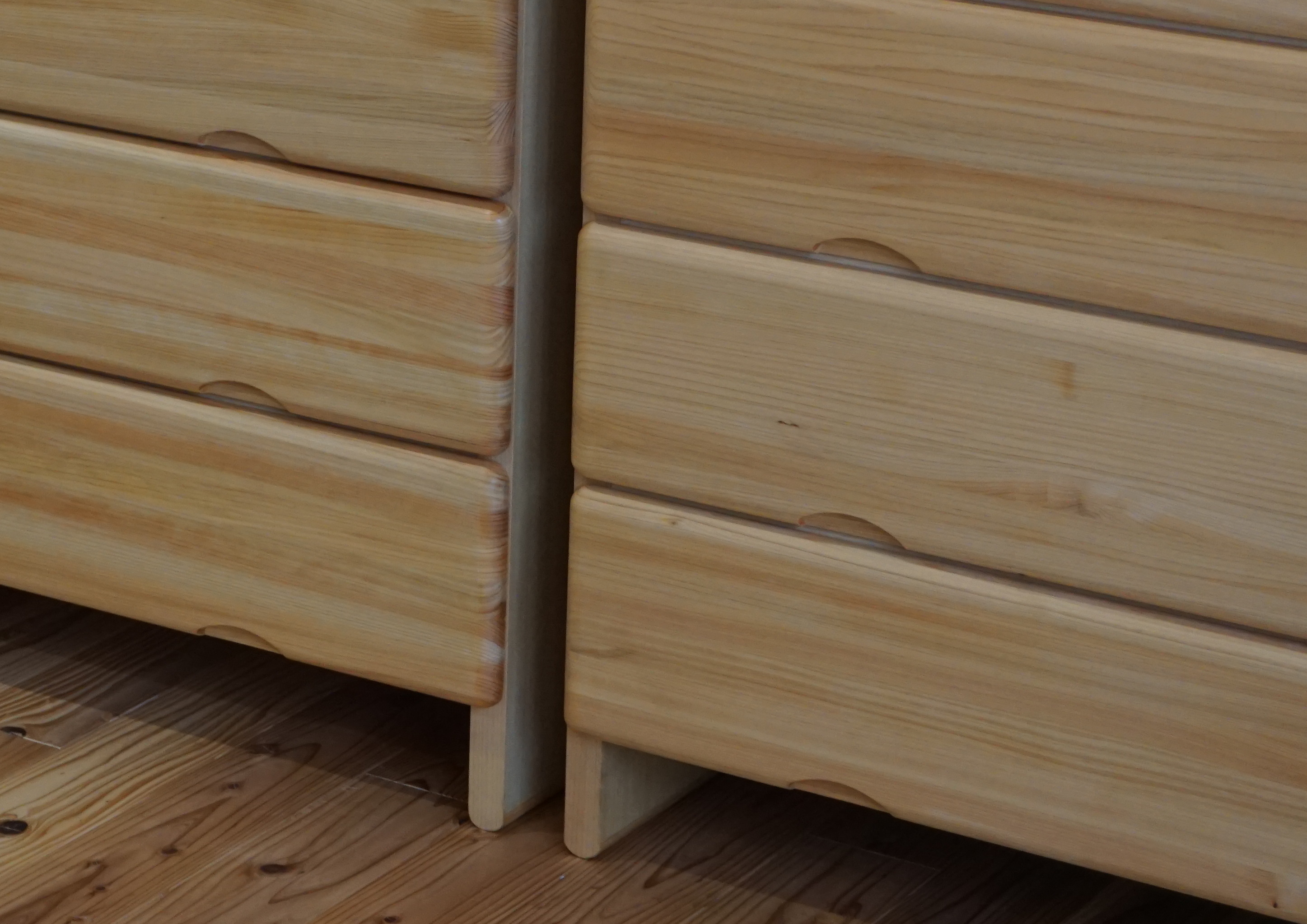 純国産チェストというだけでも安心ですが、さらにヒノキ材という防虫防菌作用のある材を使用し、化学物質の心配だけでなく、角を丸めたりレールを廃したりと打撃系の心配も少なくなるように考えられたチェストです。小さいお子様をお持ちの方や、脚が不自由なお年寄りの方にお選びいただいています。