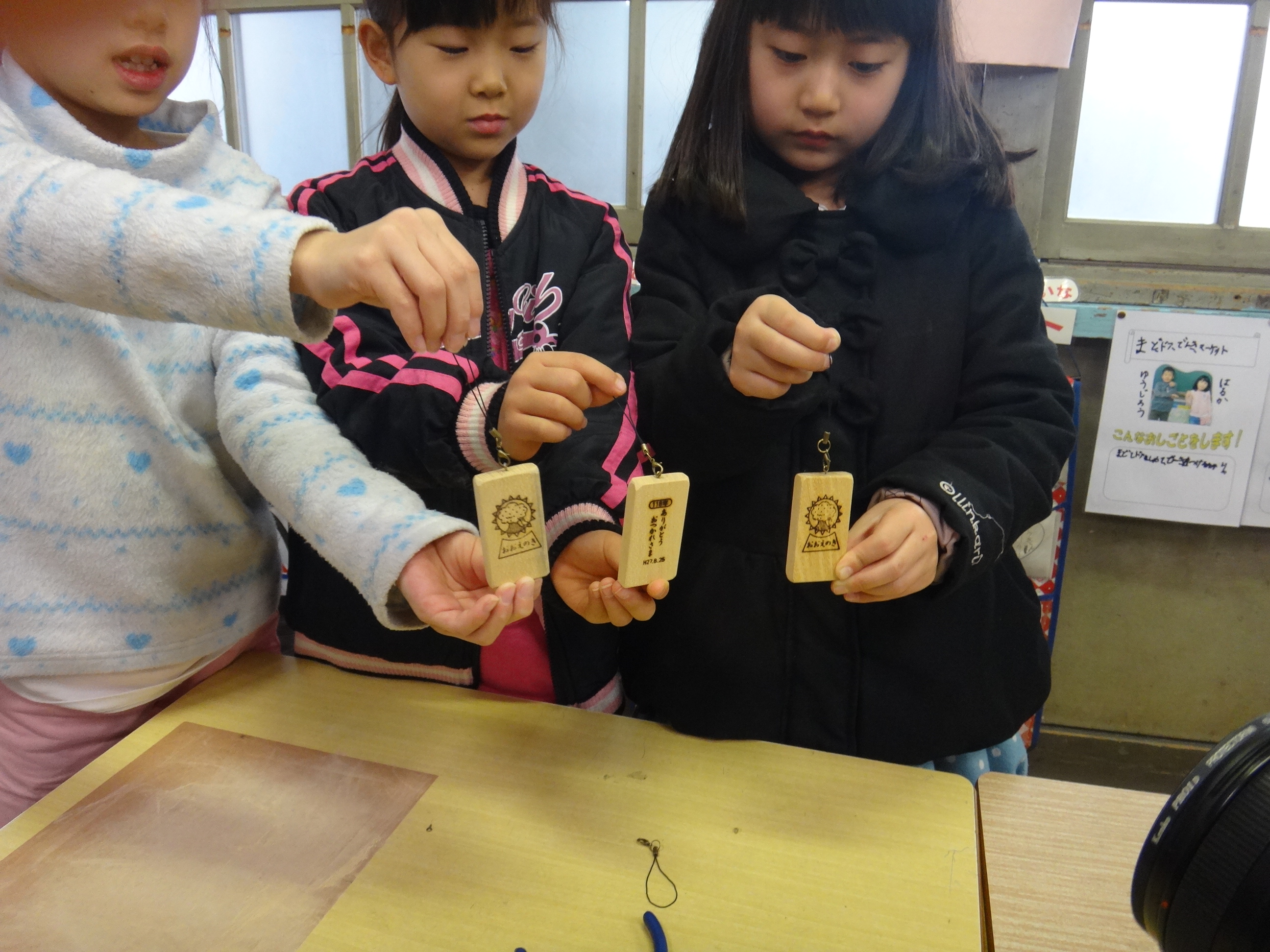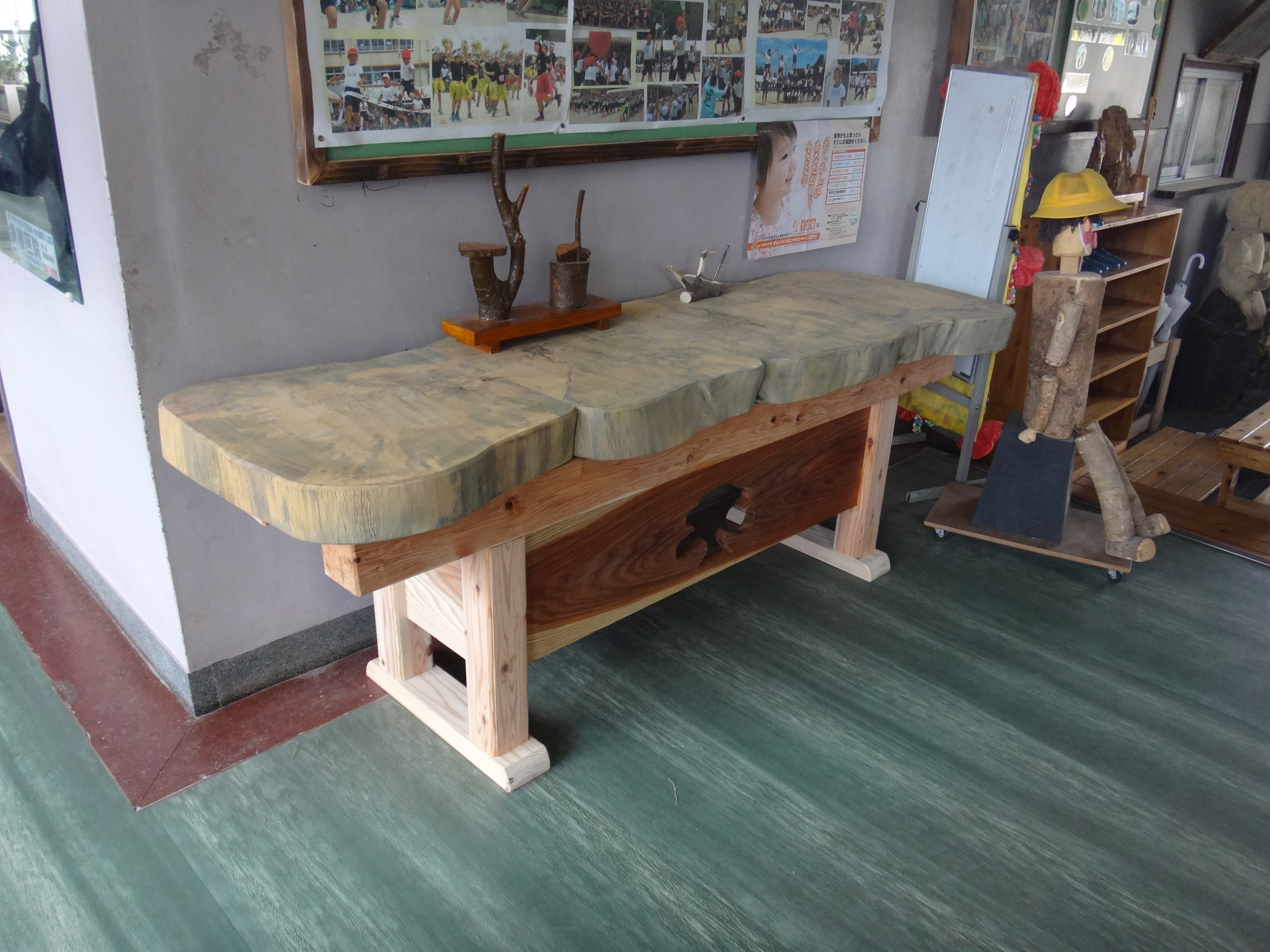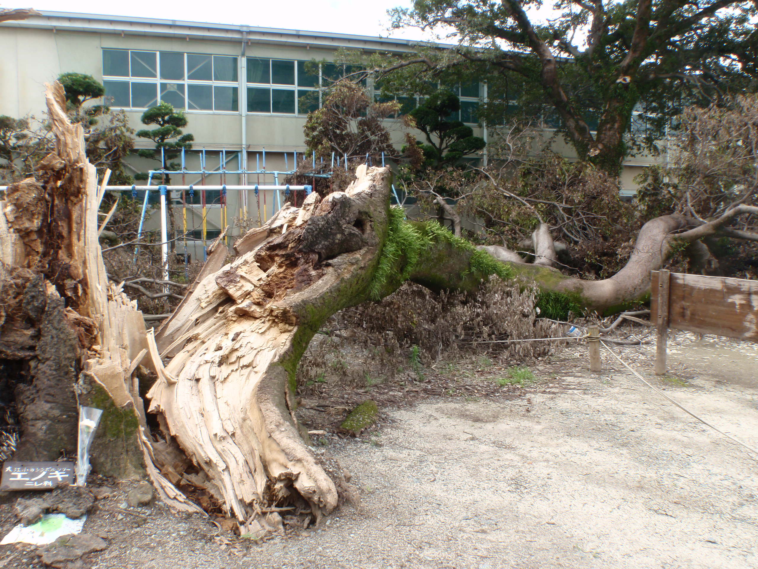 台風で倒れた「おおえのき」の思い出を大切にするとともに、木の果たす役割や木材の素晴らしさを子ども達に伝える木育授業を実施し、並行して、思い出の「おおえのき」に子ども達が触れることができるようにと、ストラップや机などの製作を行った。 今後も学校の木や市町村木、県木などを用い木に親しむ機会を増やしたい。