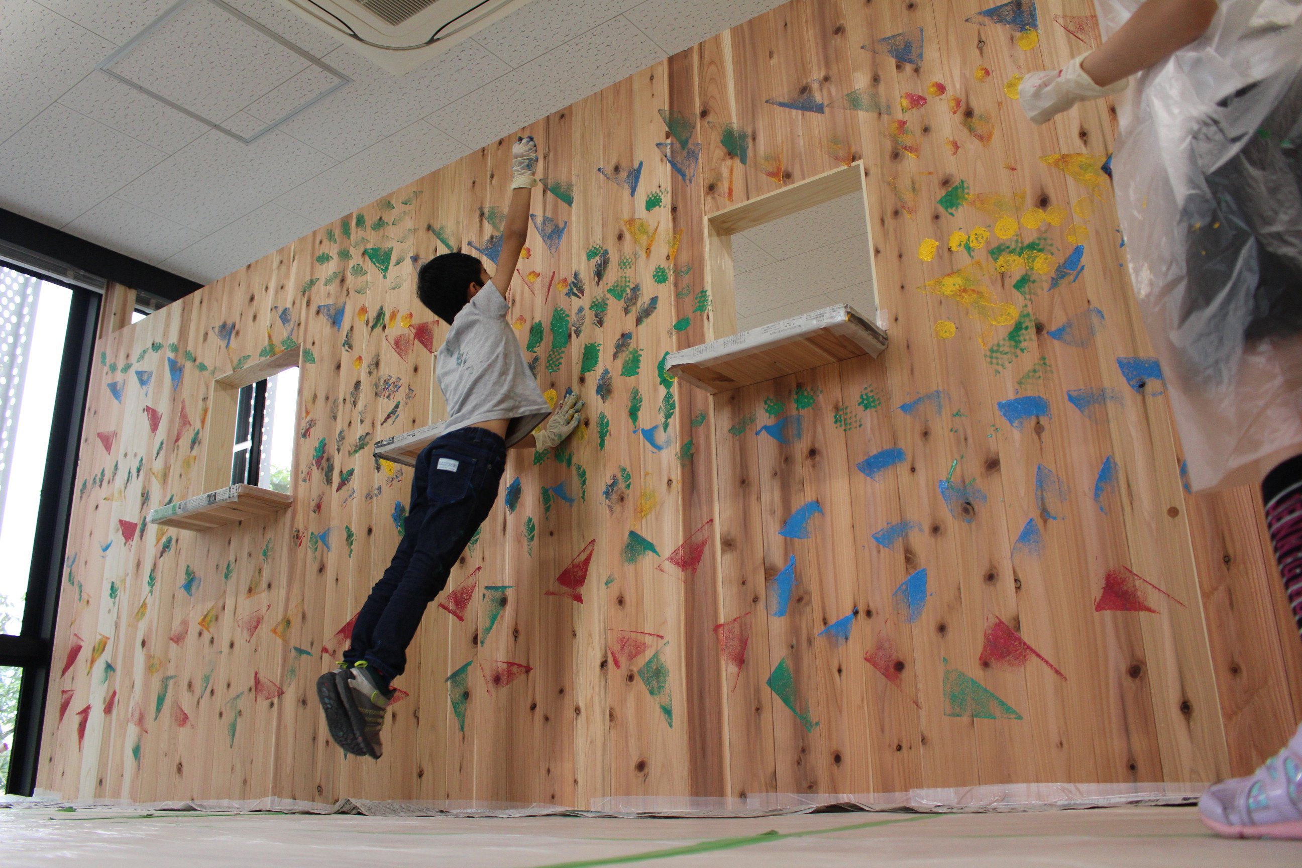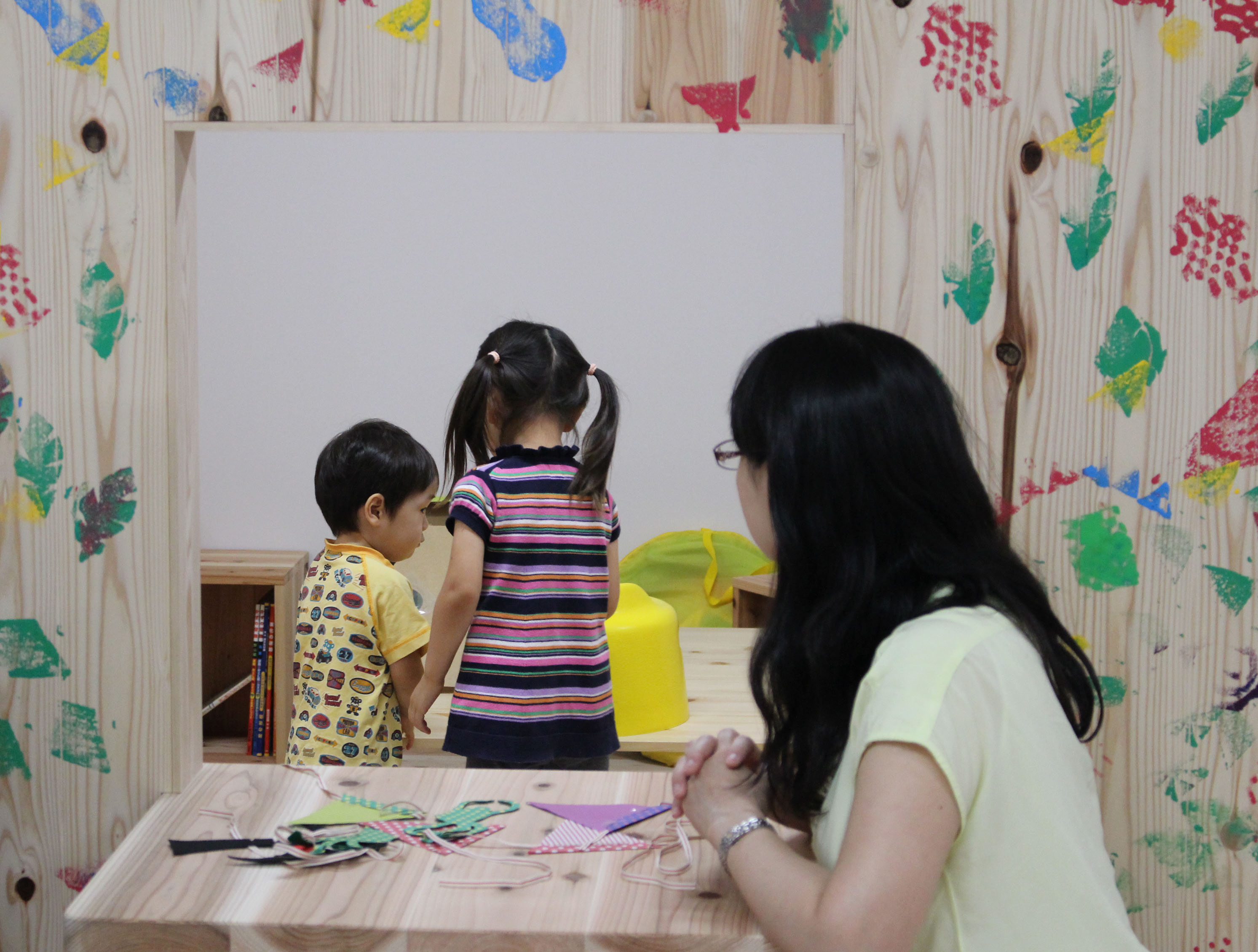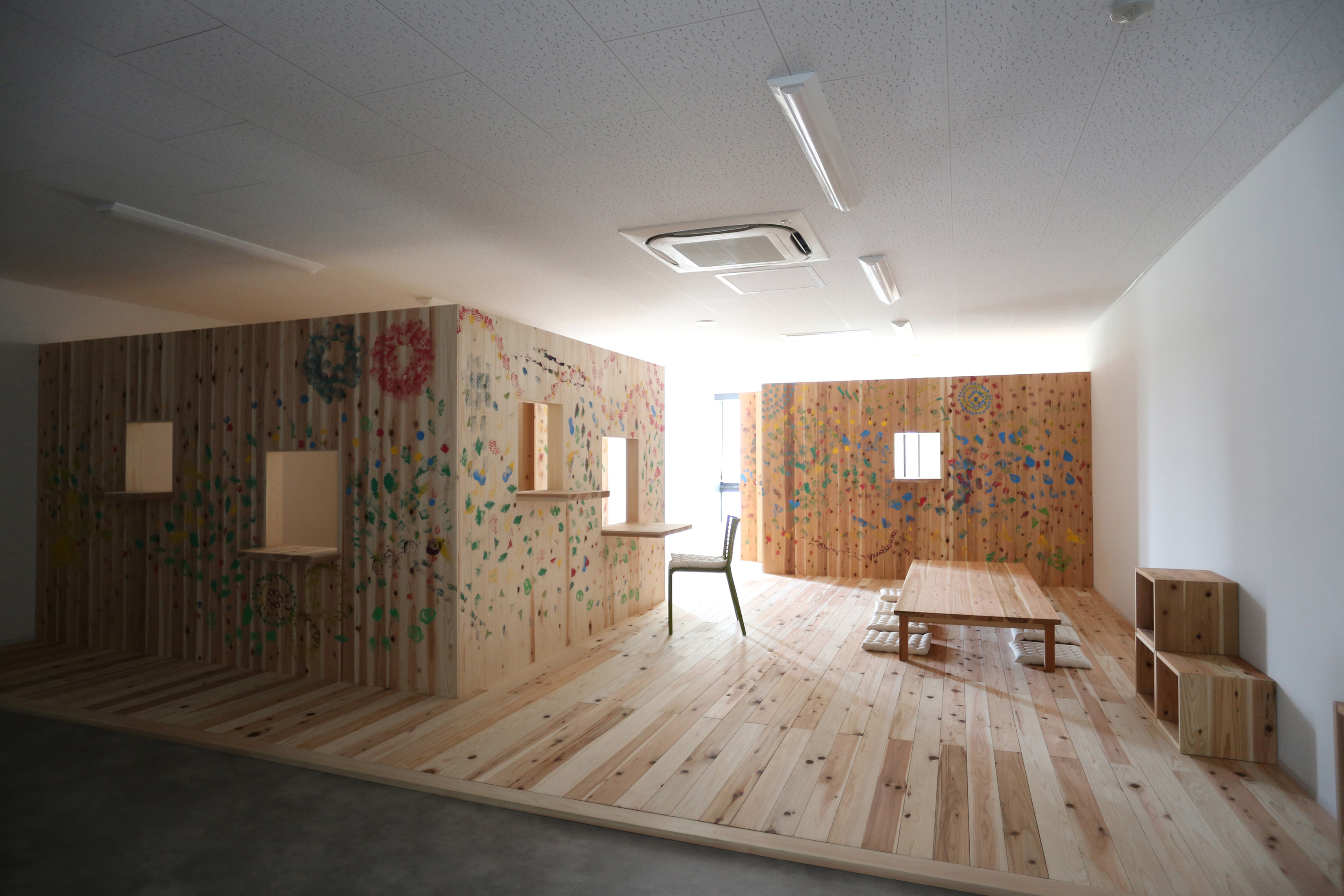 「子どもと居ながら働く」というワークとライフのあいだの空間を考案し、課題発見のための子連れワークショップから、事例調査、設計、施工、運用ルールづくり、開設後のワークショップや利用状況調査まで一貫して取り組んだのが、名古屋大学多世代共用スペースである。研究棟の100m2の部屋を用い、愛知県産の2m短尺杉材を有効活用、学生教職員のセルフビルド、利用者親子のペインティングにより2015年6月に完成。子どもを連れての仕事や打合せ、交流ができる空間である。
