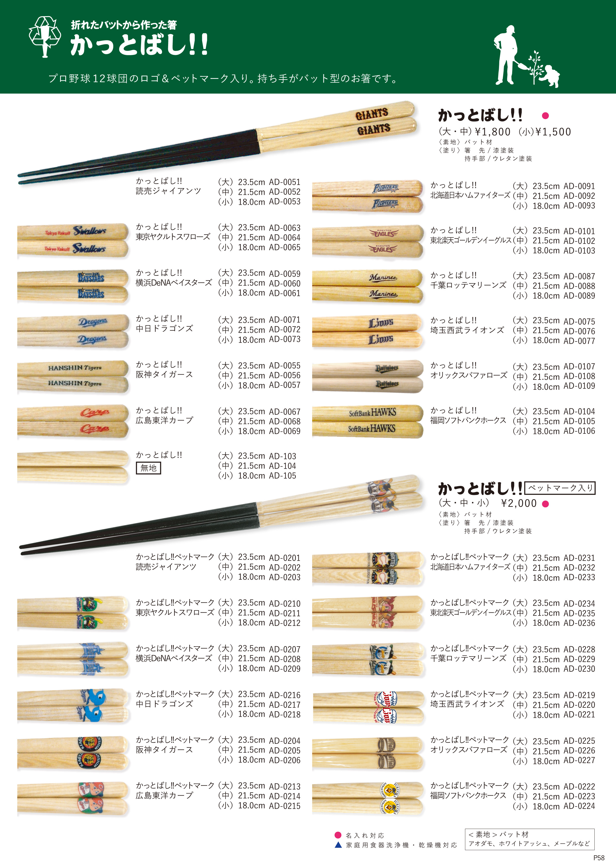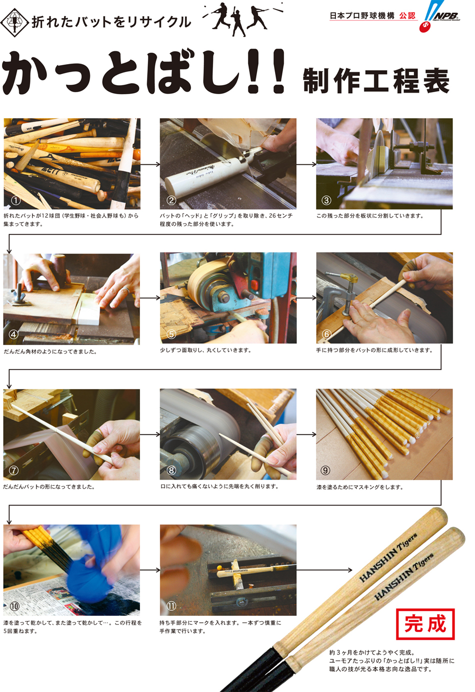 プロ野球、社会人野球などで使用され折れたバットを回収し、再製品化したのが「かっとばし!!シリーズ」。売上げの一部は「NPOアオダモ資源育成の会」を通じ、アオダモの植樹、育成に使われ、未来の国産バットを作る活動に参加しています。