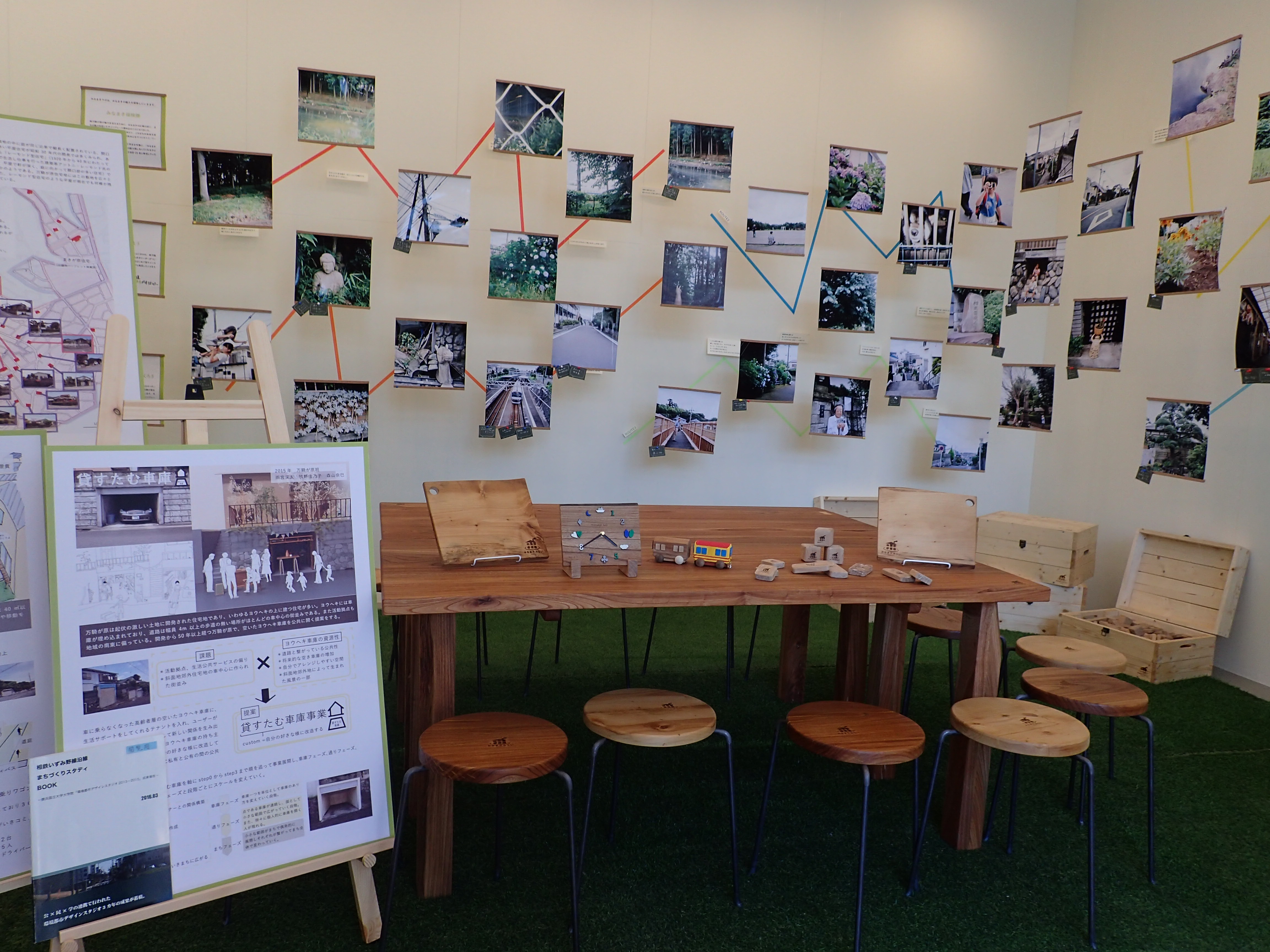 南万騎が原駅の再整備では、街路樹を伐採せざるを得なくなりました。そこで、これらの樹木は、地域の方々に「みなまきラボ」で、新たに活用してもらうテーブルや椅子に生まれ変わると共に、子供たちとこの木で、時計や電車を作りました。街路樹の利活用を介して、地域の方々と、新たな街づくりへ一緒に取り組みました。